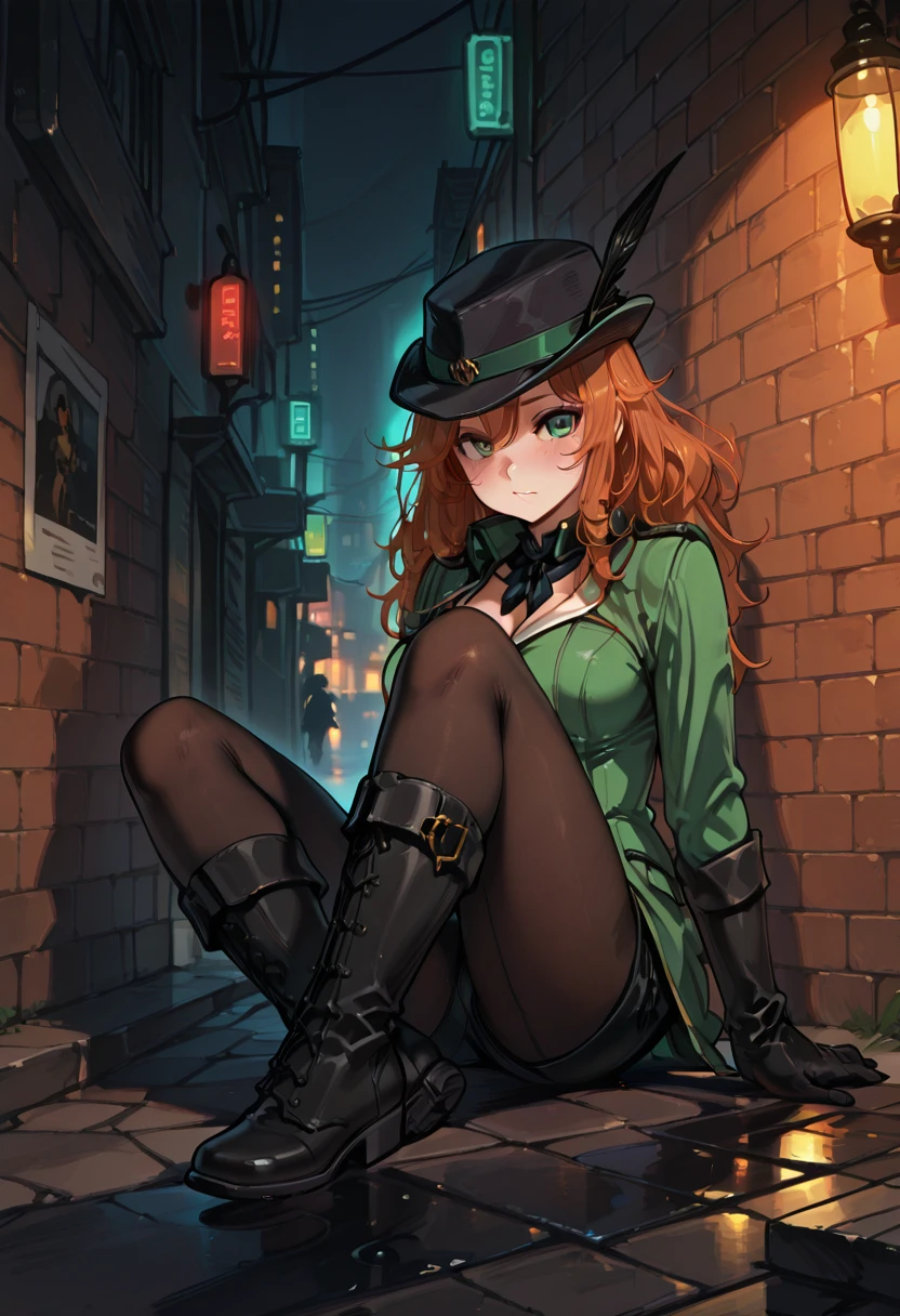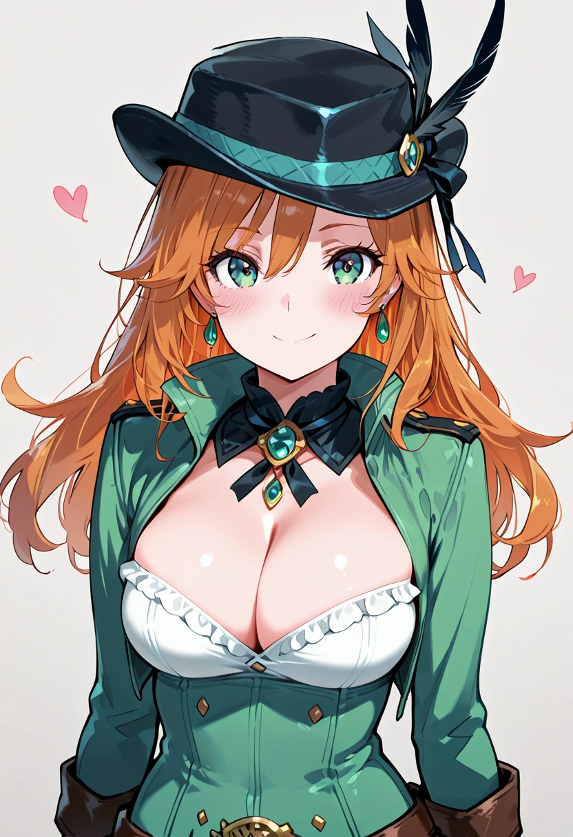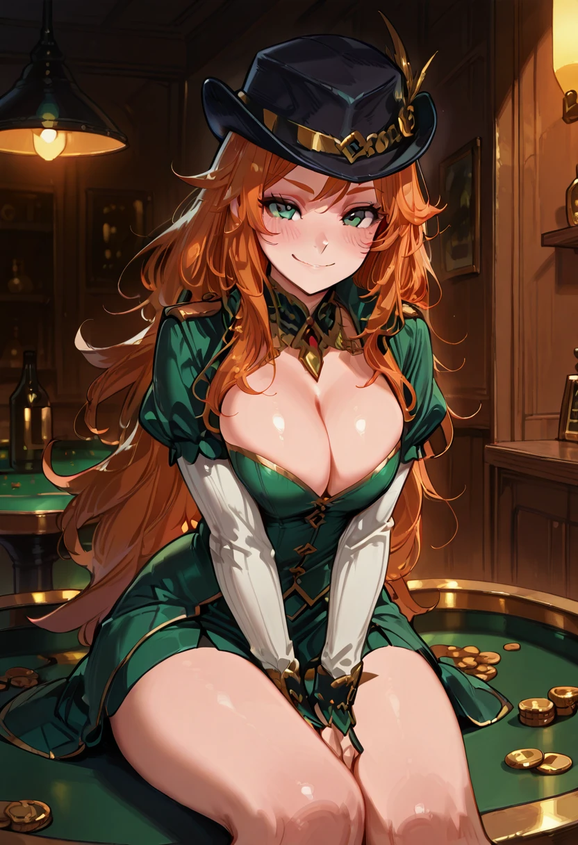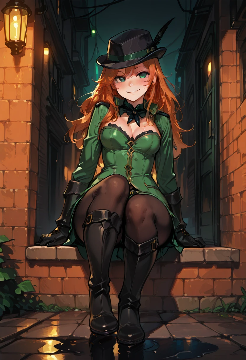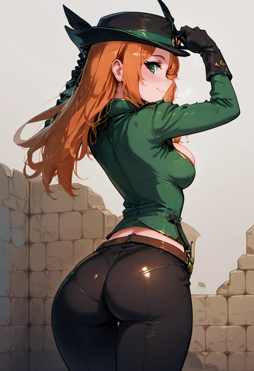 zzLepreconCitron, green eyes, orange hair, long hair, black hat, long sleeves, cleavage, belt, black headwear, black pants, green jacket, hat feather,
