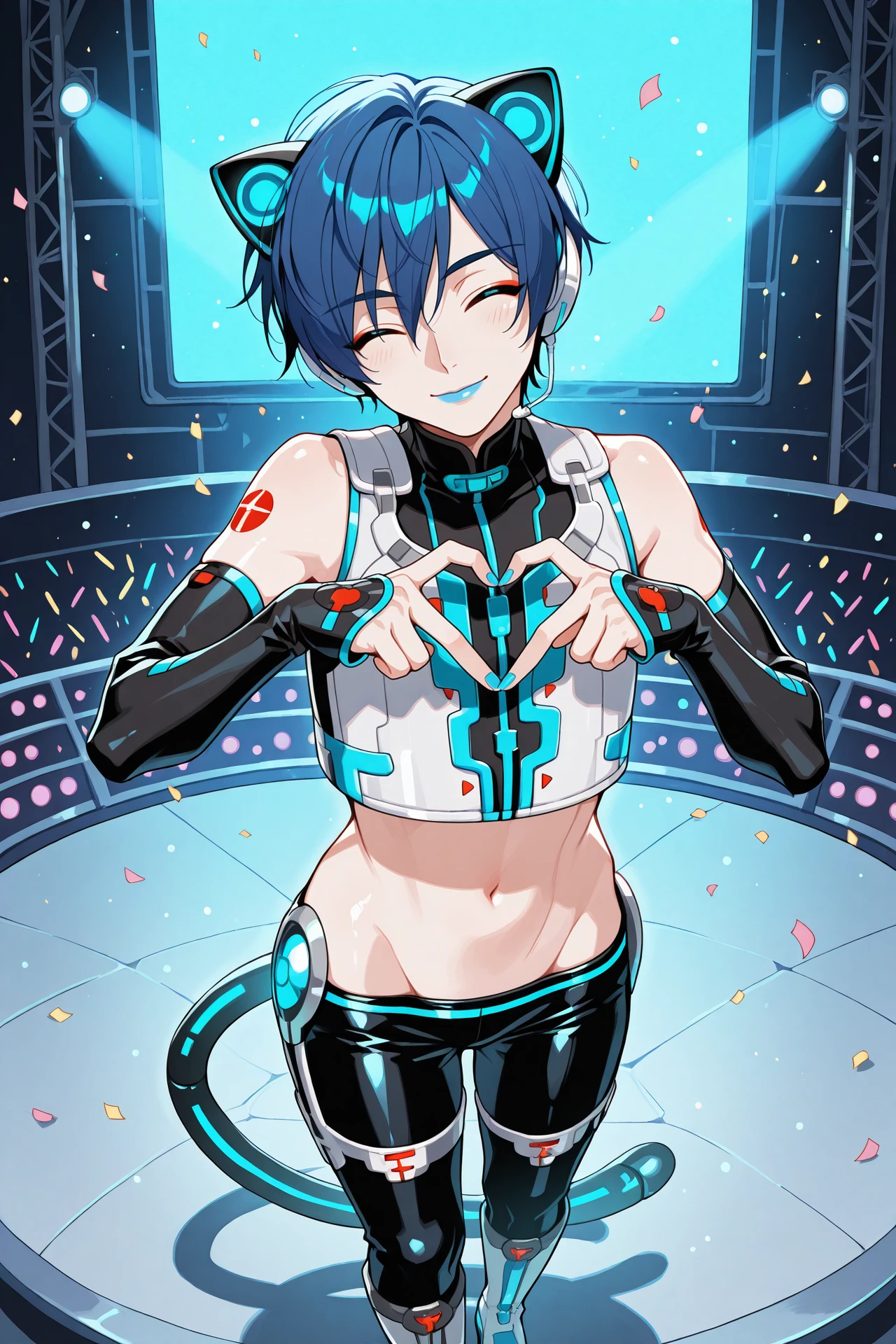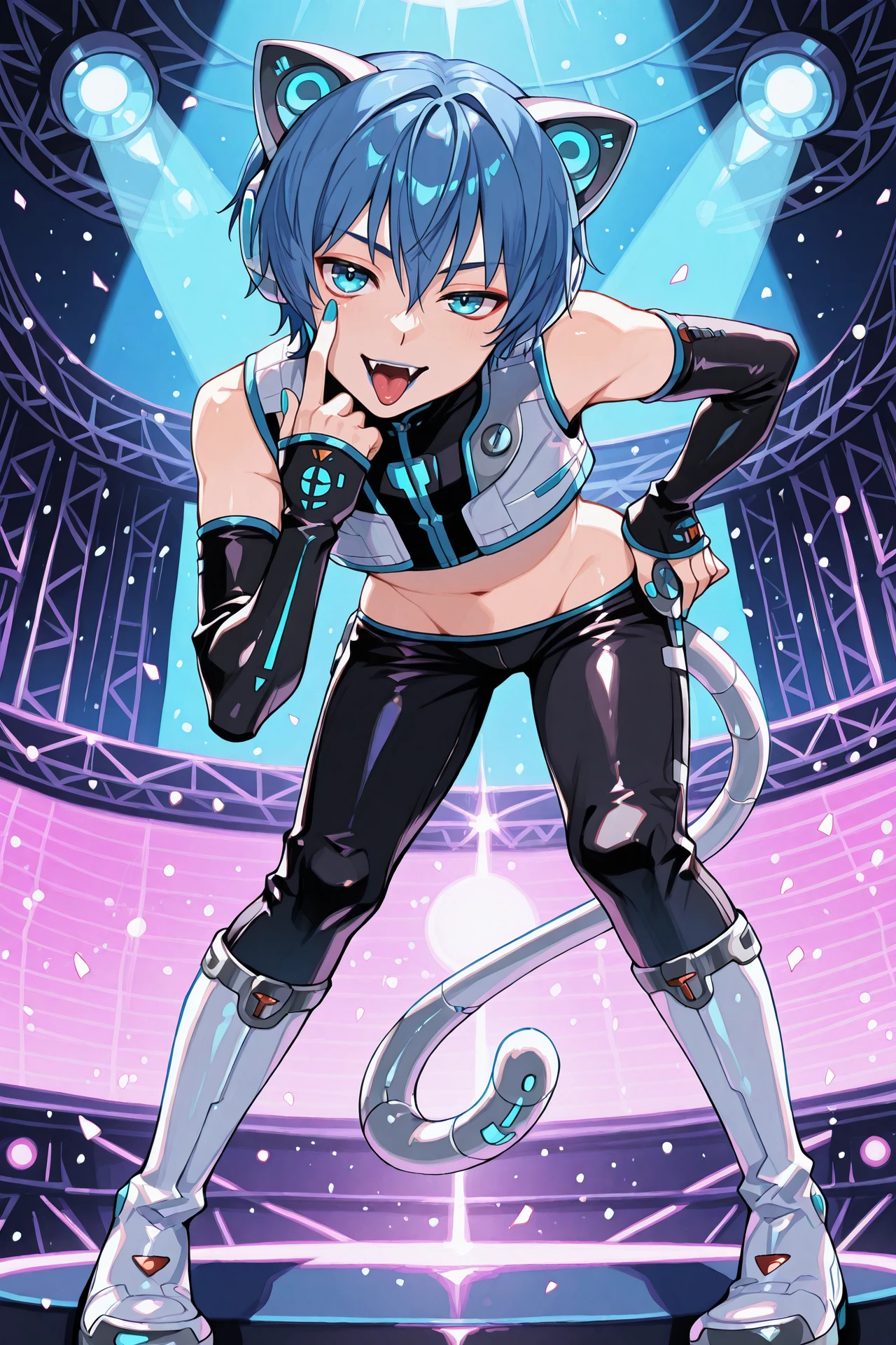 Facial prompt: 1boy, cybercat, bishounen, blue eyes, short hair, blue hair, cat ears