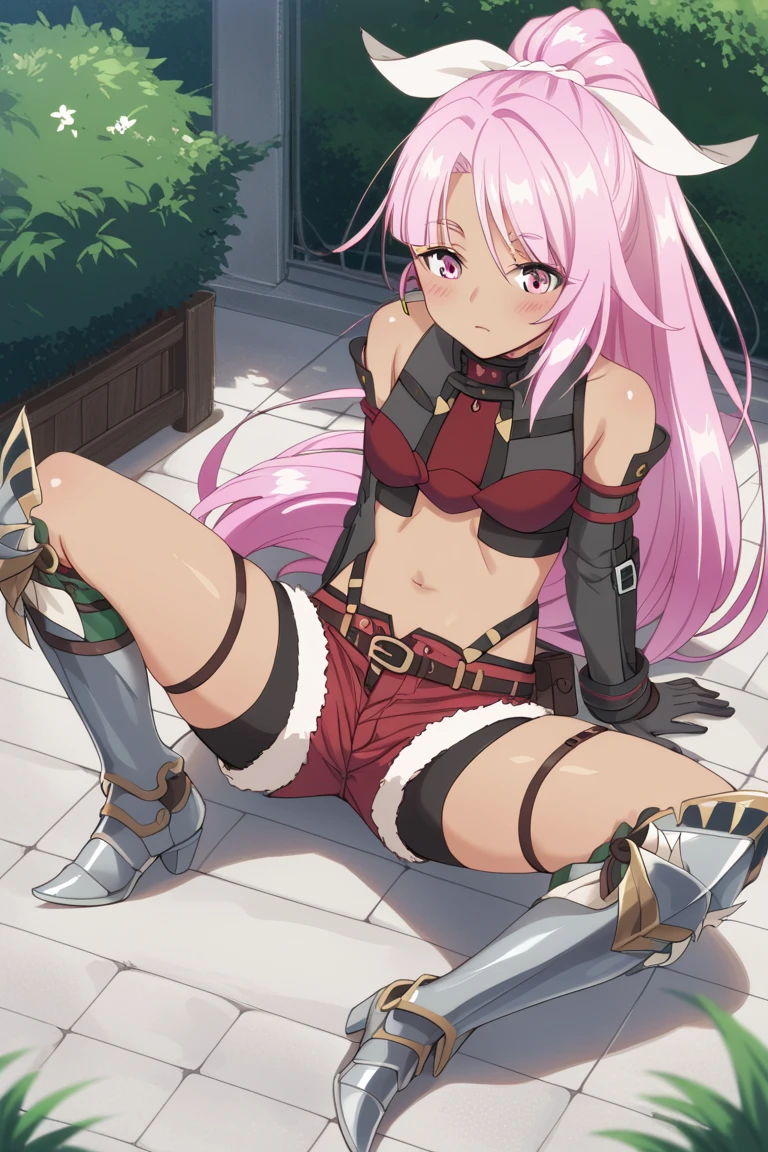 smart_liz, long_hair, ponytail, pink_hair, pink_eyes, hair_ribbon, bare_shoulders, jewelry, dark_skin, gloves, midriff, detached_sleeves, armored_boots, red_shorts, fur-trimmed_shorts, thigh_strap