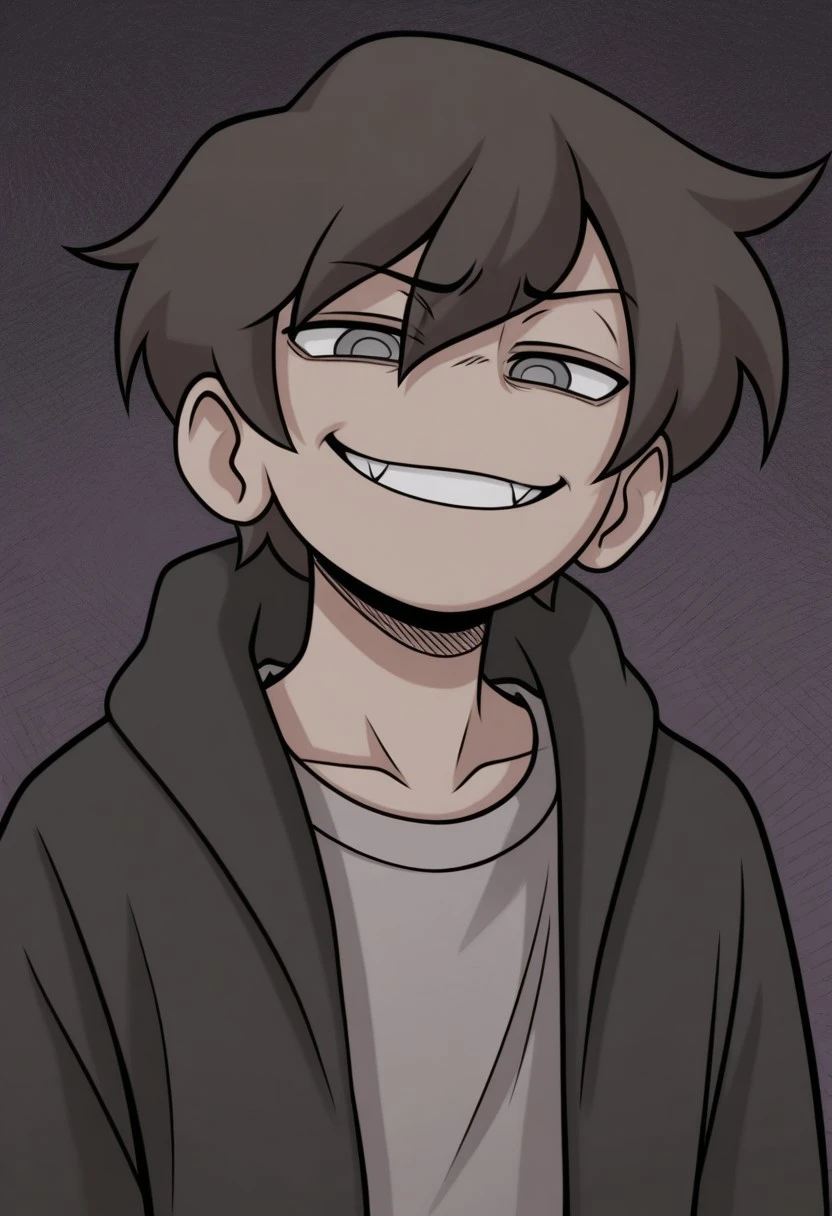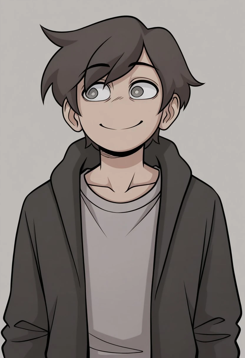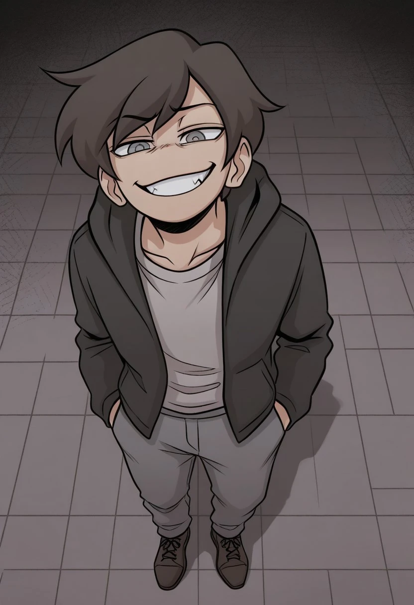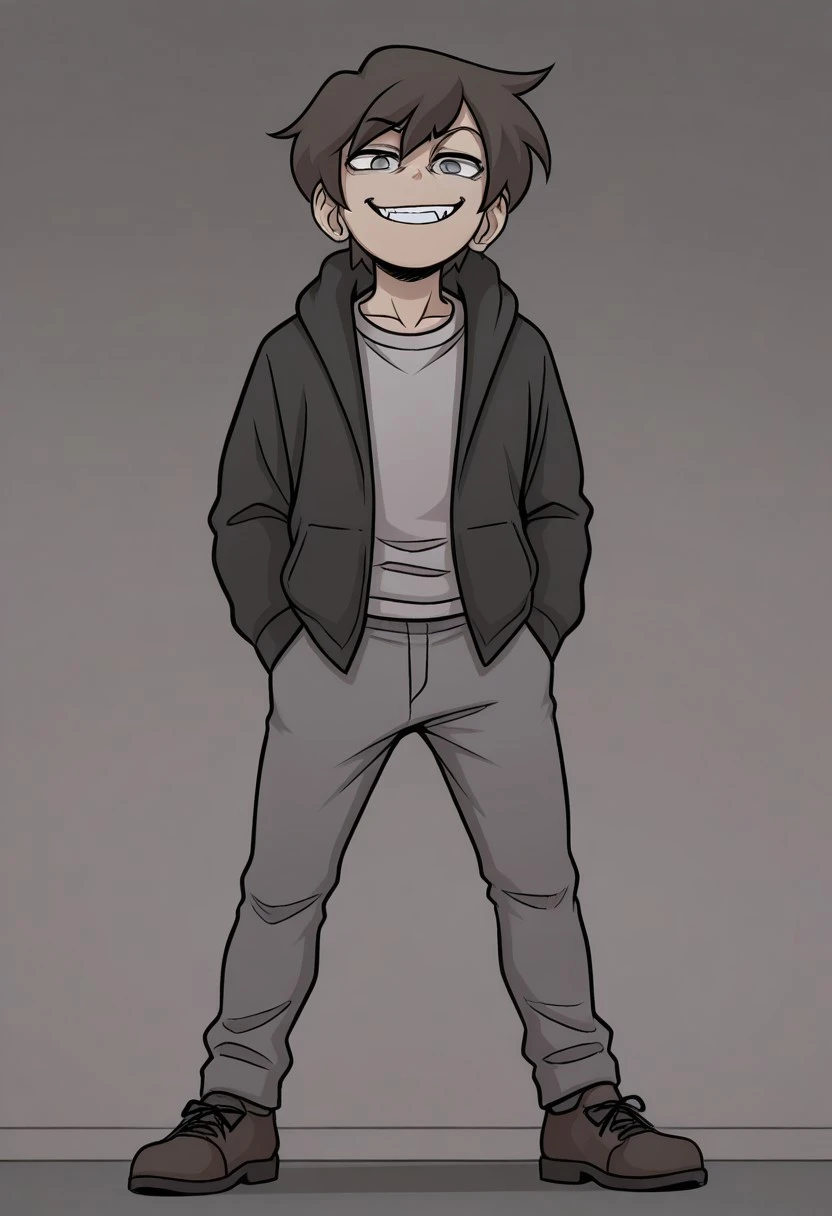 Prompt: Ben Again yt, solo, 1boy, brown hair, grey eyes, white sclera, grey pupils, dark grey jacket, dark grey hoodie, grey shirt, grey pants, brown shoes
