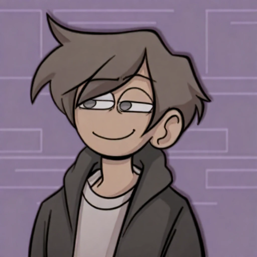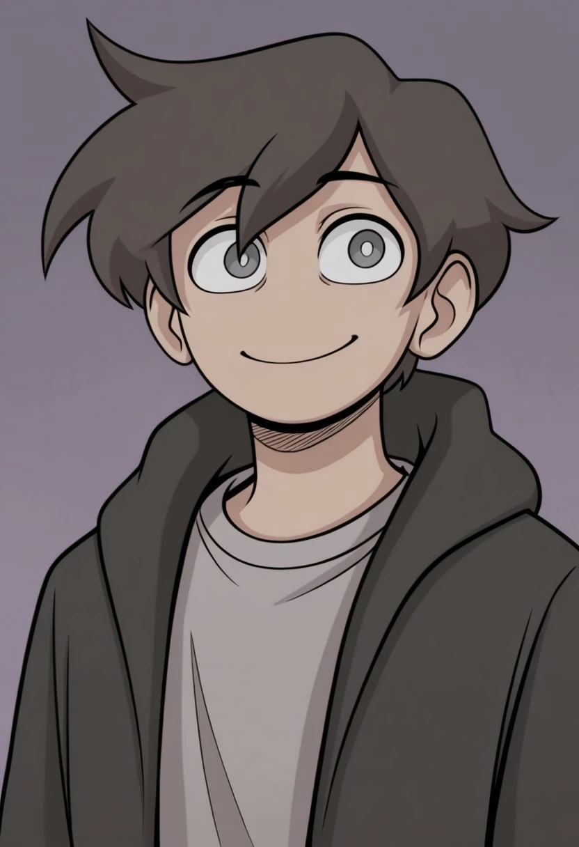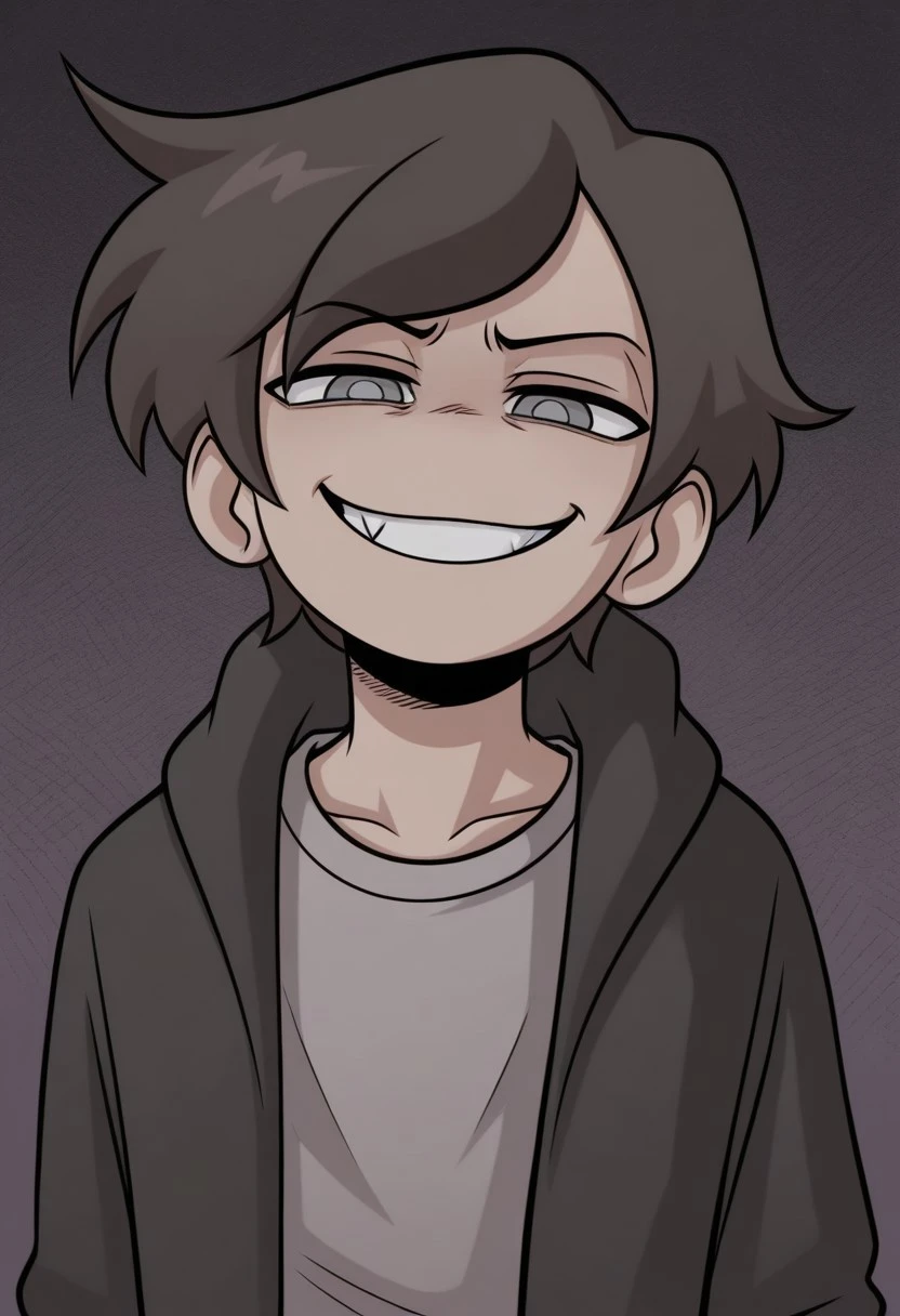 Prompt: Ben Again yt, solo, 1boy, brown hair, grey eyes, white sclera, grey pupils, dark grey jacket, dark grey hoodie, grey shirt, grey pants, brown shoes