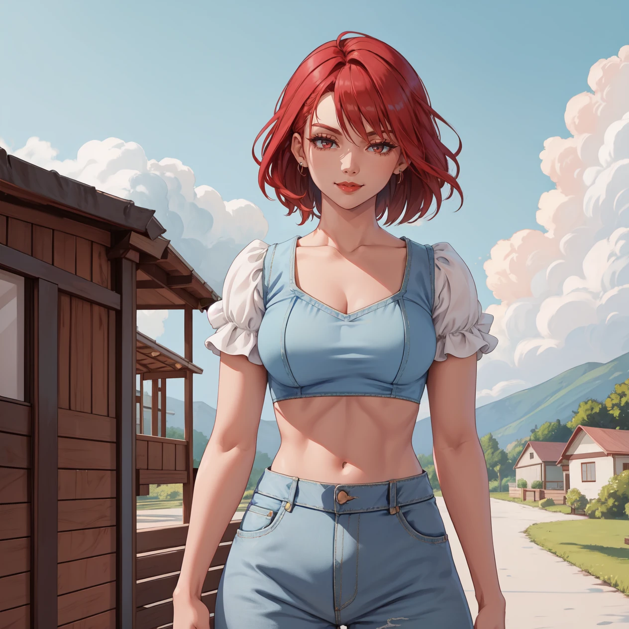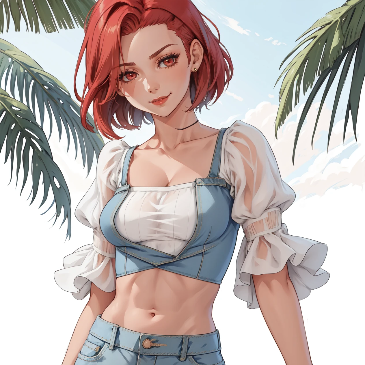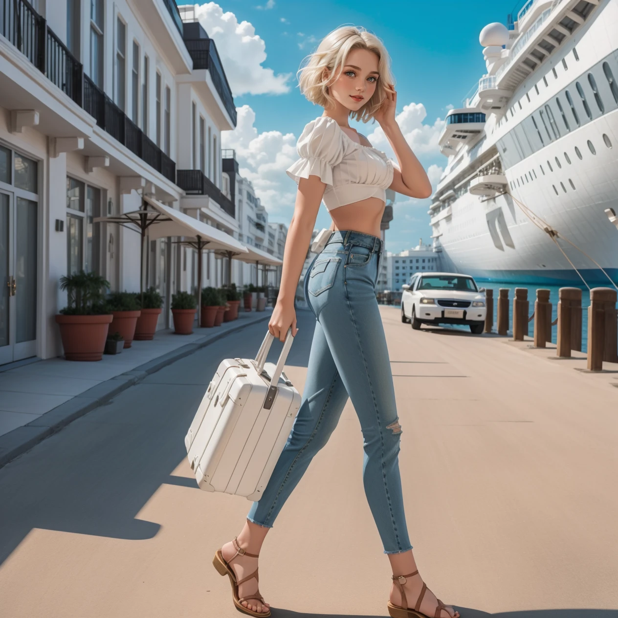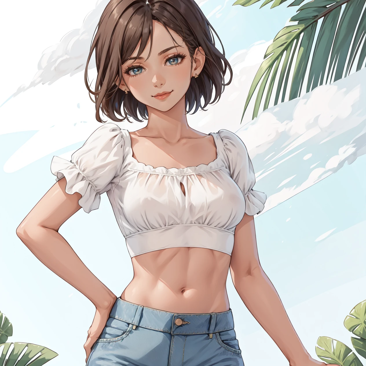 Keywords: hud_vacay, jewelry, denim jeans, white crop top, puffy sleeves, short sleeves, midriff