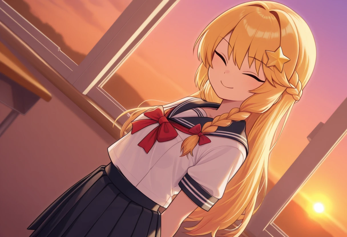 blonde hair, long hair, braid, school uniform, serafuku, white shirt, pleated skirt, short sleeves, star \(symbol\), star hair ornament,
