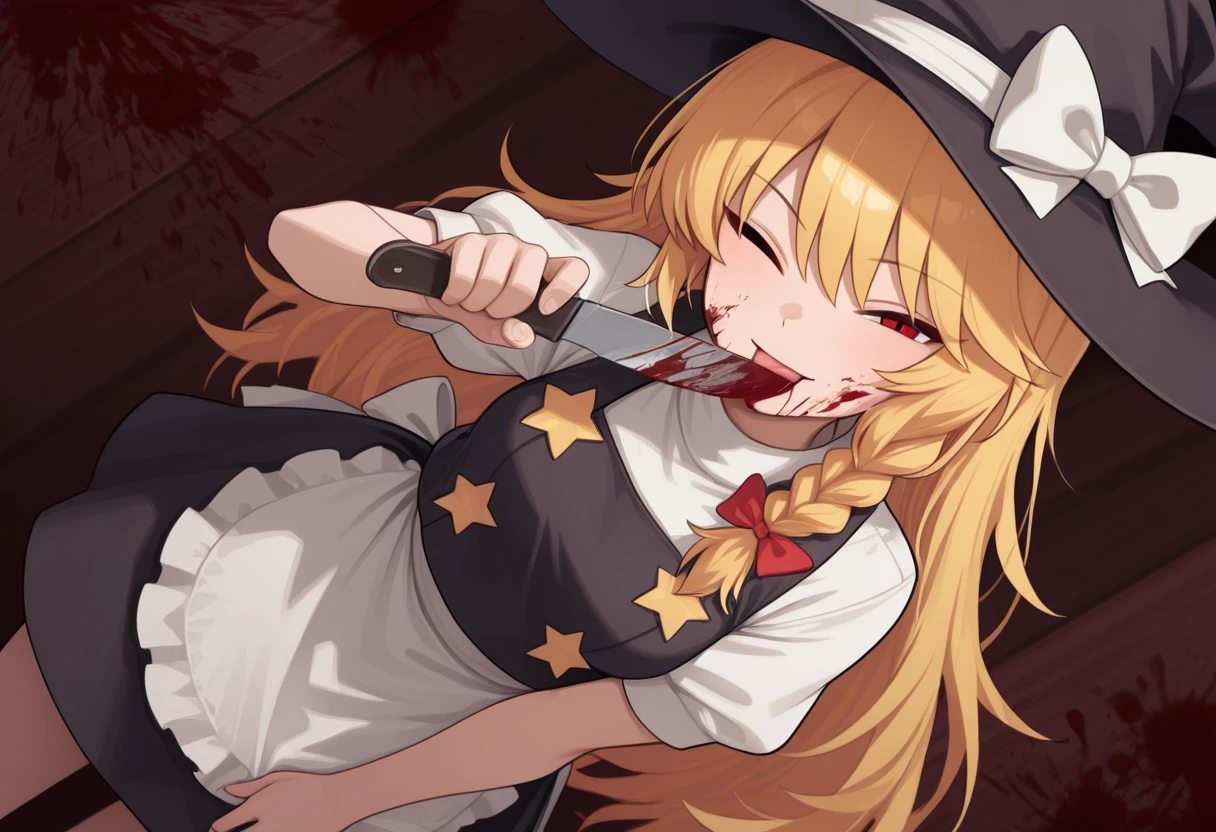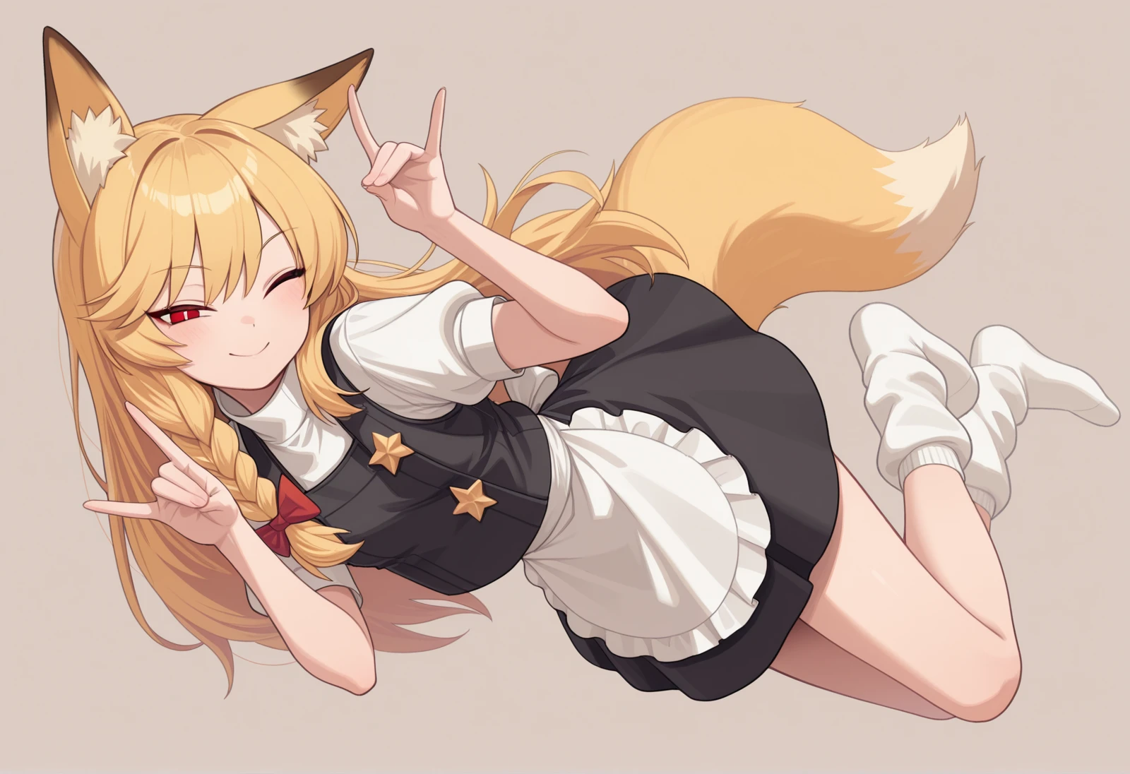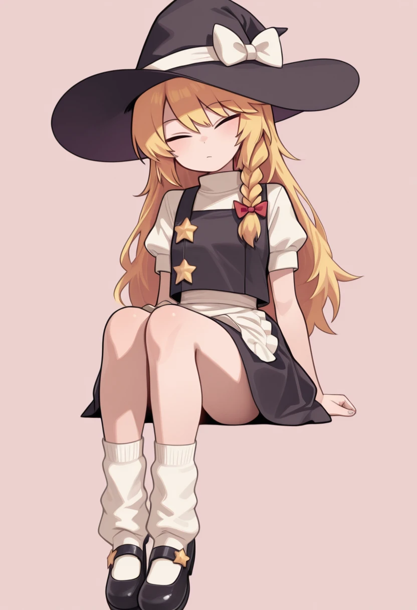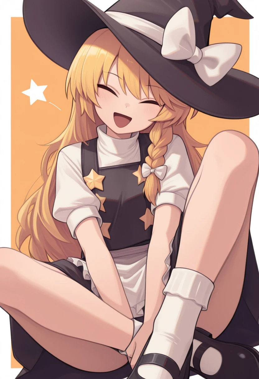 blonde hair, long hair, side braid, hair bow, witch hat, hat bow, white bow, black vest, white shirt, short sleeves, white apron, black skirt, socks, fluffy legwear, mary janes, star \(symbol\), star button,