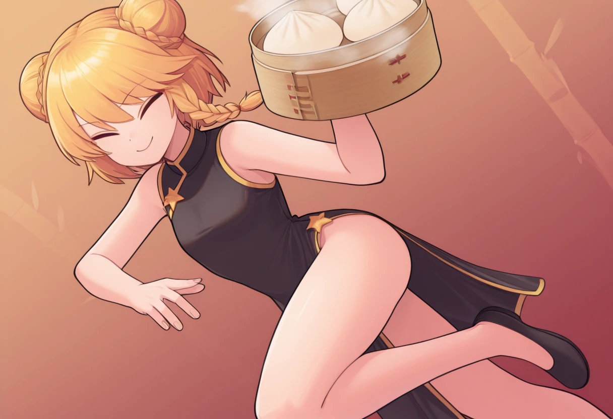 blonde hair, short hair, hair bun, double bun, braid, china dress, black dress, sleeveless dress, star \(symbol\), star button,