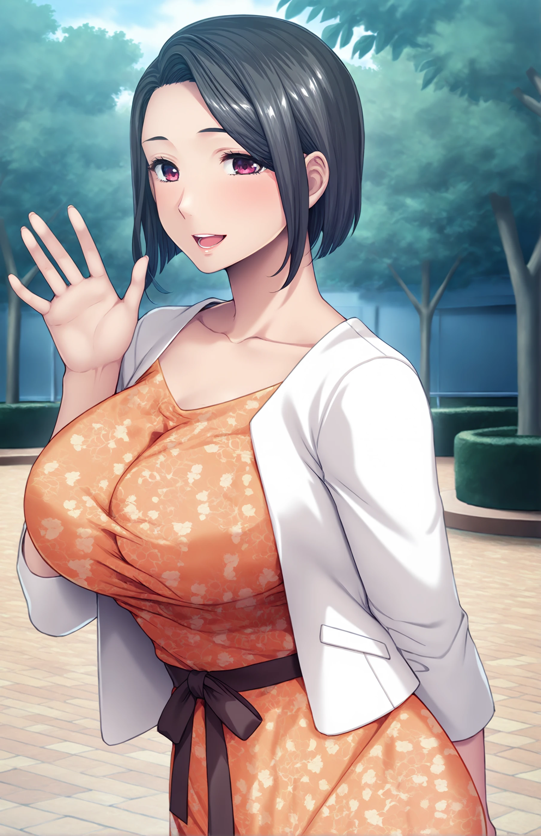 AoiSaeka, breasts, short hair, large breasts, black hair, red eyes, dress, collarbone, jacket, floral print, waist strap, white jacket, mature female, orange dress