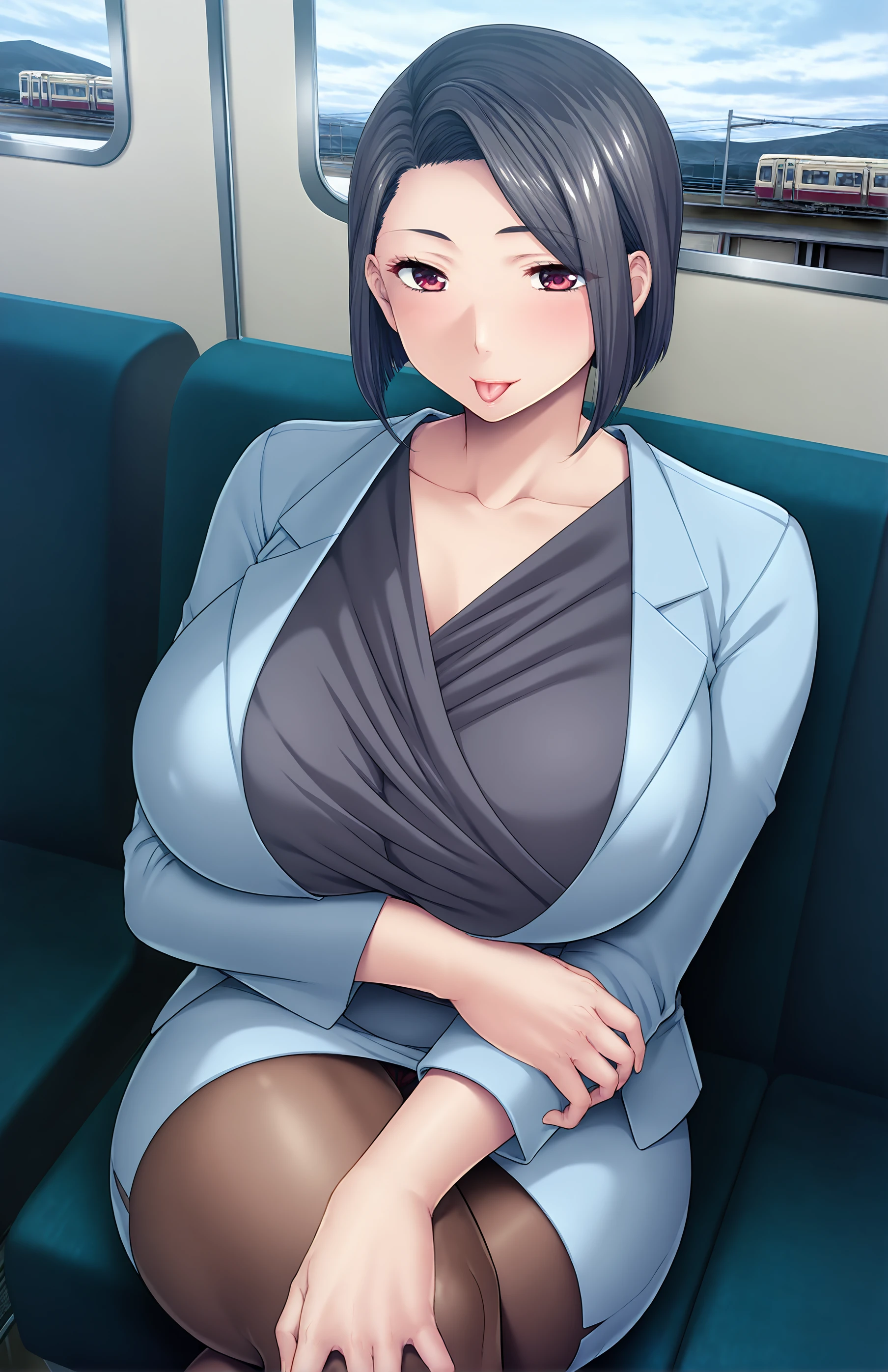 AoiSaeka, breasts, short hair, skirt, large breasts, shirt, black hair, red eyes, collarbone, jacket, huge breasts, black shirt, formal, suit, blue jacket, mature female, office lady, brown pantyhose