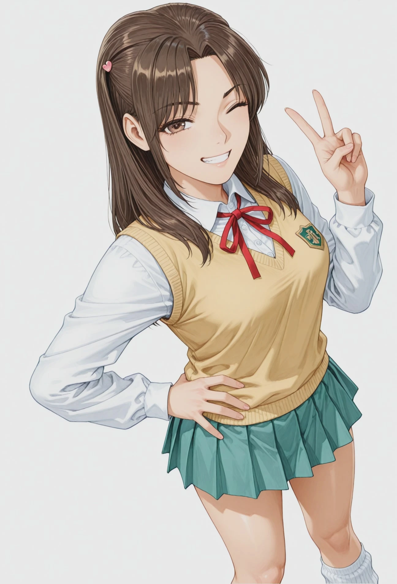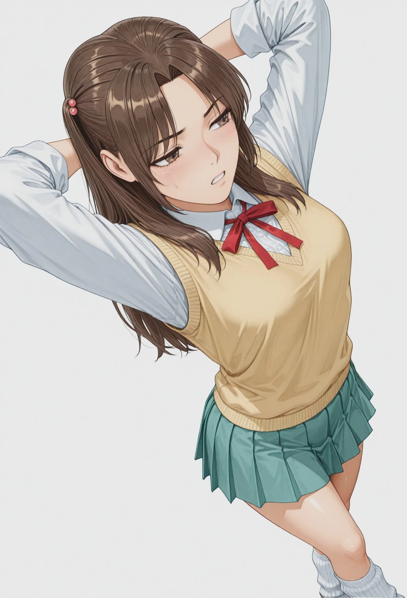 red_ribbon, yellow sweater vest, white shirt, long sleeves, aqua skirt, pleated skirt, loose socks,