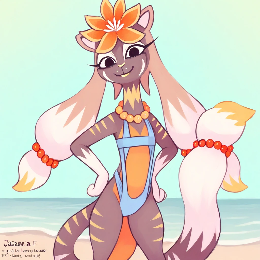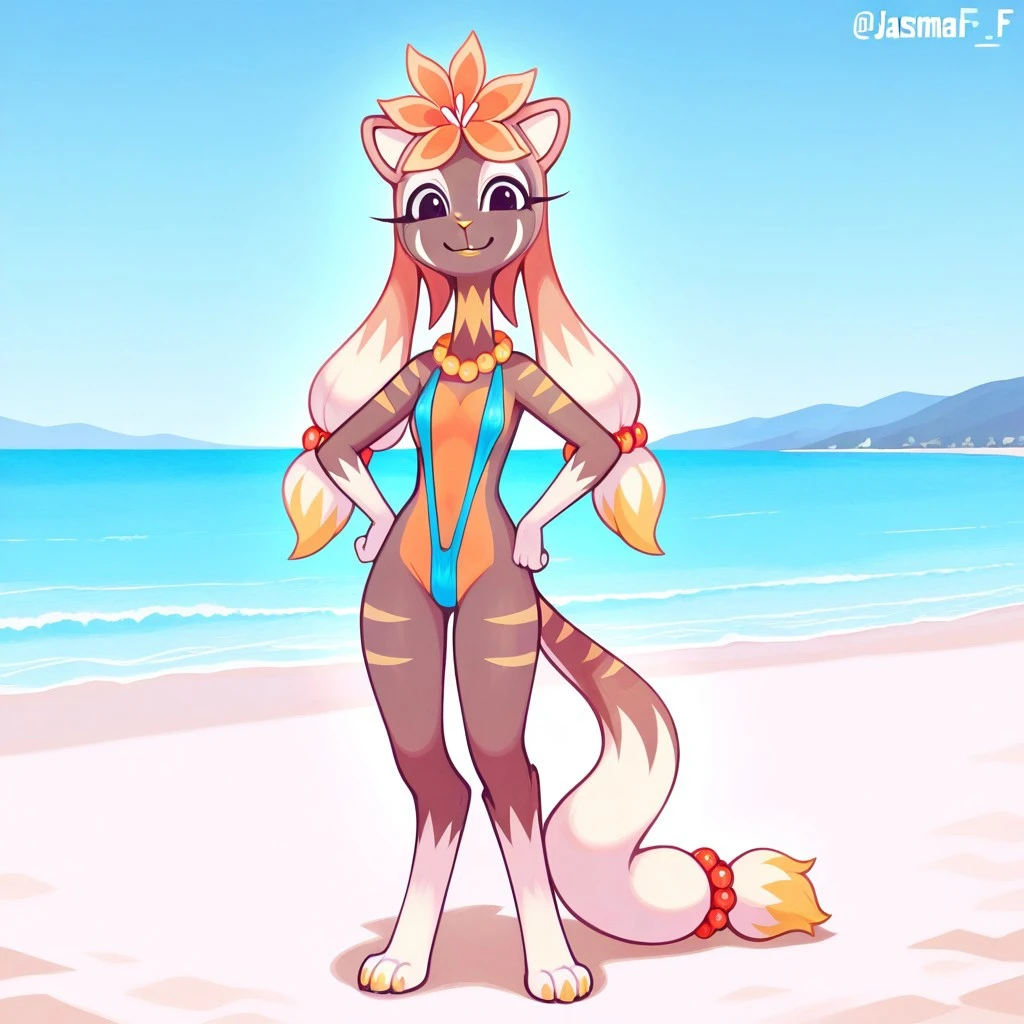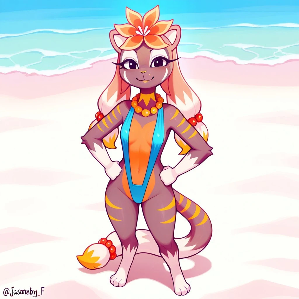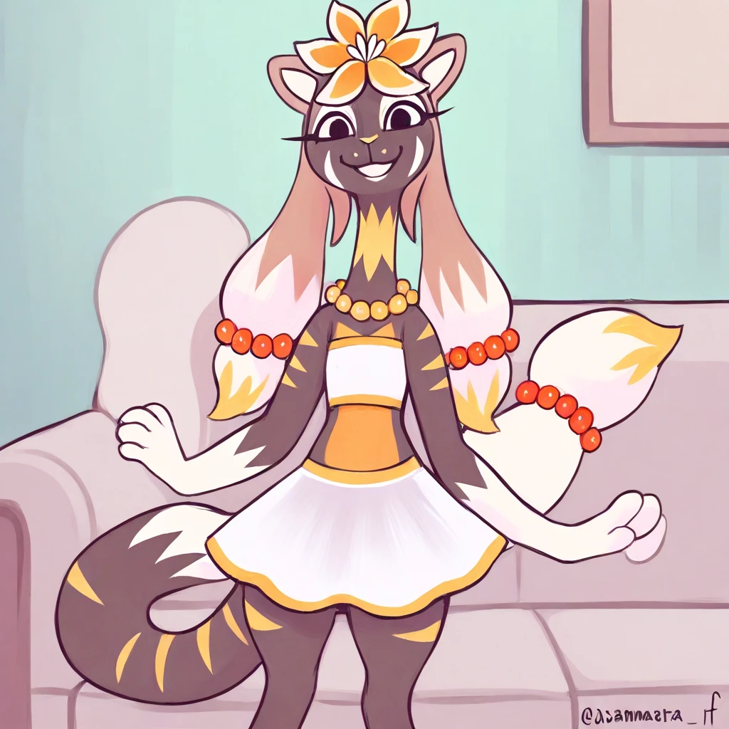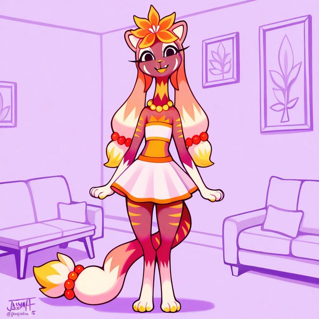 Solo, 1girl, anthro, furry female, catgirl, tiger, brown fur, striped fur, orange stripes, two-toned hair, twintails, long tail, black eyes, flower head ornament, white paws, white eyeshadow, eyelashes, red pearl necklace, white tube top, white skirt,