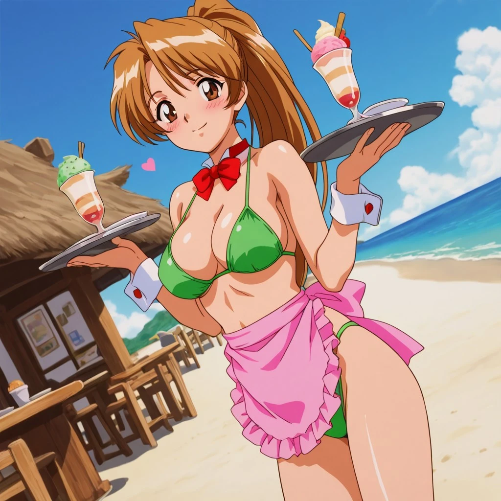 Outfit 02 (Summer Camp): green bikini, pink apron,wrist cuffs, red neck bow,
