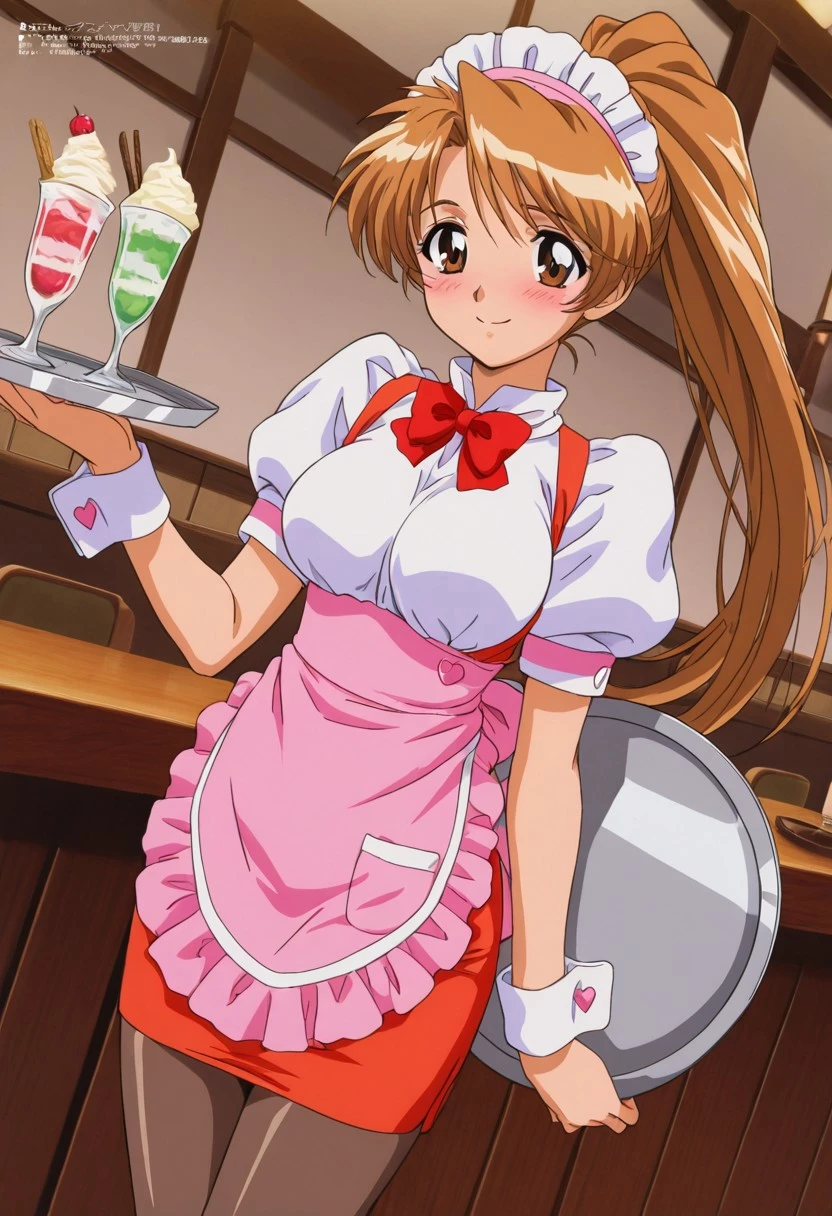 Outfit 01: waitress, wrist cuffs, apron, puffy short sleeves, maid headdress, red neck bow, pantyhose,