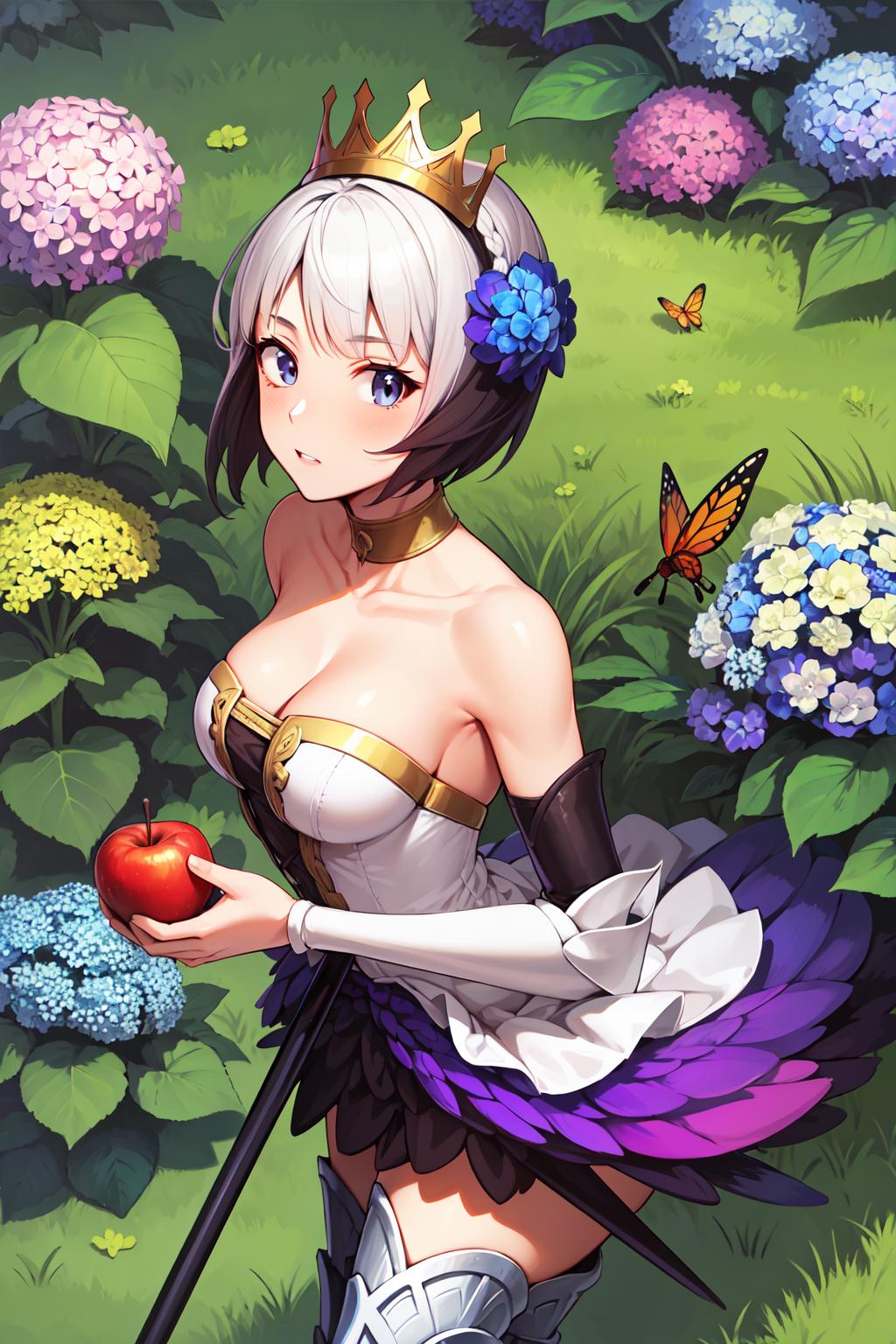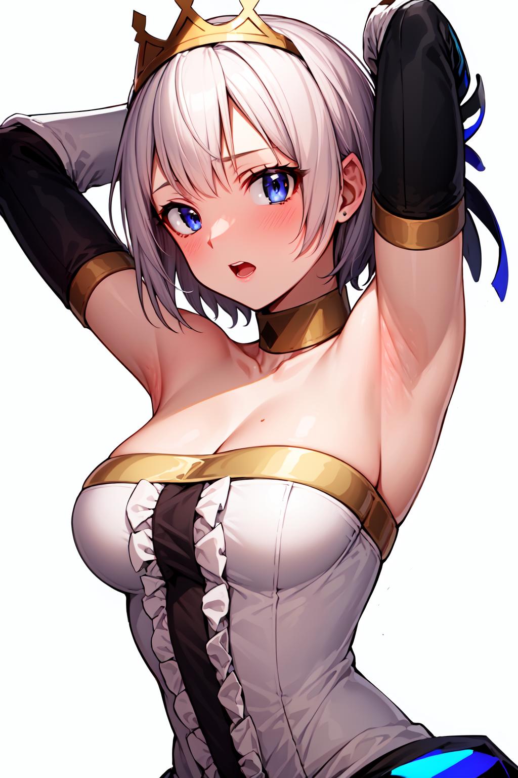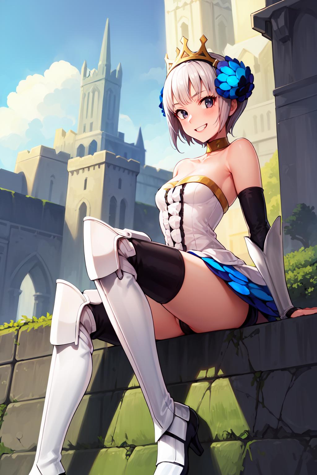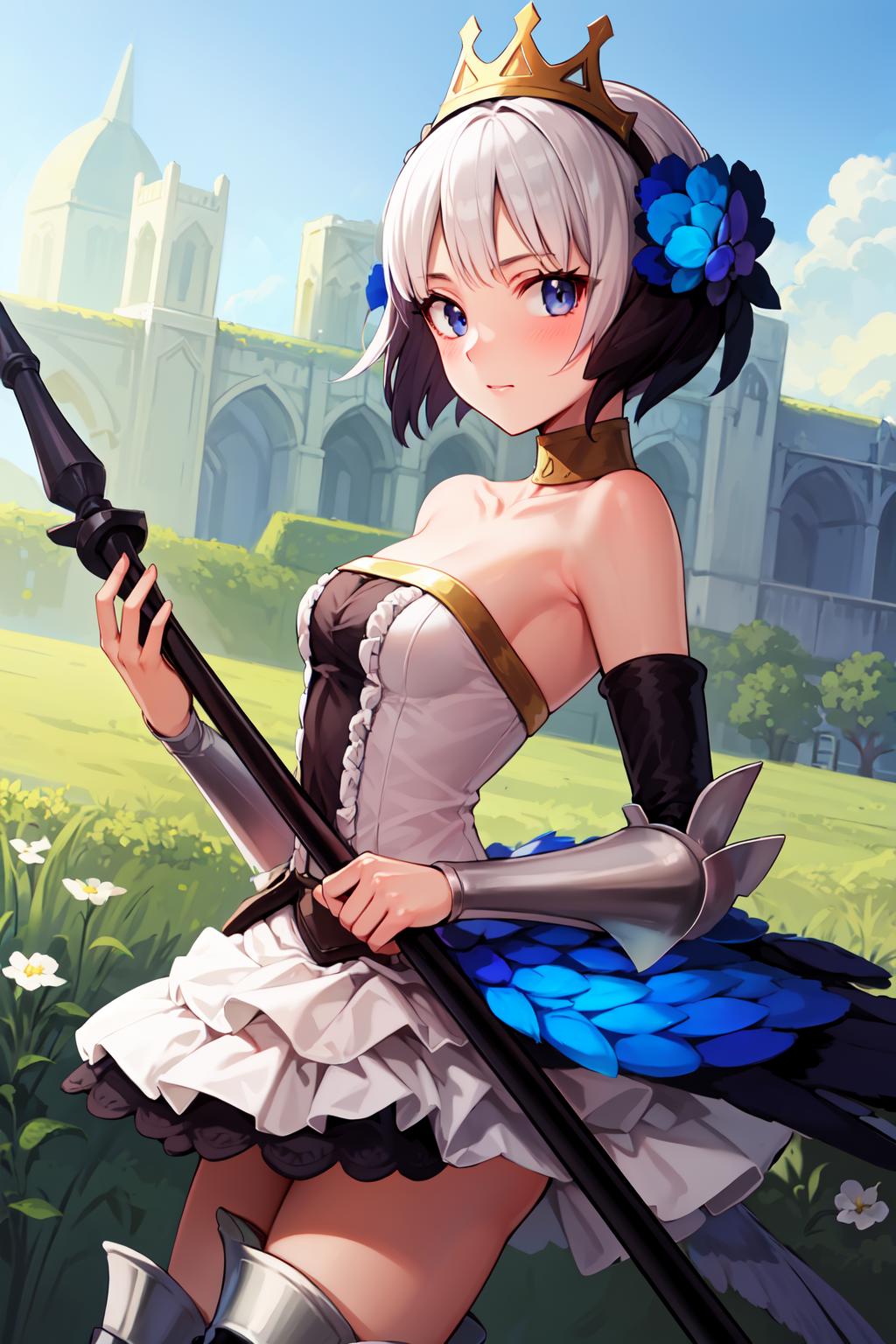 To prompt Gwendolyn in her combat outfit, enter "<lora:Gwenv2:strength>Gwenos, short hair, low feathers, white strapless dress, tiara, detached gauntlets, gold collar, armored thigh boots, hair buns"