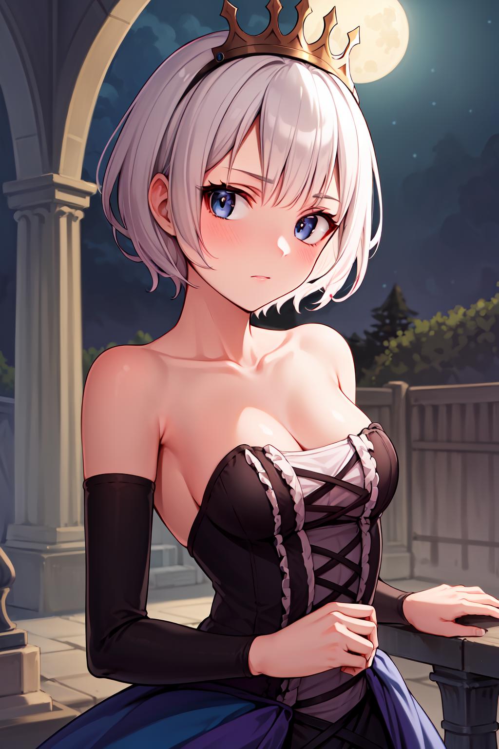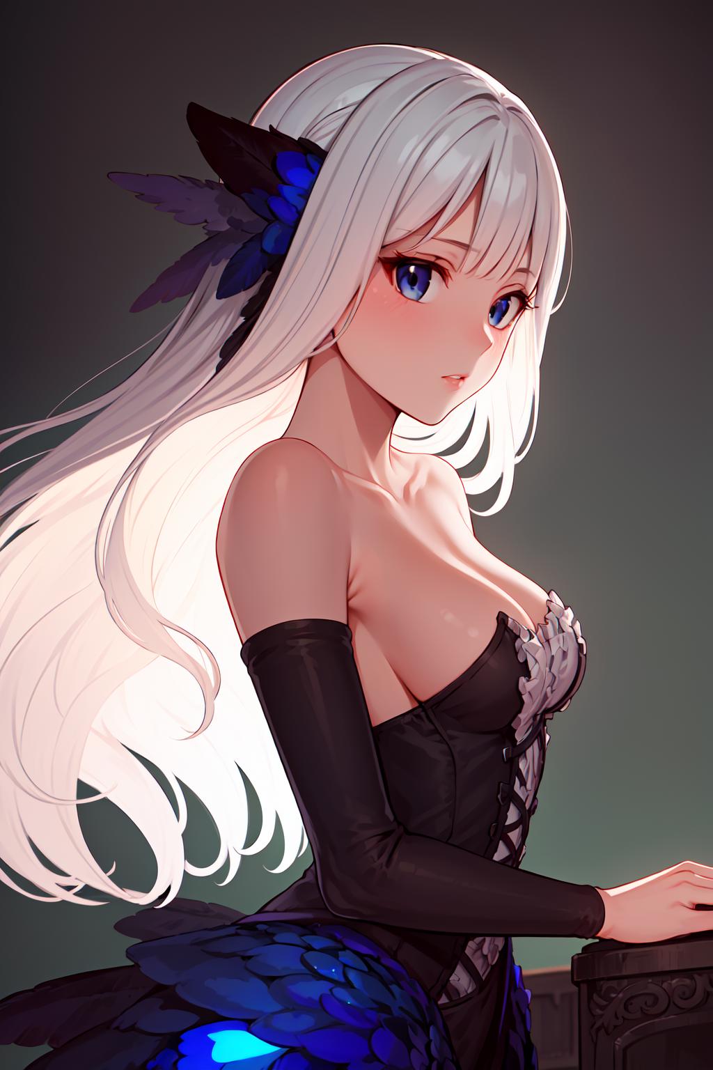 To prompt Gwendolyn in her princess gown outfit, enter "<lora:Gwenv2:strength>Gwenos, long hair, blonde hair, feather hair ornament, black corset gown"