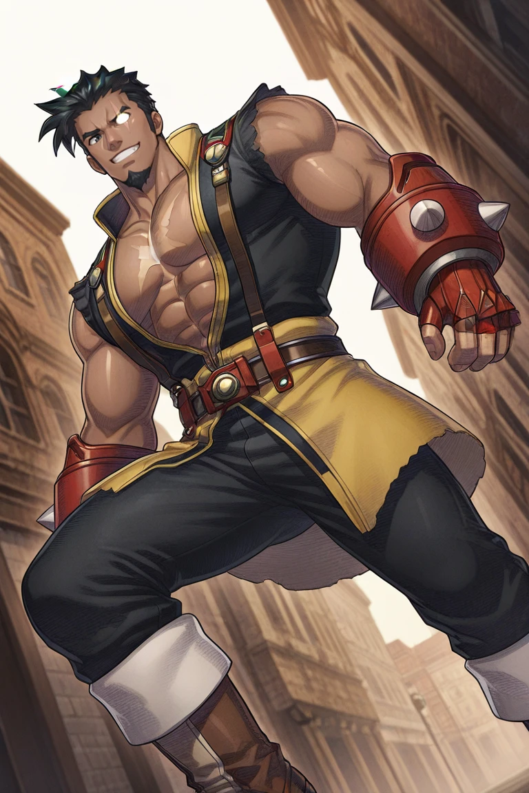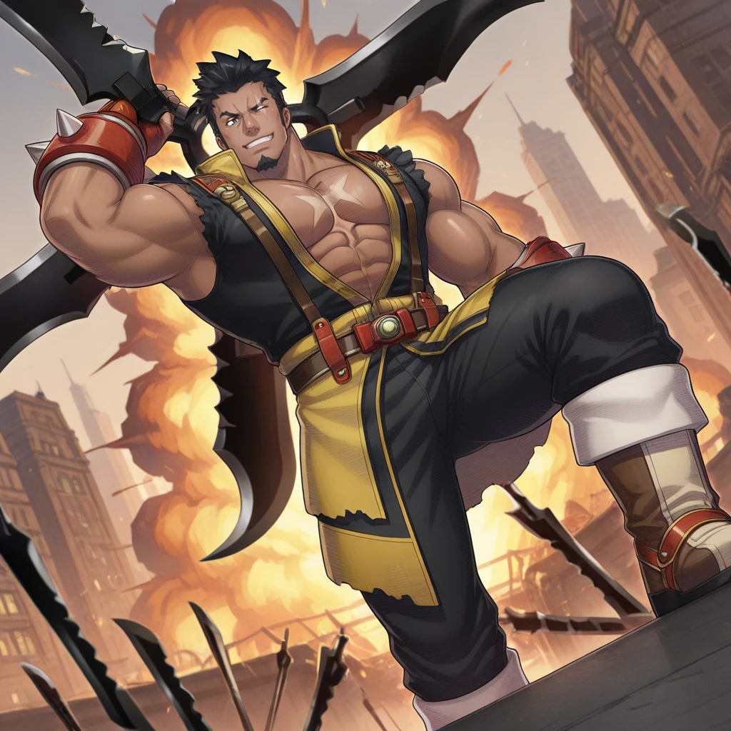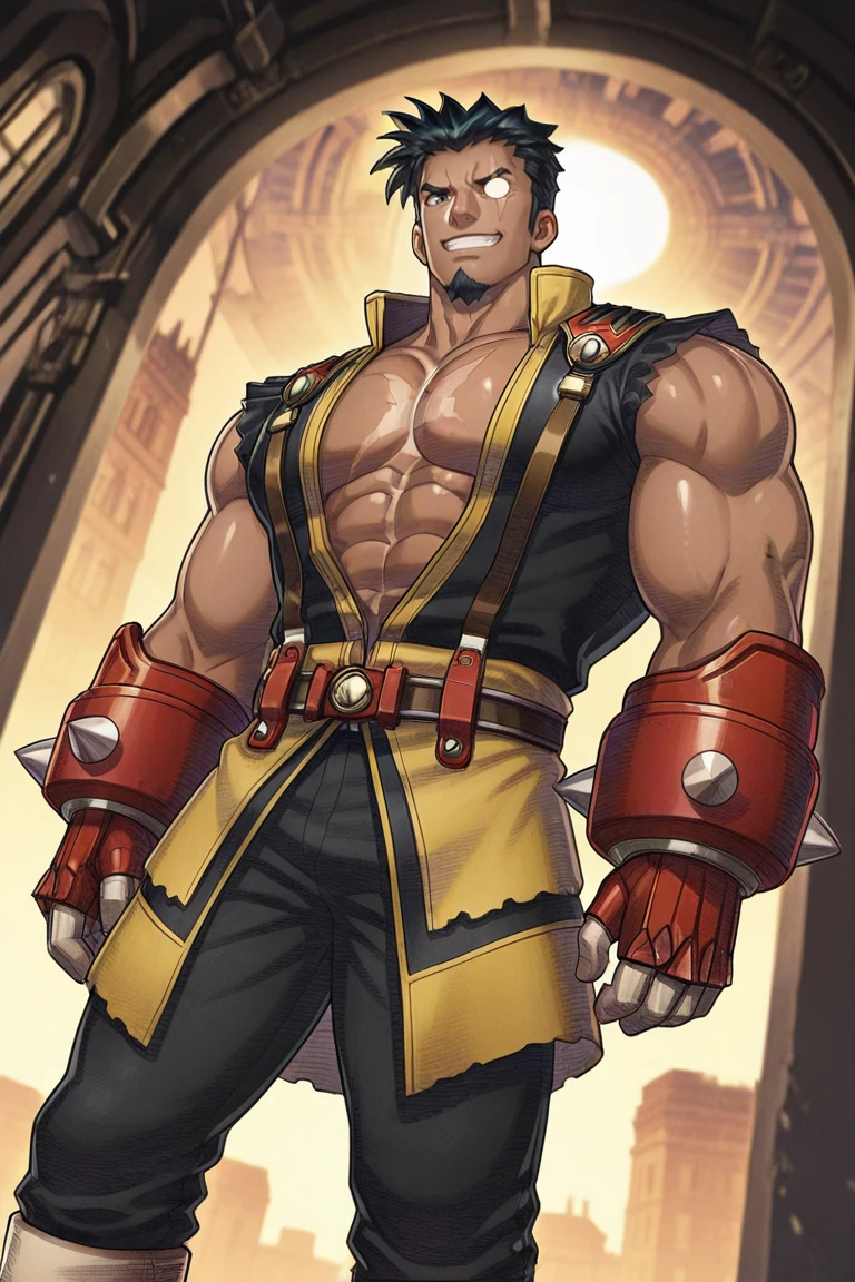 black and yellow sleeveles shirt, shoulder, arms,torn clothes,suspenders,scar on ,large pectorals,pectoral cleavage,abs,red fingerless gloves,gauntlets,black pants,belt,boots,