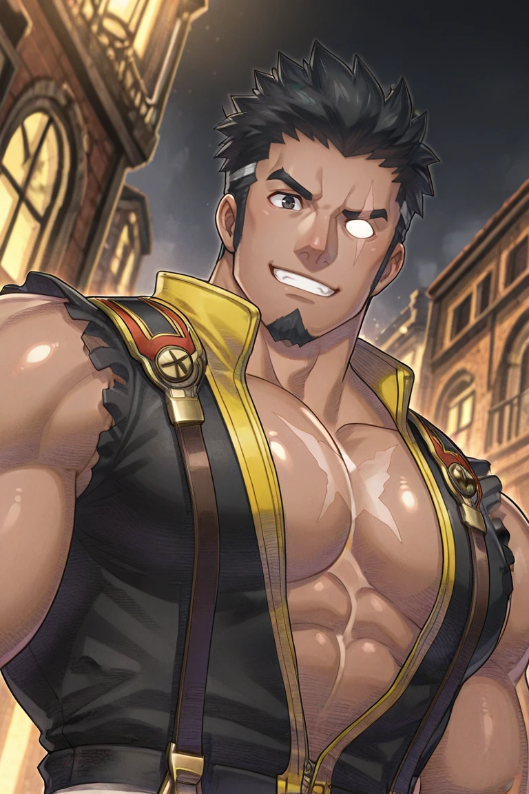 muscular,scar on face,dark skin,short hair,spiked hair,black hair,multicolored hair,hair slicked back,thick eyebrows,sideburns,left eye is black eye,right eye is blank eye,right eye is white eye,goatee,facial hair,