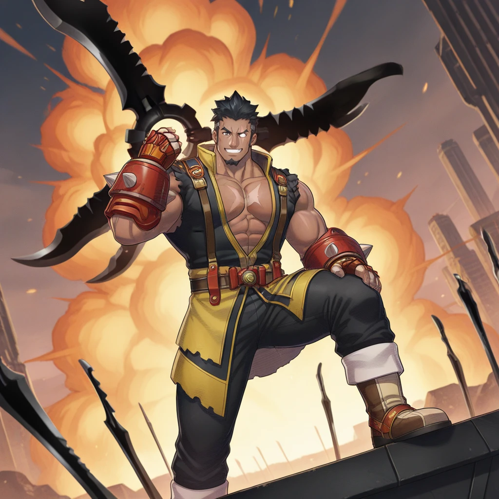 Wear :black and yellow sleeveles shirt,bare shoulder,bare arms,torn clothes,suspenders,scar on chest,large pectorals,pectoral cleavage,abs,red fingerless gloves,gauntlets,black pants,belt,boots,