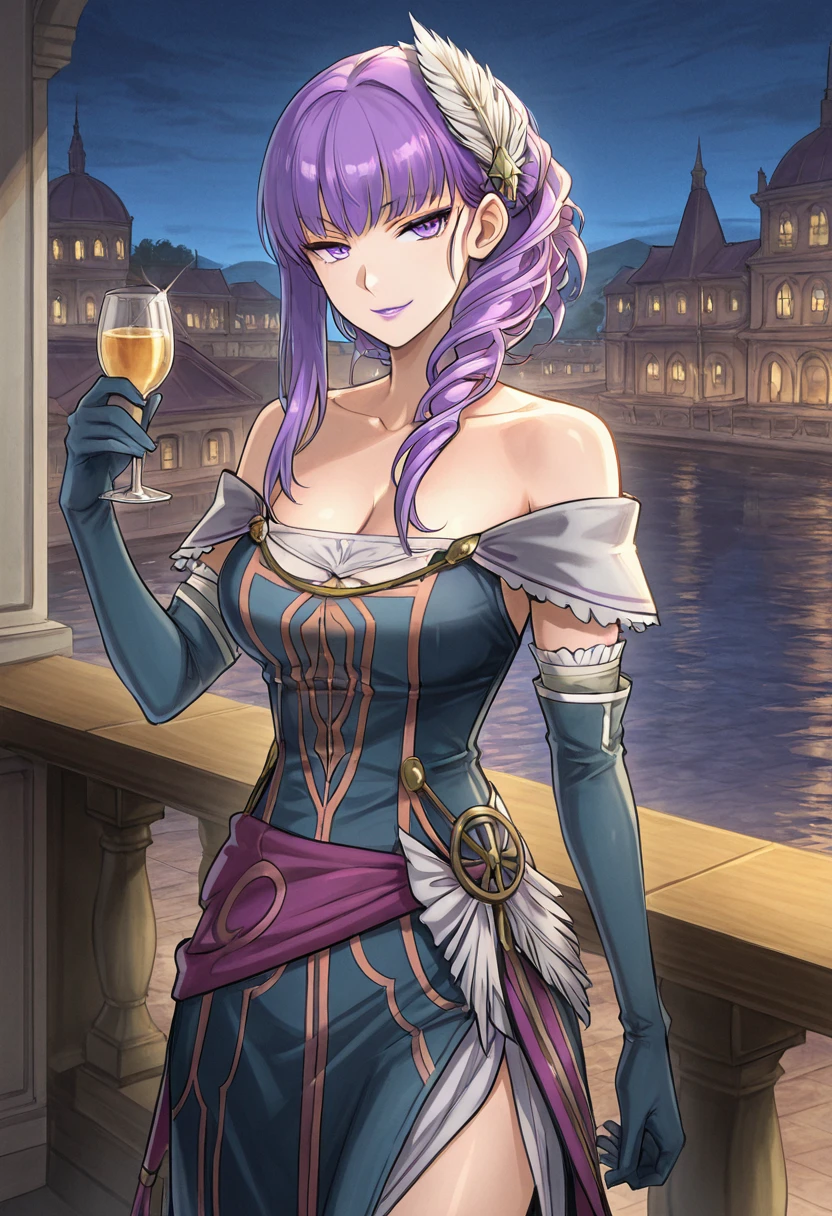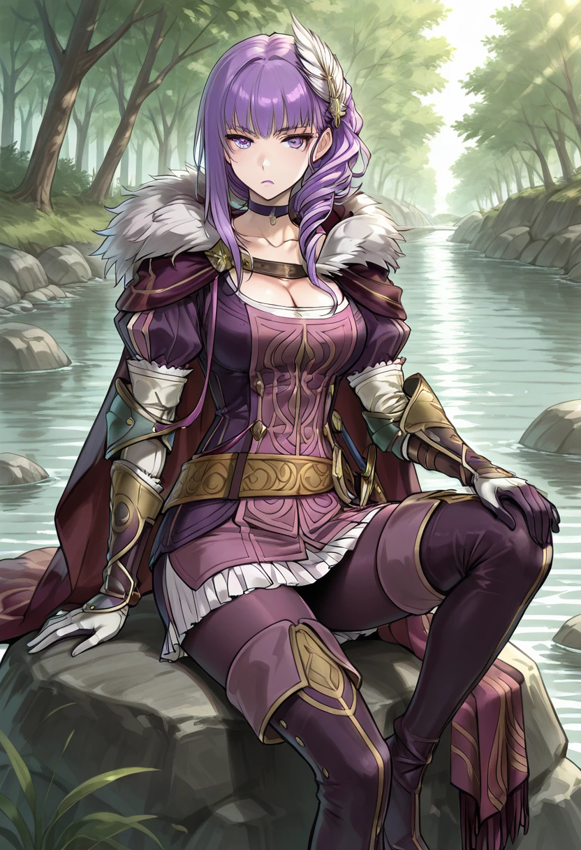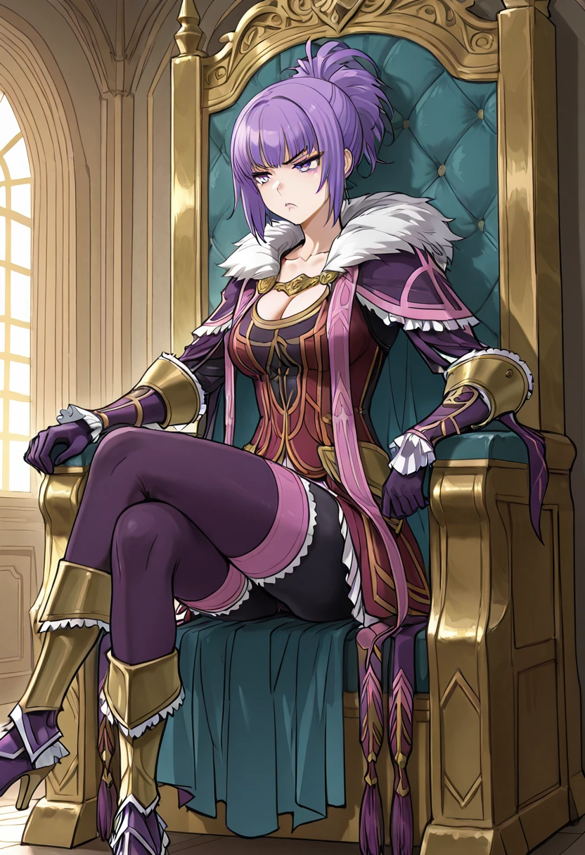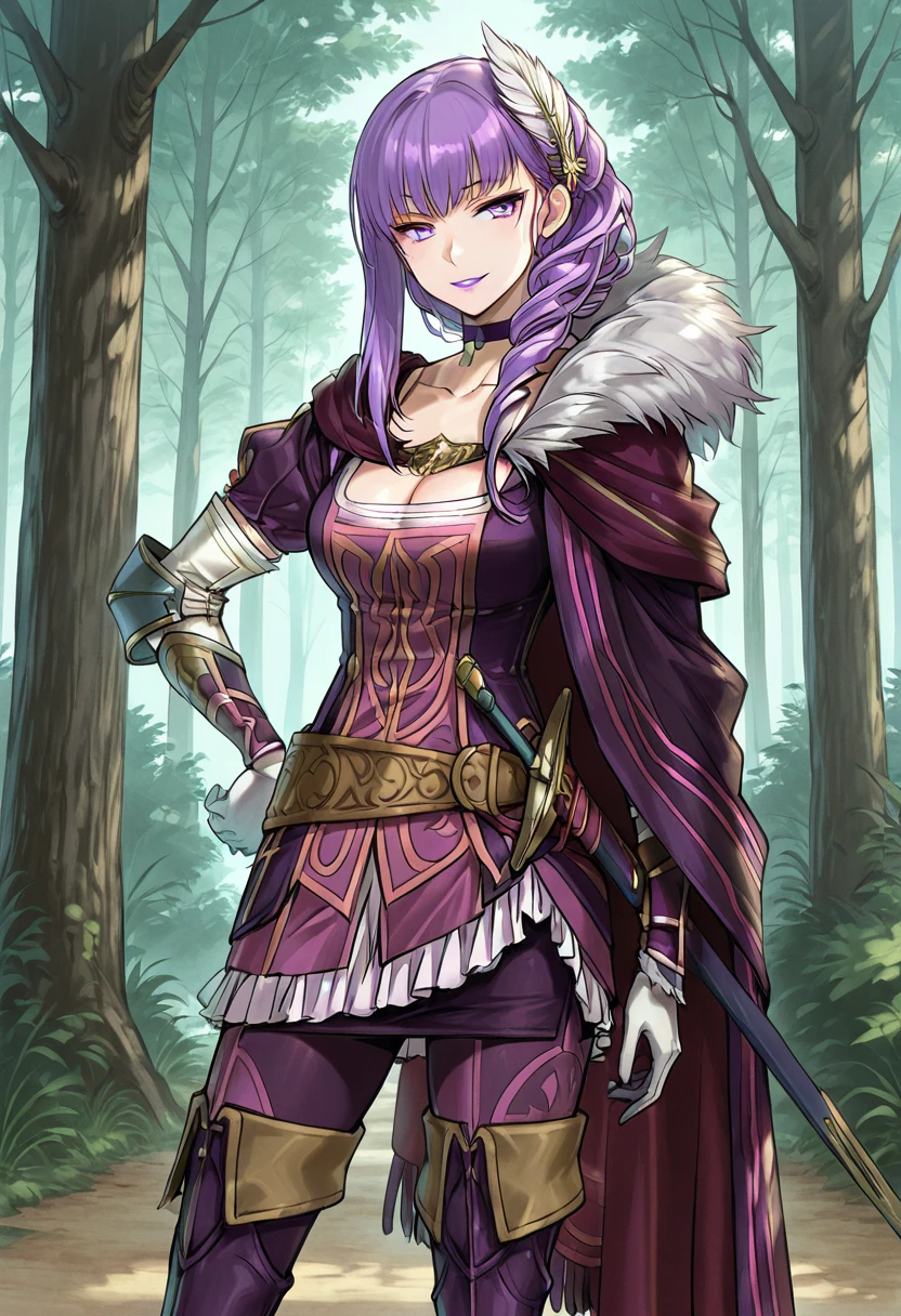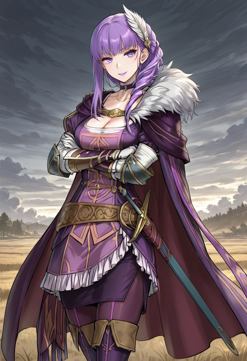 Trigger Words (Ys: Lacrimosa of Dana): GriseldaVIII, long hair, long sidelocks, side drill, feather hair ornament, dark red choker, asymmetrical cloak, fur trim, long cloak, purple dress, short dress, cleavage, puffy sleeves, white gloves, elbow gloves, gauntlets, brown belt, sword, dark purple skirt, pencil skirt, purple pantyhose, thigh boots, dark purple boots, high heels,