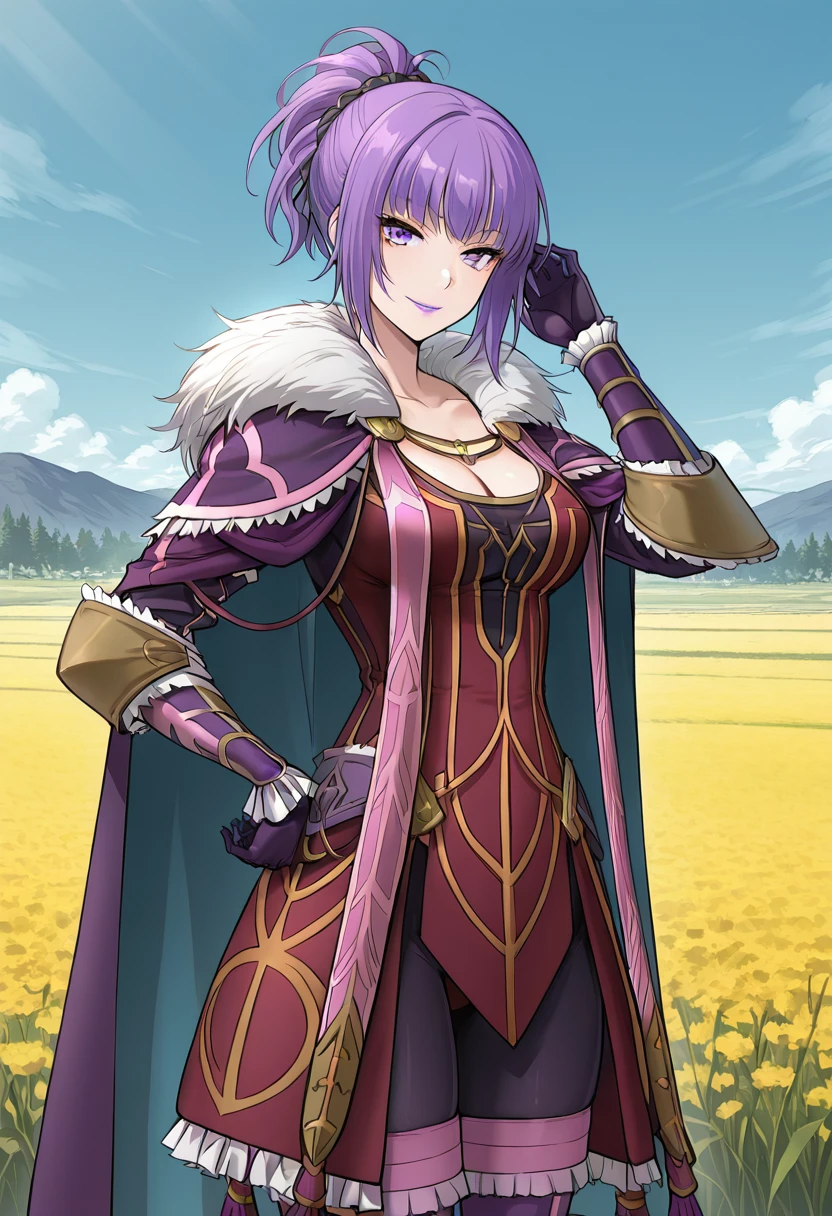 Trigger Words (Ys: Memories of Celceta): GriseldaIV, short hair, ponytail, fur collar, purple capelet, pink trim, long tassels, two-sided cape, purple cape, teal cape, cleavage, red dress, showgirl skirt, black bodystocking, purple gauntlets, frills, purple thighhighs, high heel boots, armored boots,