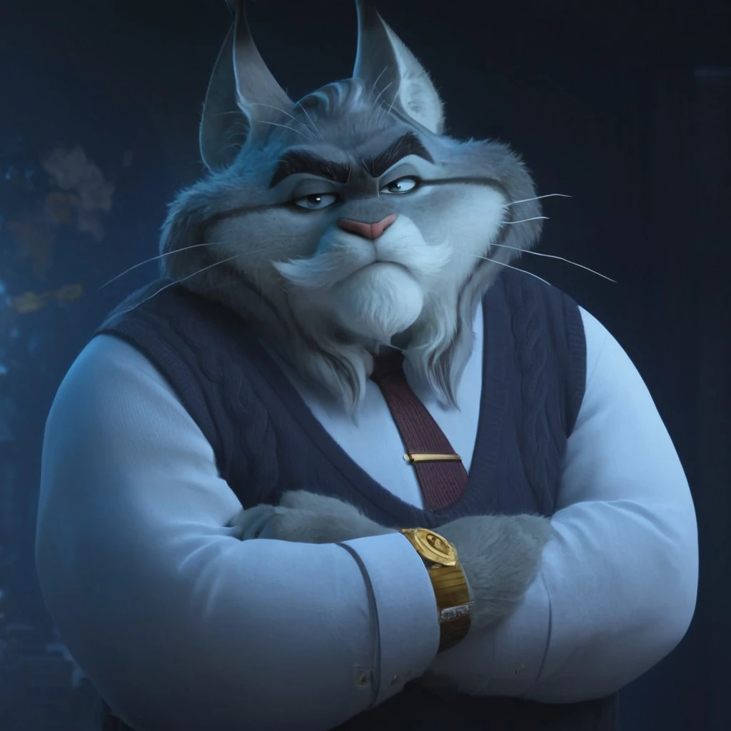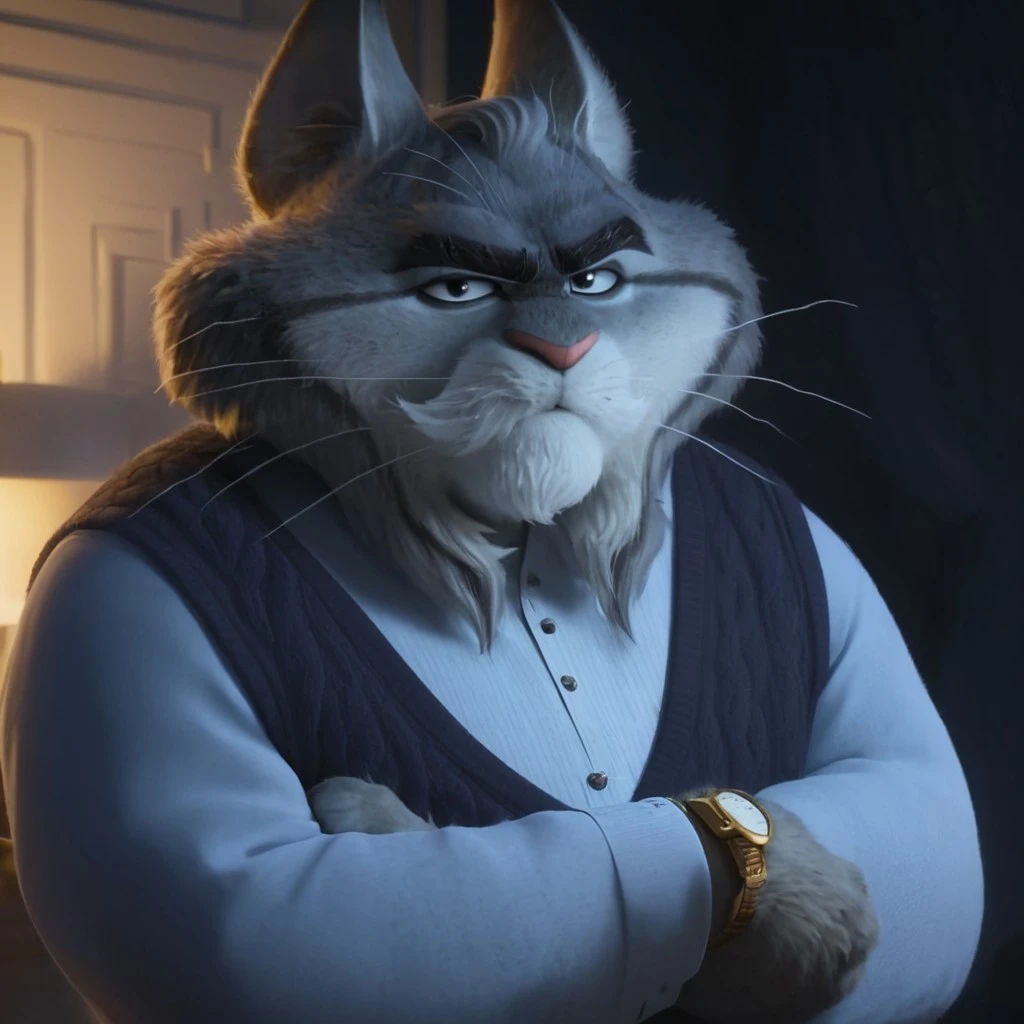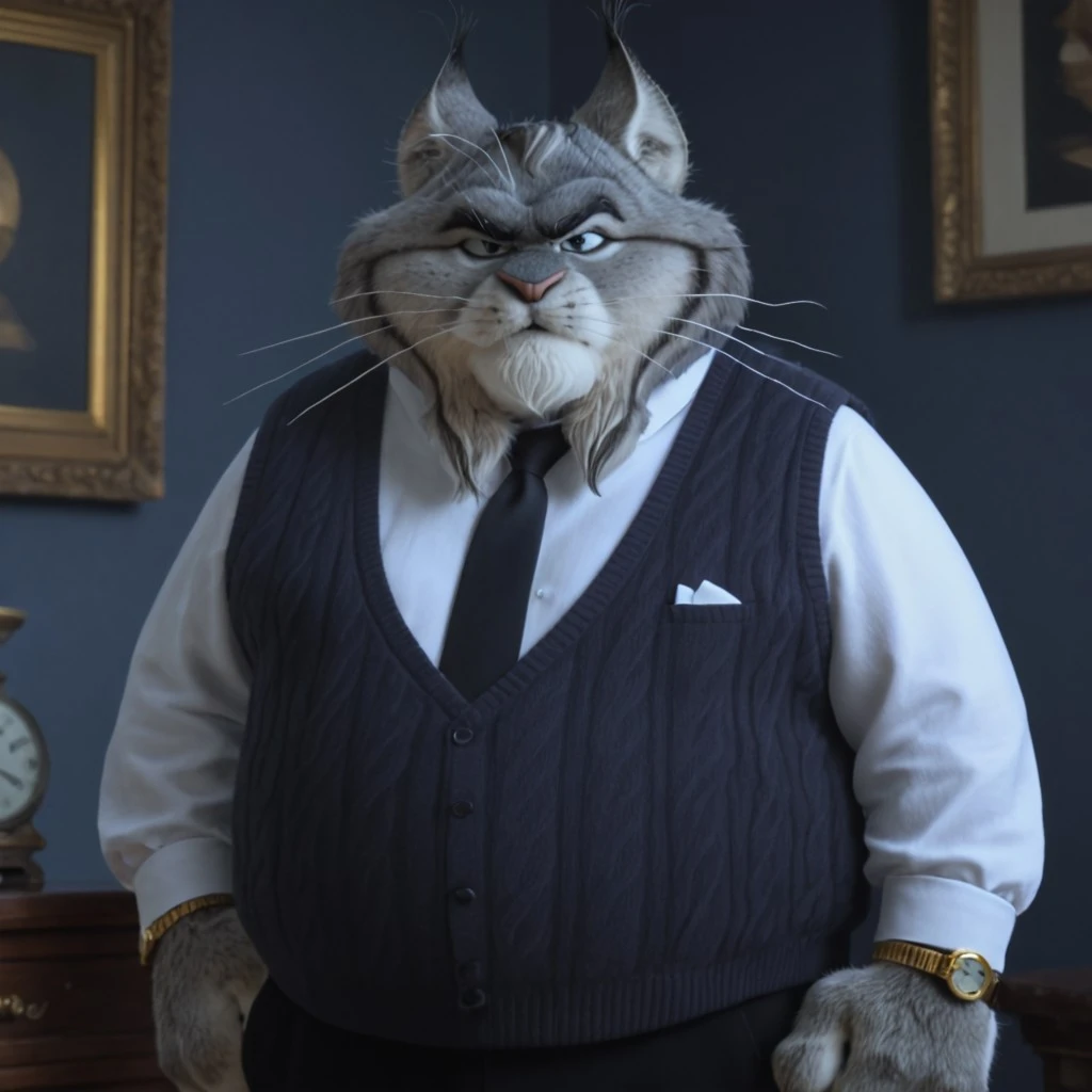mlynxley, lynx, cat, feline, furry, male, 3D, fluffy head, gray fur, realistic, black lips, black fur stripes, black eyebrows, furry beard, cat ears, fat, chubby, pink nose, black suit, claws, whiskers, fangs,