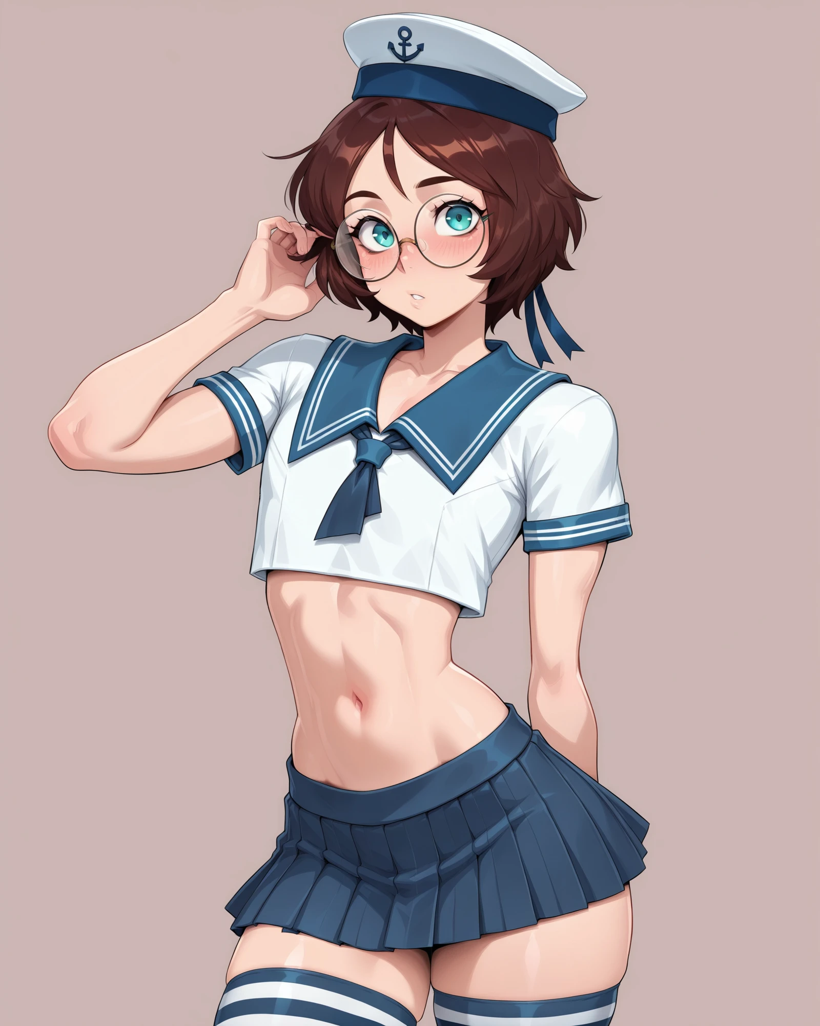 Tags: morgan, femboy, glasses, brown hair, short hair, round eyewear, blue eyes, long sleeves, skirt, choker, pleated skirt, fishnets