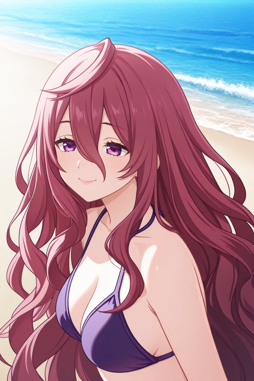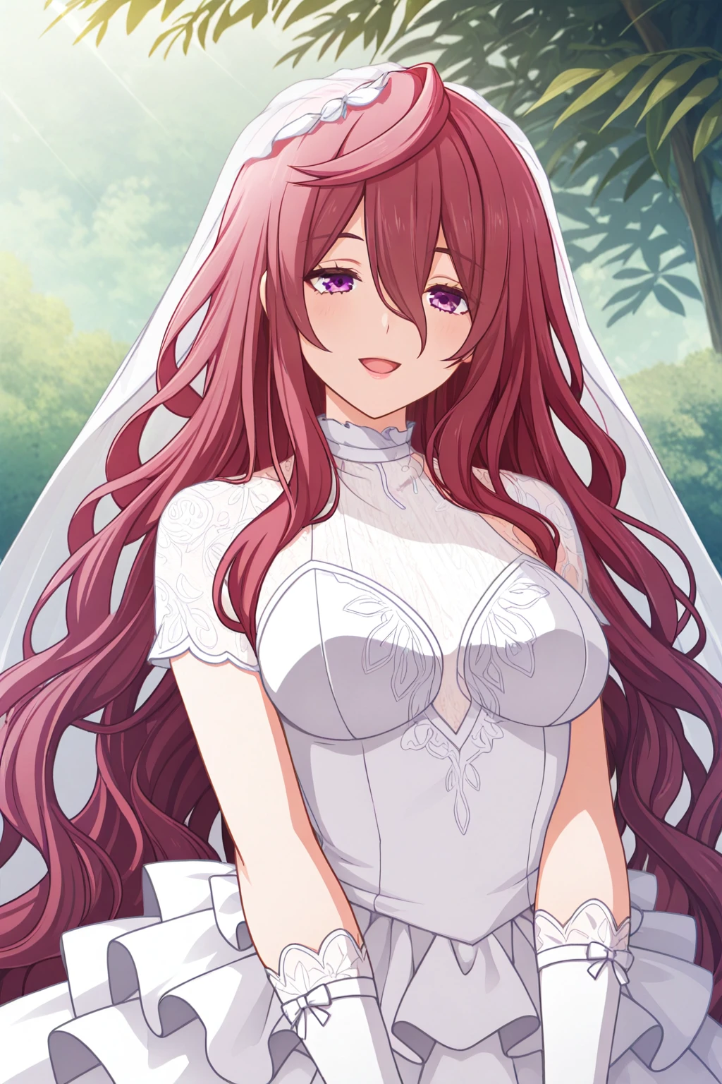 crimson hair, ahoge, long bangs, wavy hair, very long hair, purple eyes