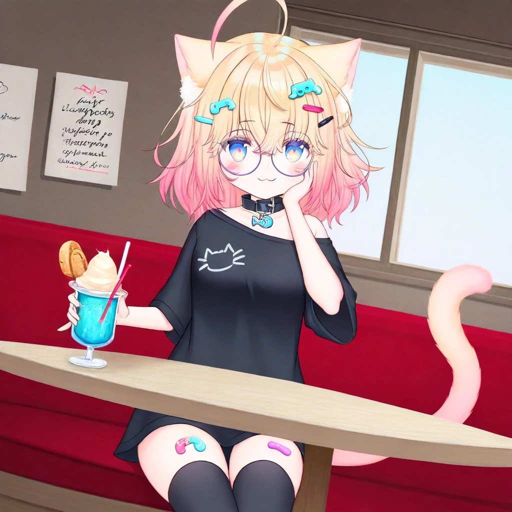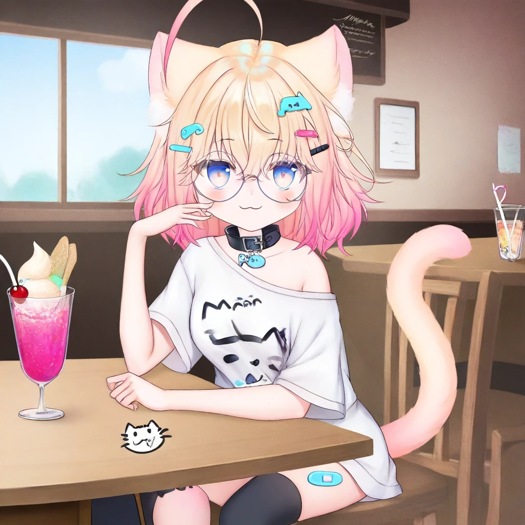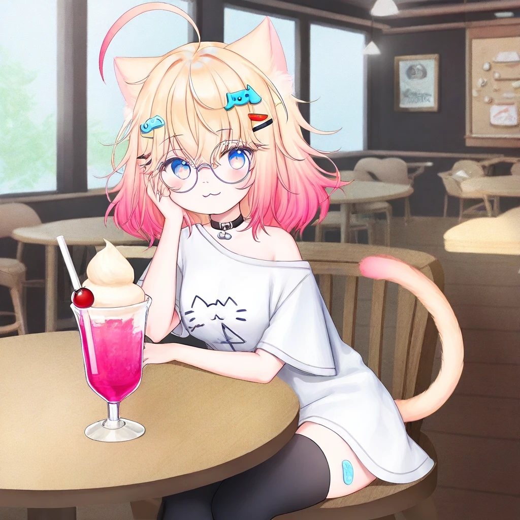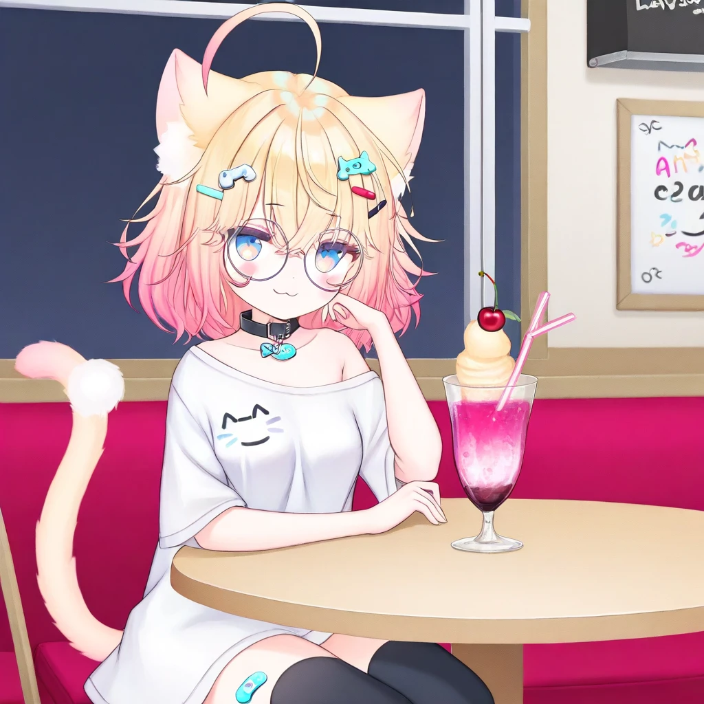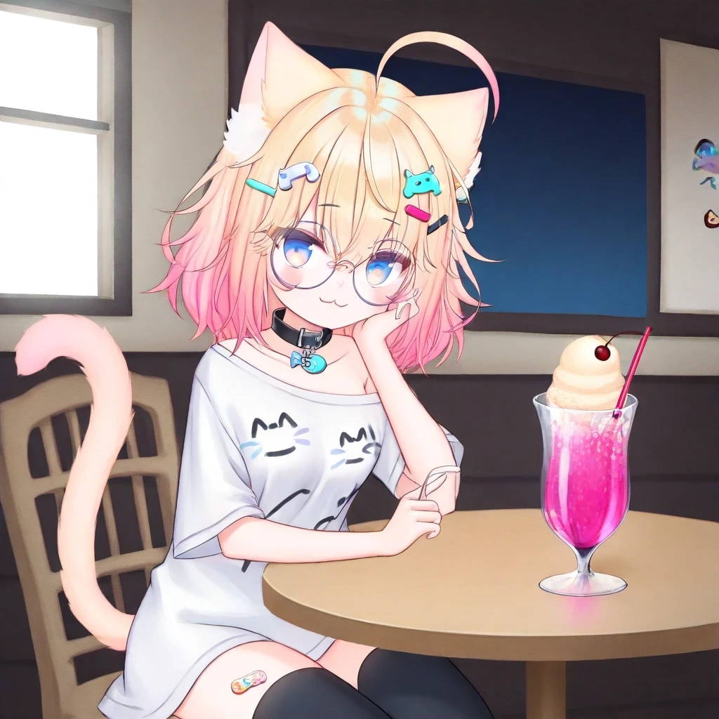 Minikomew, ahoge, multicolored hair, blonde hair, gradient hair, gradient eyes, blue eyes, hair between eyes, medium hair, hairclips, catgirl, cat ears, cat tail, blue eyes, round glasses, black choker, short sleeves, white shirt, oversize plain white shoulder, stickers on leg, asymmetrical black thighhighs, uneven black legwear, choker, choker with a fish ornament, medium , score_9, score_8_up, score_7_up, smile at viewer, 1girl, solo, lazypos, anime-style, perfect anatomy, smile, short hair, perfect hands, holding, HD, high quality, lazypos