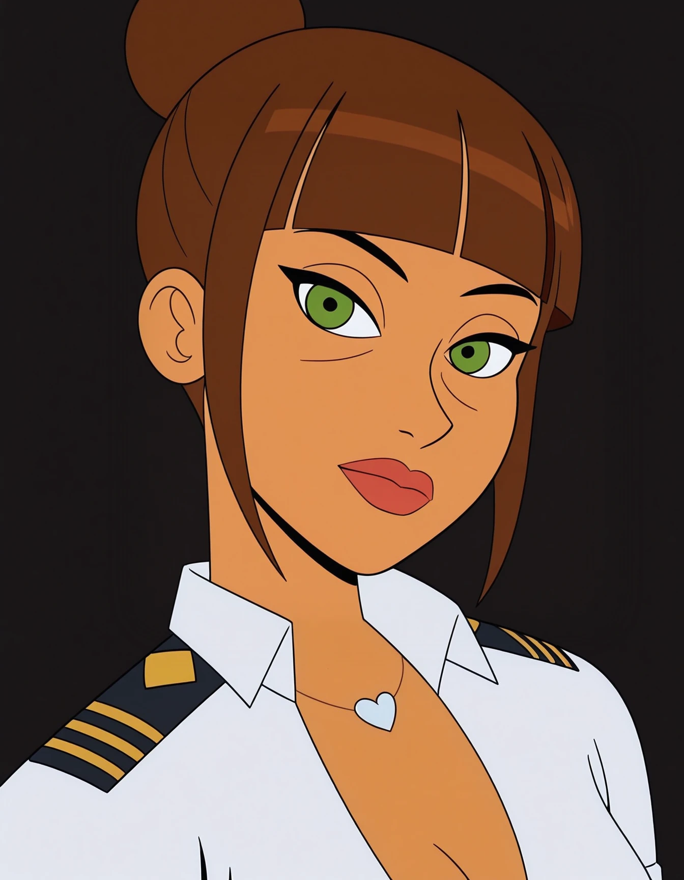 xlizax, brown hair, single hair bun, blunt bangs, green eyes, dark-skinned female, heart necklace, lipstick