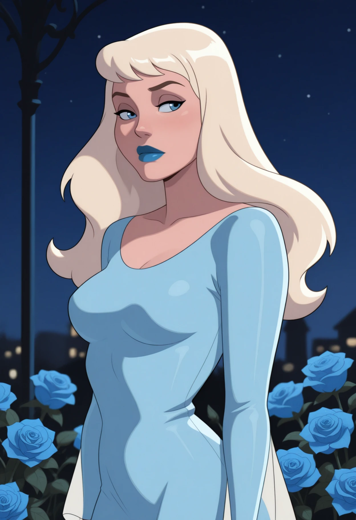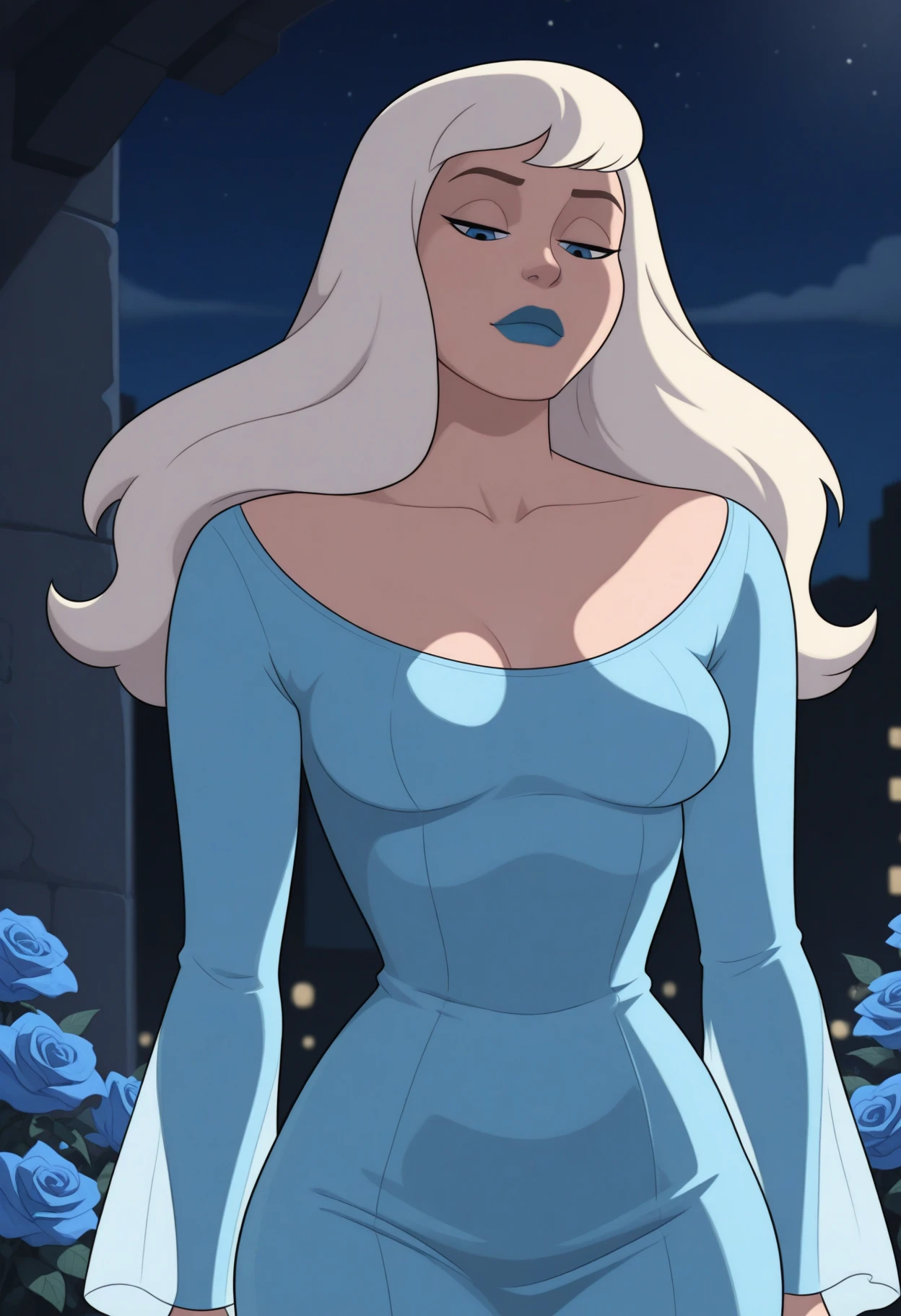 1girl, solo, blue eyes, blonde hair, white hair, long hair, breasts, medium breasts, lipstick, blue lips,