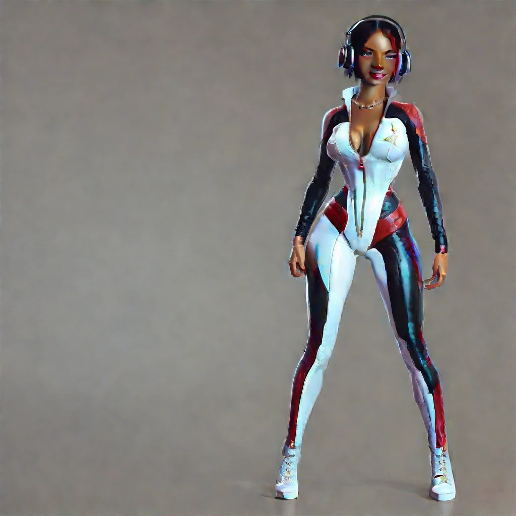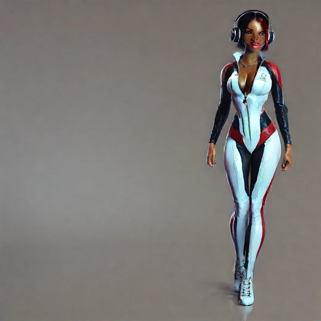 1girl, lipstick, Tan-Skinned Female, Two-toned hair ((Black hair, red hair)), necklace, short hair, very tan skin, bodysuit, zipper, cleavage, headphones, makeup Mixy Trix