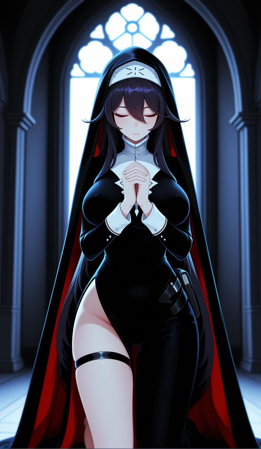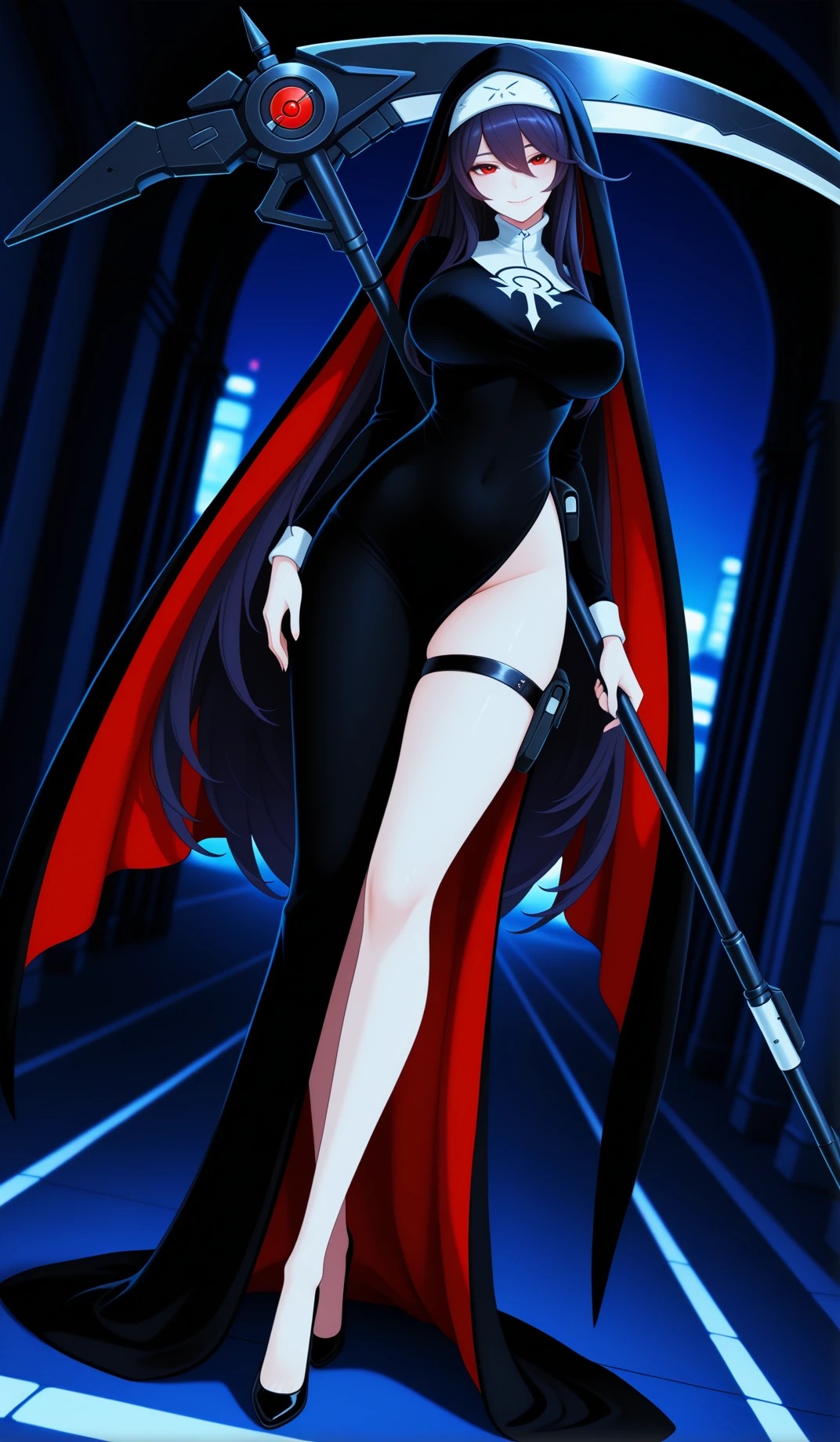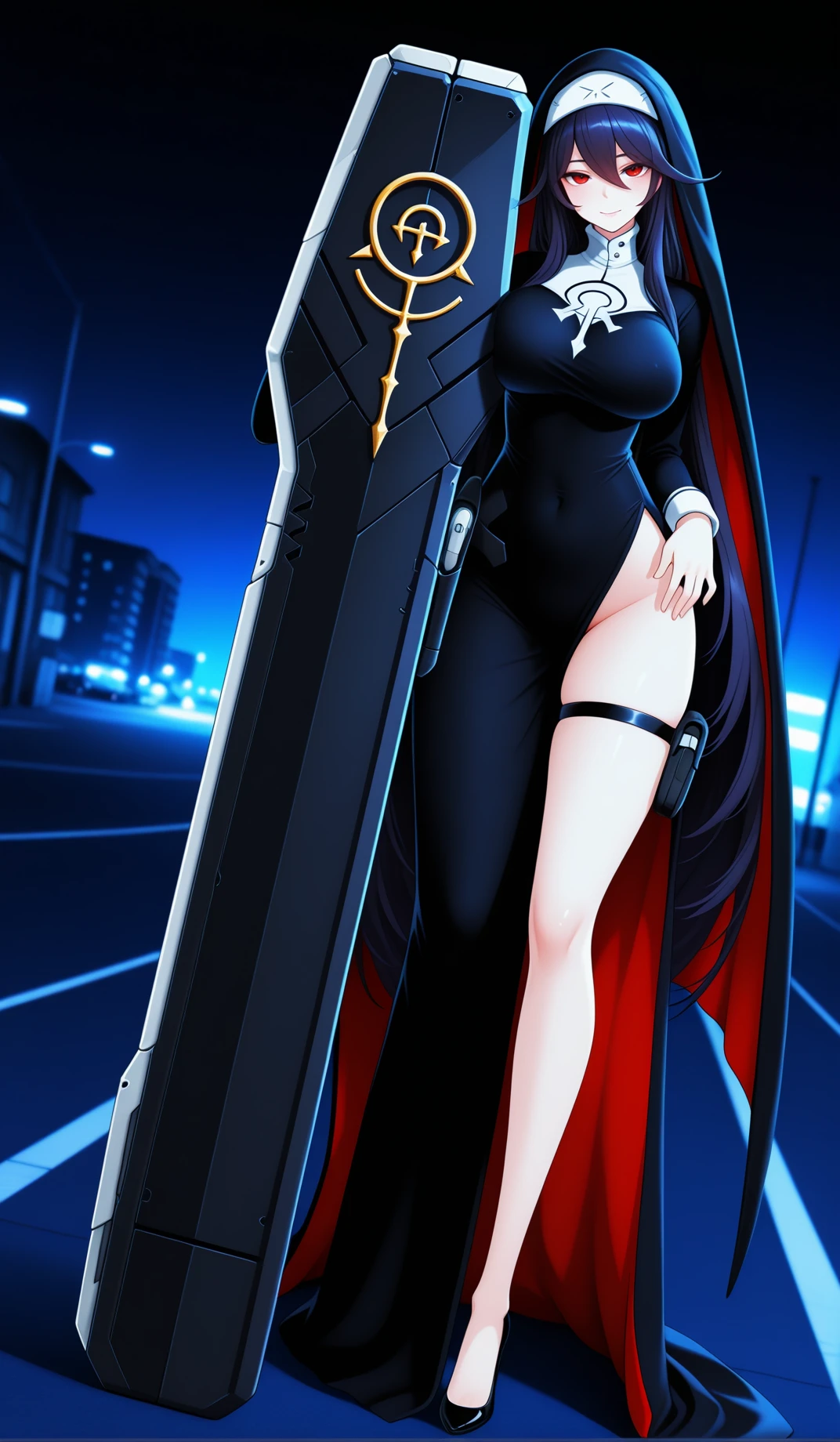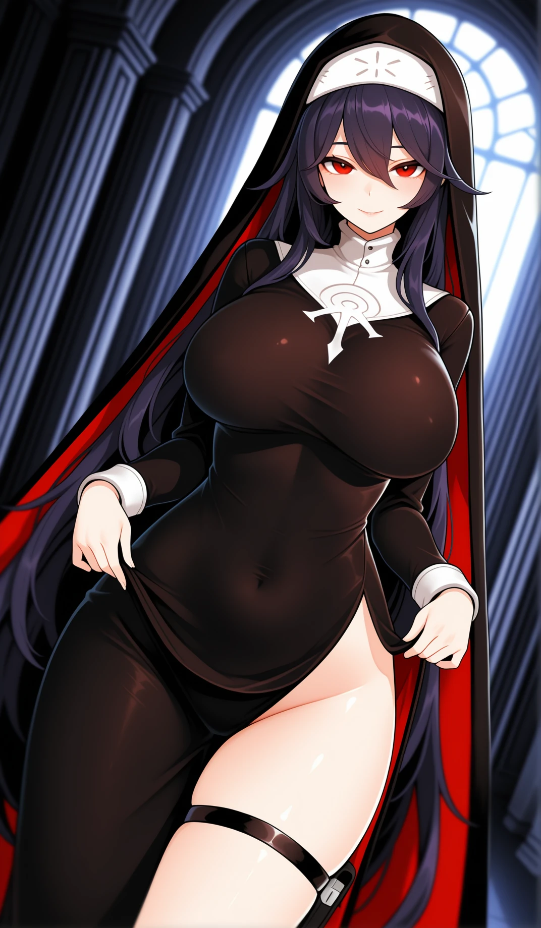 Additional prompts to specify character's appearance if necessery: very long hair, purple hair, red eyes, large breasts, taut dress, thigh, side slit dress, thigh strap