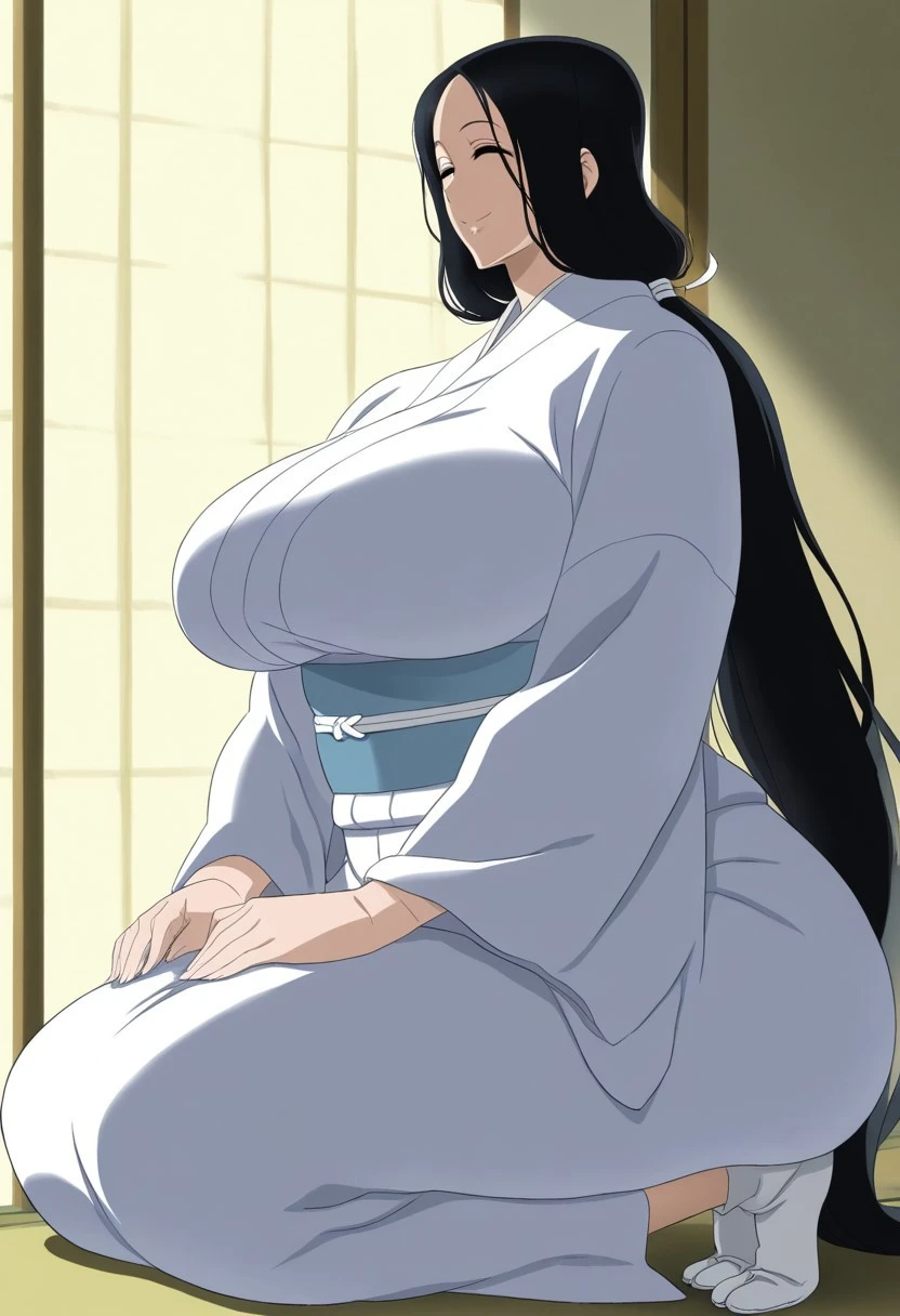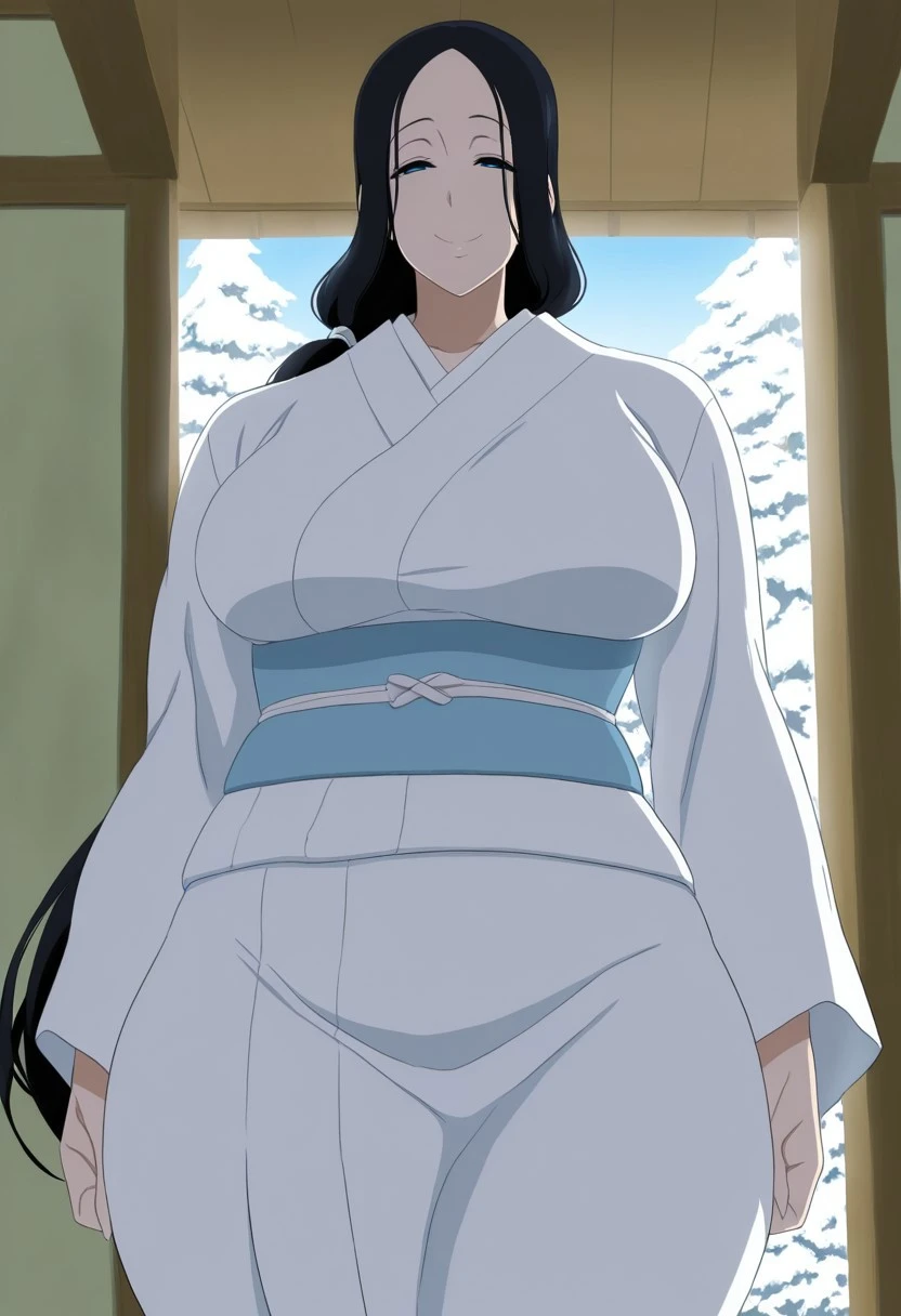 Yuki Onna, blue eyes, black hair, long hair, low ponytail