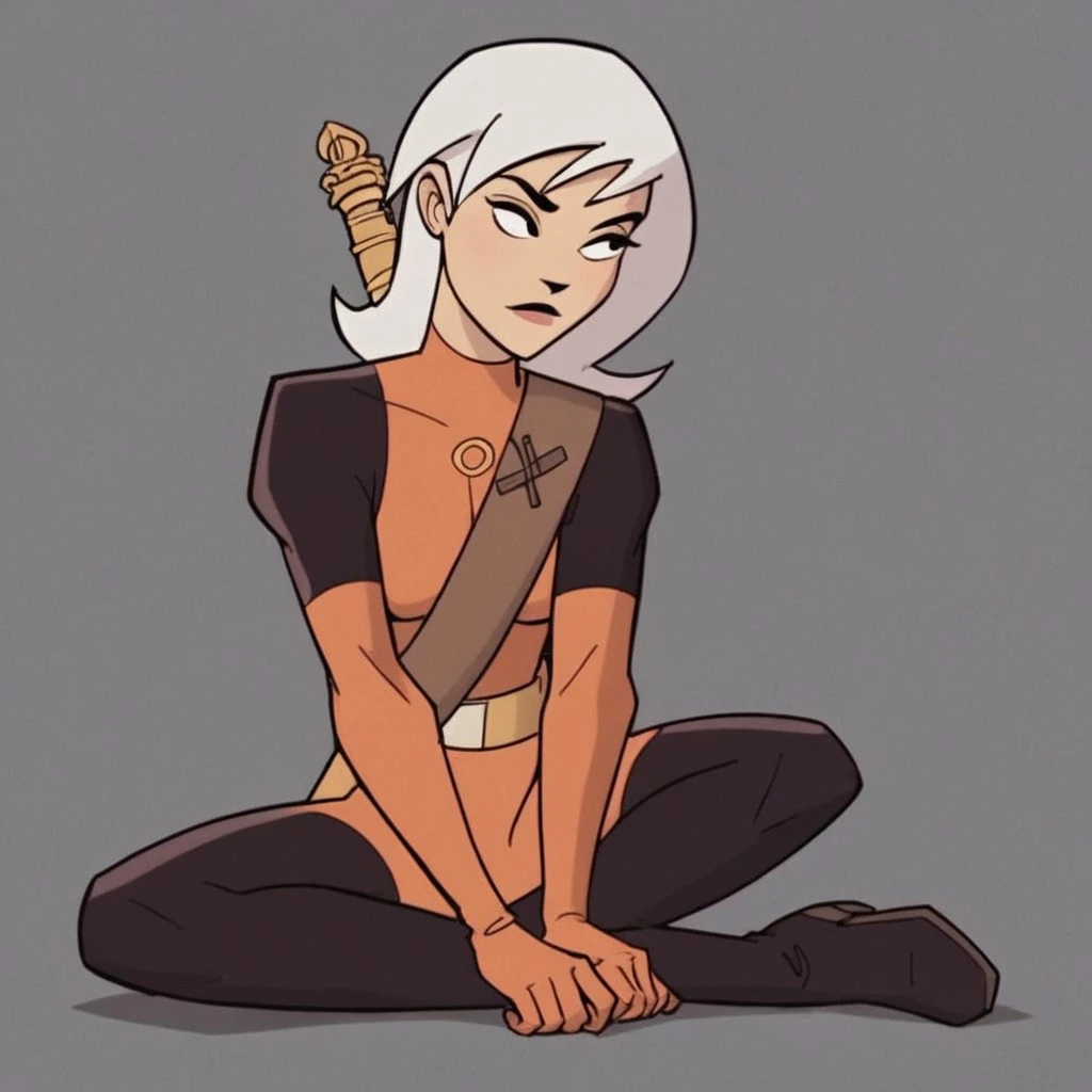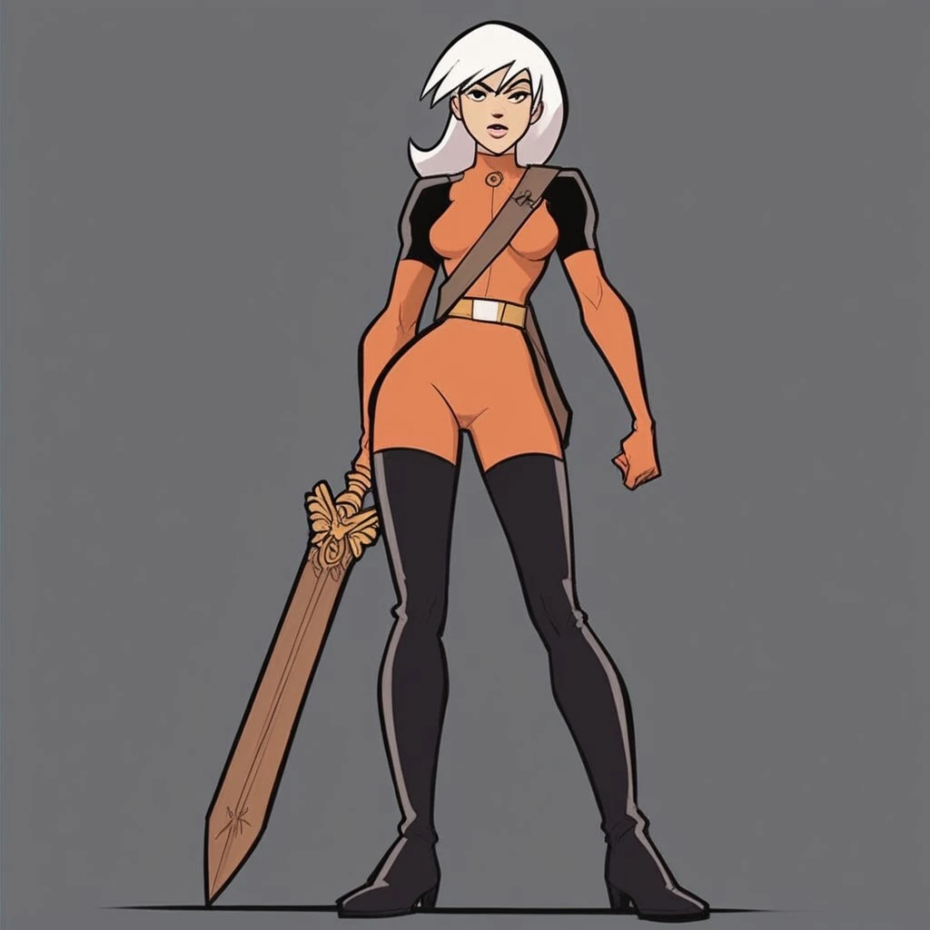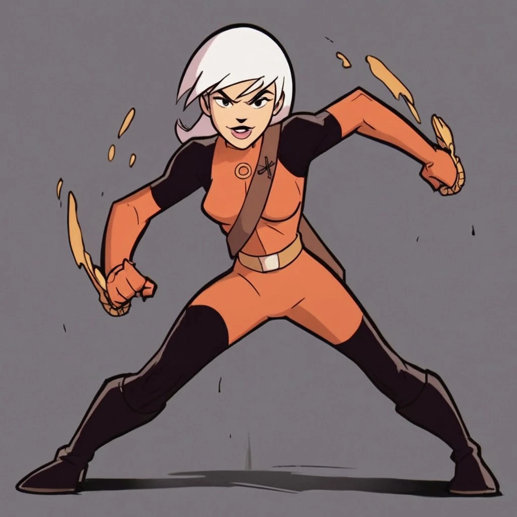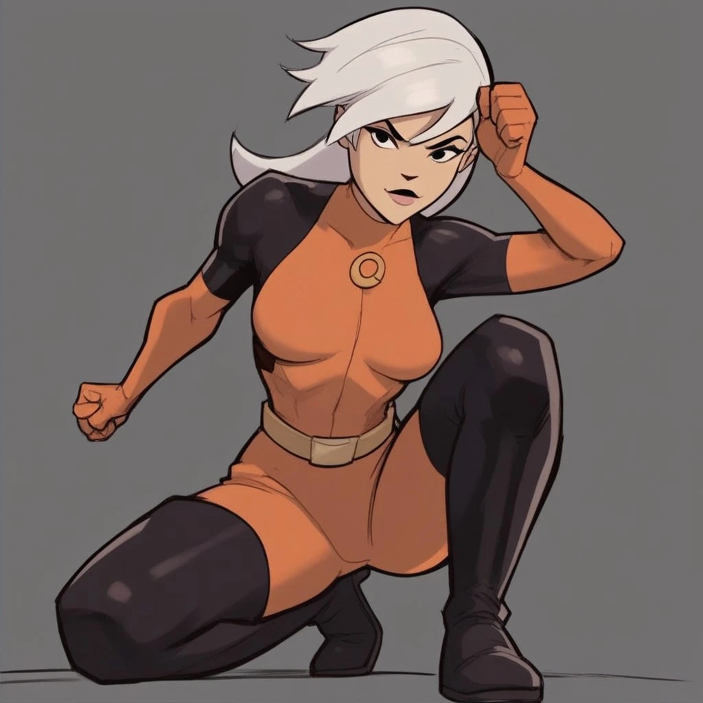 Drew, white hair, black eyes, bodysuit,