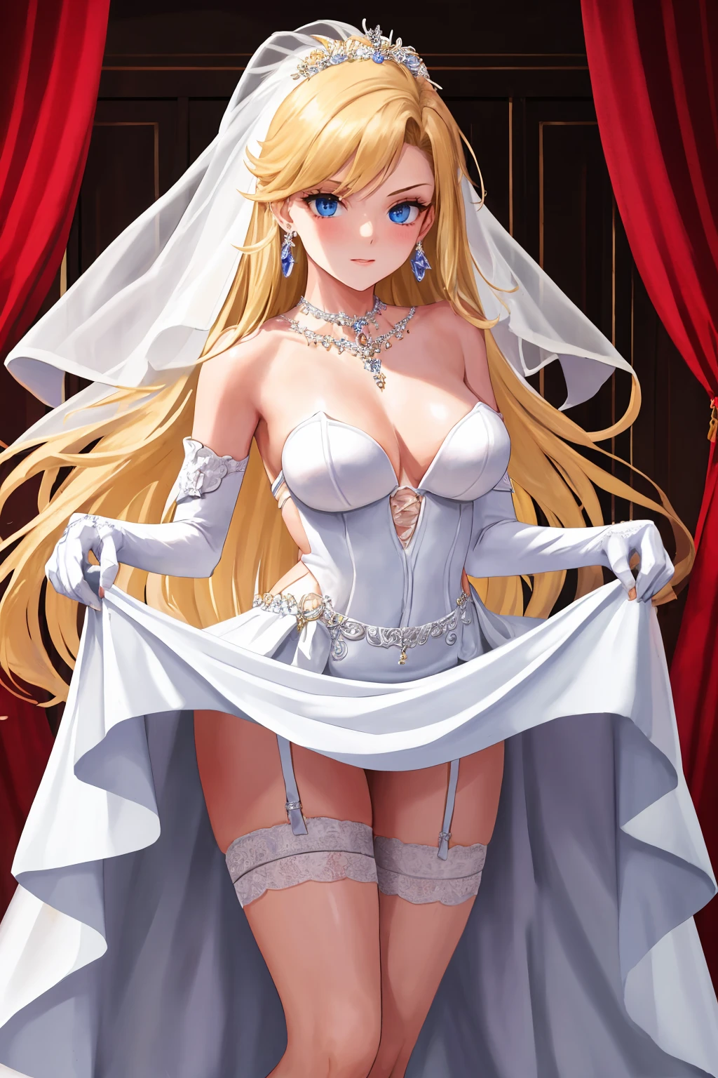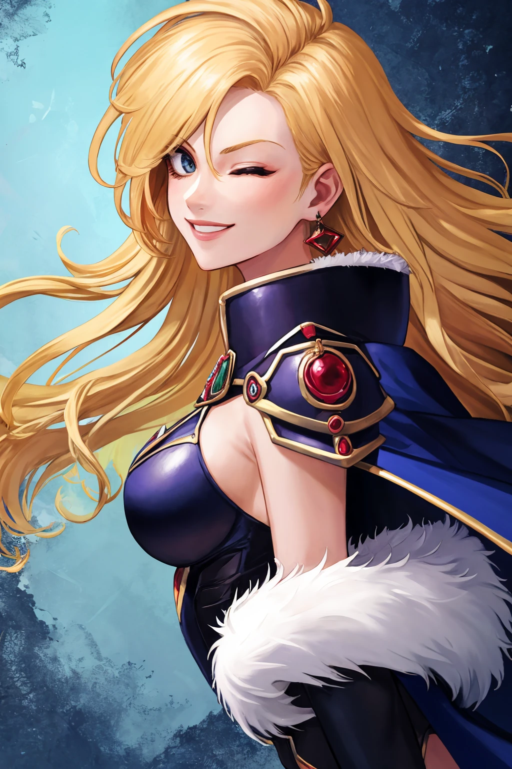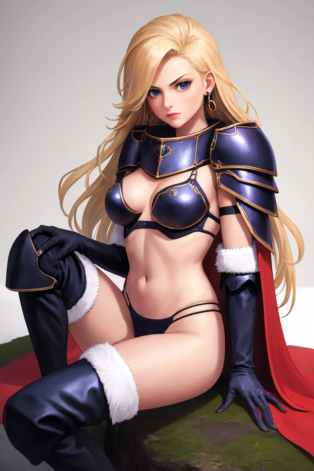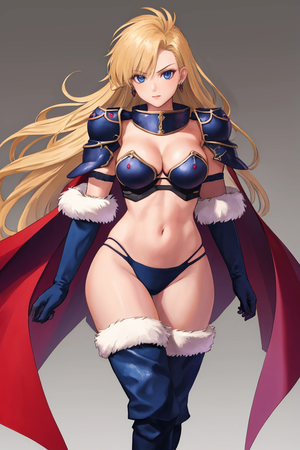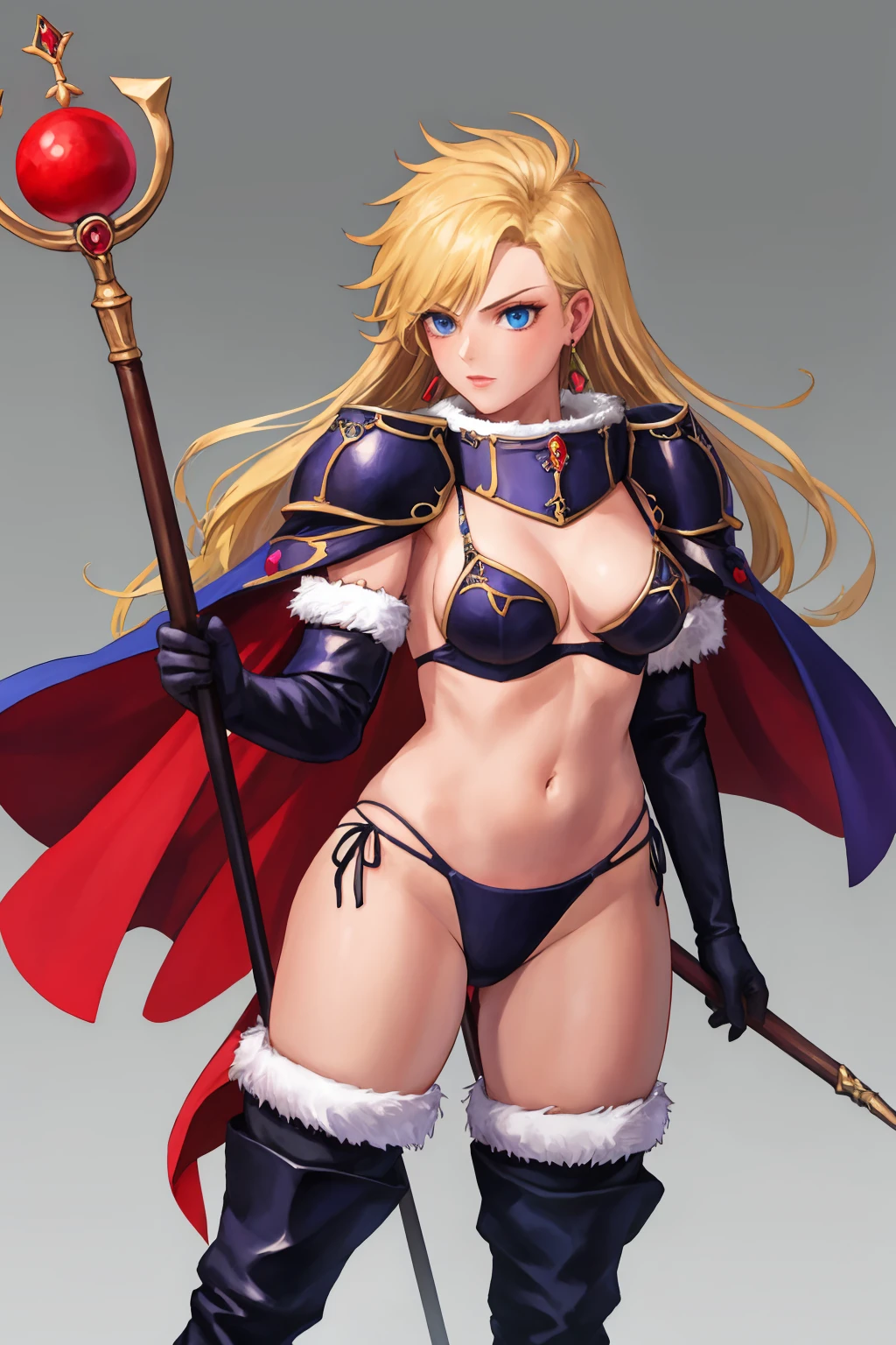 deladelon, earrings, bikini armor, cape, elbow gloves, pauldrons, thigh boots, fur trim