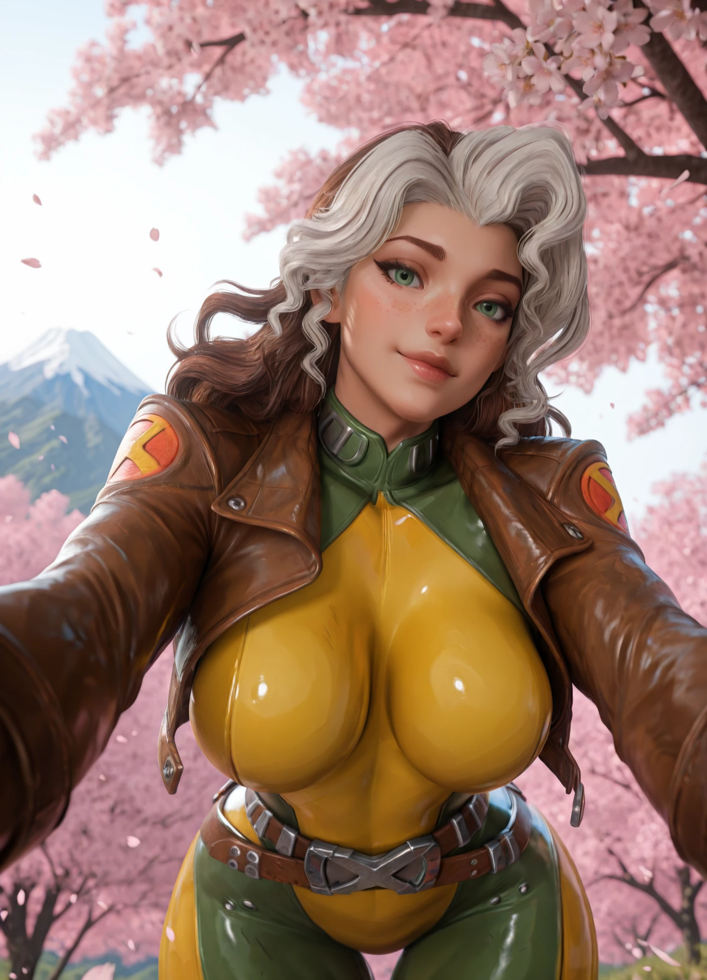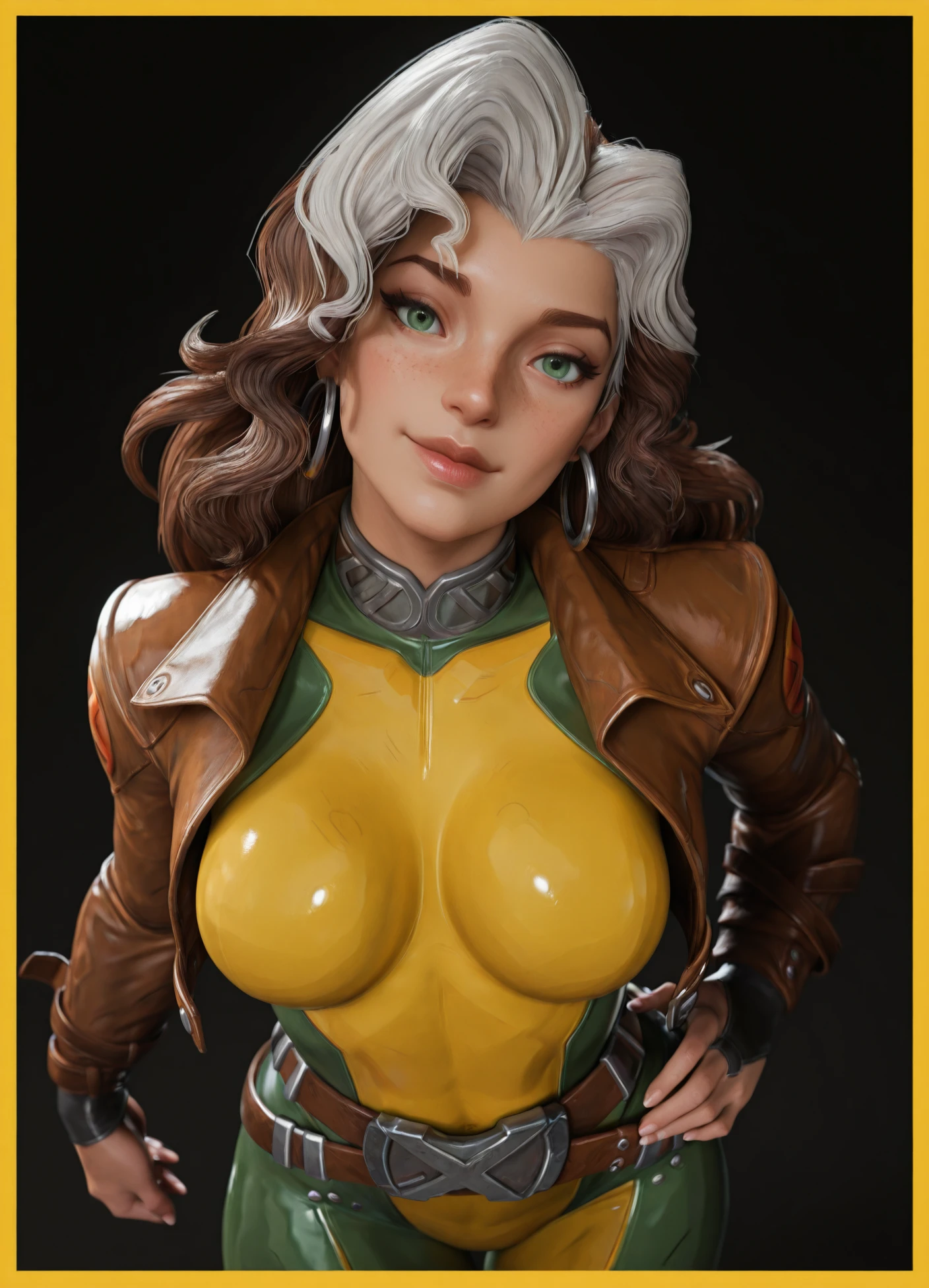 RogueR112, green eyes, belt, bodysuit, yellow bodysuit, green bodysuit, leather jacket, long hair, lips, skin tight, white hair, open clothes, multicolored hair, brown hair, multicolored bodysuit, freckles,