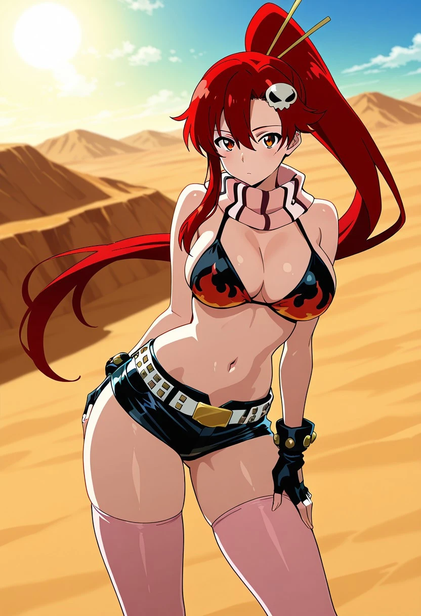 YokoStarCasual, 1girl, solo, very long hair, sidelocks, red hair, hair between eyes, amber eyes, large breasts, curvy, wide hips, navel, midriff, bikini top only, navel, skull hair ornament, black fingerless elbow gloves, uneven gloves, asymmetrical gloves, ponytail, no shirt, pink thighhighs, black short shorts, flame print bikini, hair stick, studded belt, cleavage, bare shoulders, striped pink scarf, skindentation, black and red bikini, high ponytail, covered ???????, anti-materiel rifle, white calf-length zipper boots,Yoko Star Assistant
