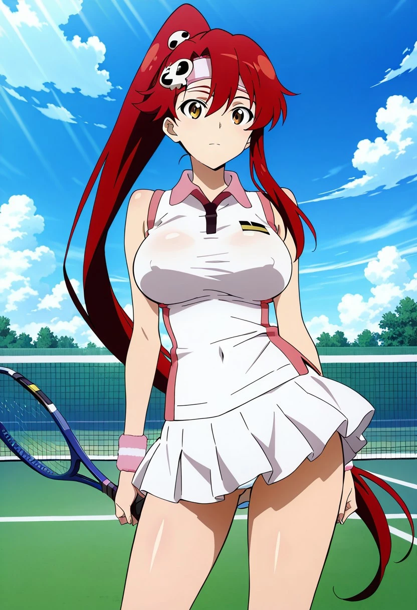 YokoTennis, 1girl, solo, very long hair, sidelocks, red hair, hair between eyes, amber eyes, large breasts, curvy, wide hips, covered navel, covered ???????, white tennis uniform, frilled white panties, ponytail, sportswear, skull hair ornament, wristband, headband, pleated miniskirt, tennis racket, breasts, white socks, white sneakers,Description