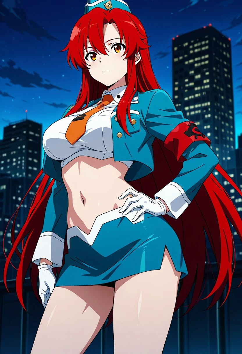 YokoStarAssistant, 1girl, solo, very long hair, sidelocks, red hair, hair between eyes, amber eyes, large breasts, curvy, wide hips, navel, midriff, orange necktie, blue garrison cap, uniform, armband, white crop top, blue cropped jacket, white white gloves, blue miniskirt, high heels, red shoes,