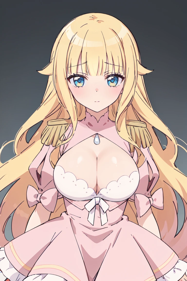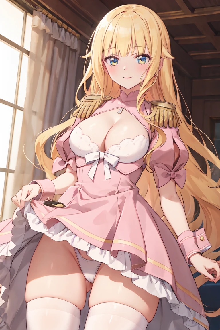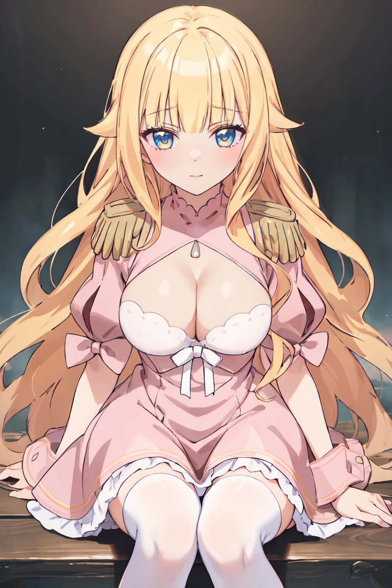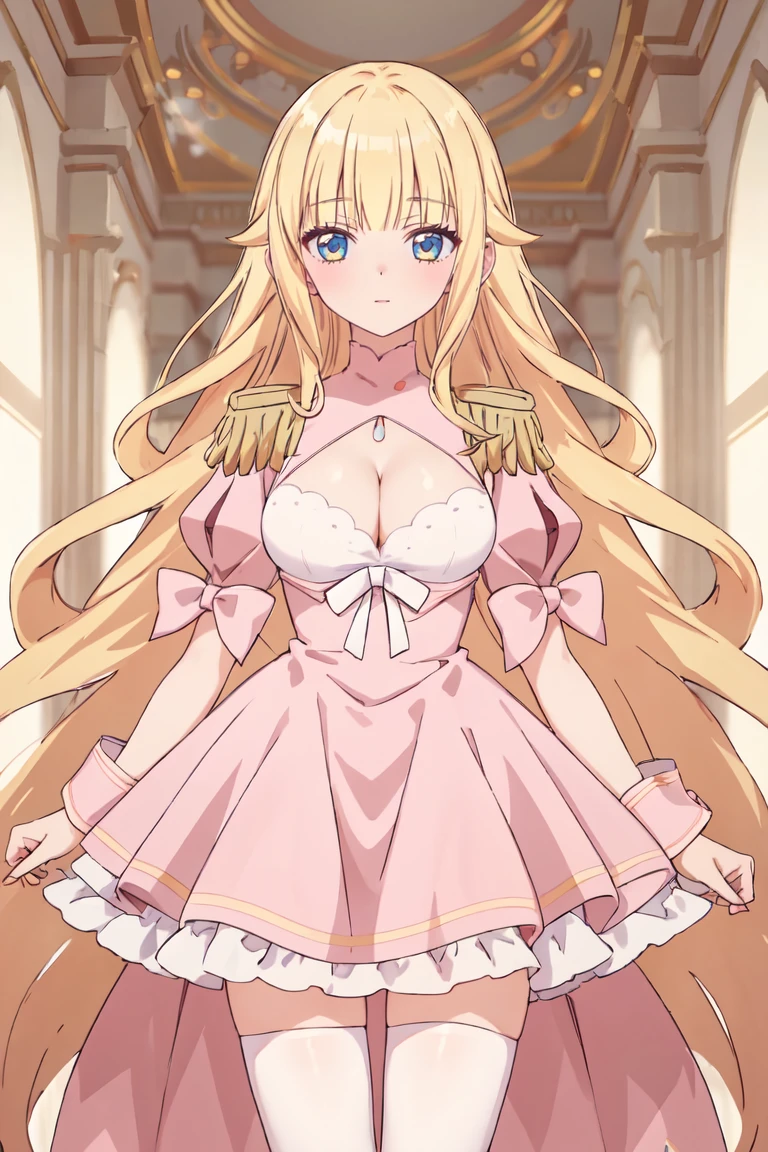 Outfit: pink dress, frilled dress, epaulettes, cleavage cutout, puffy short sleeves, wrist cuffs, white thighhighs.