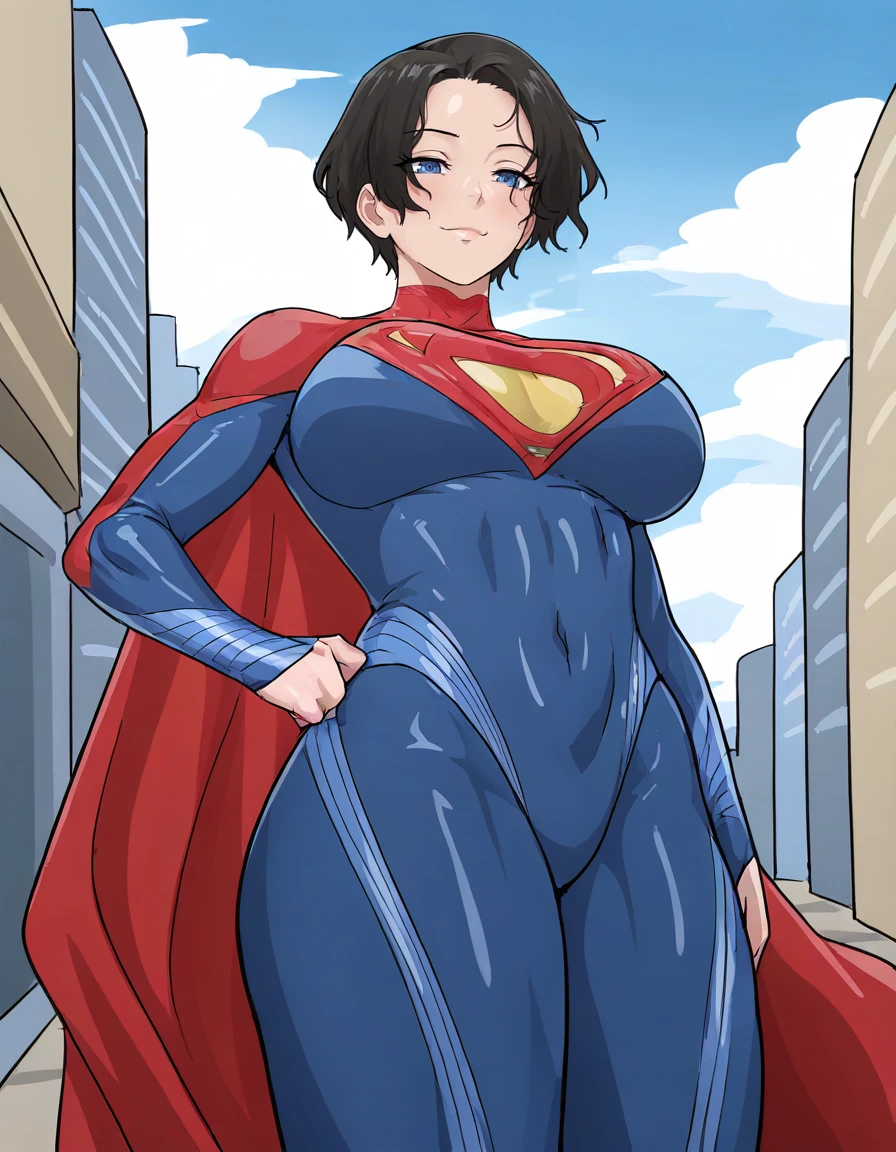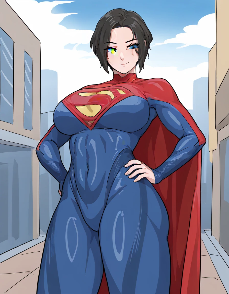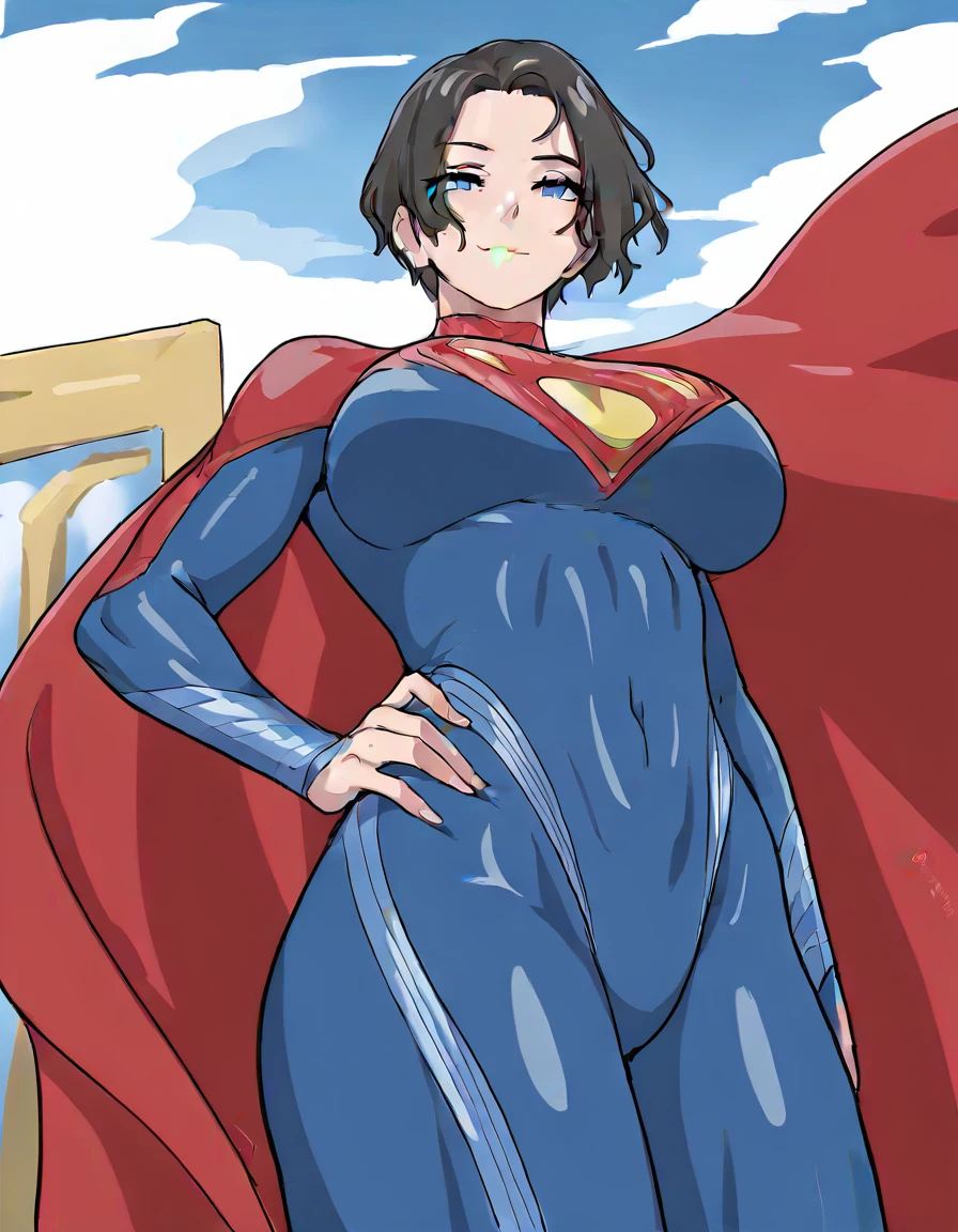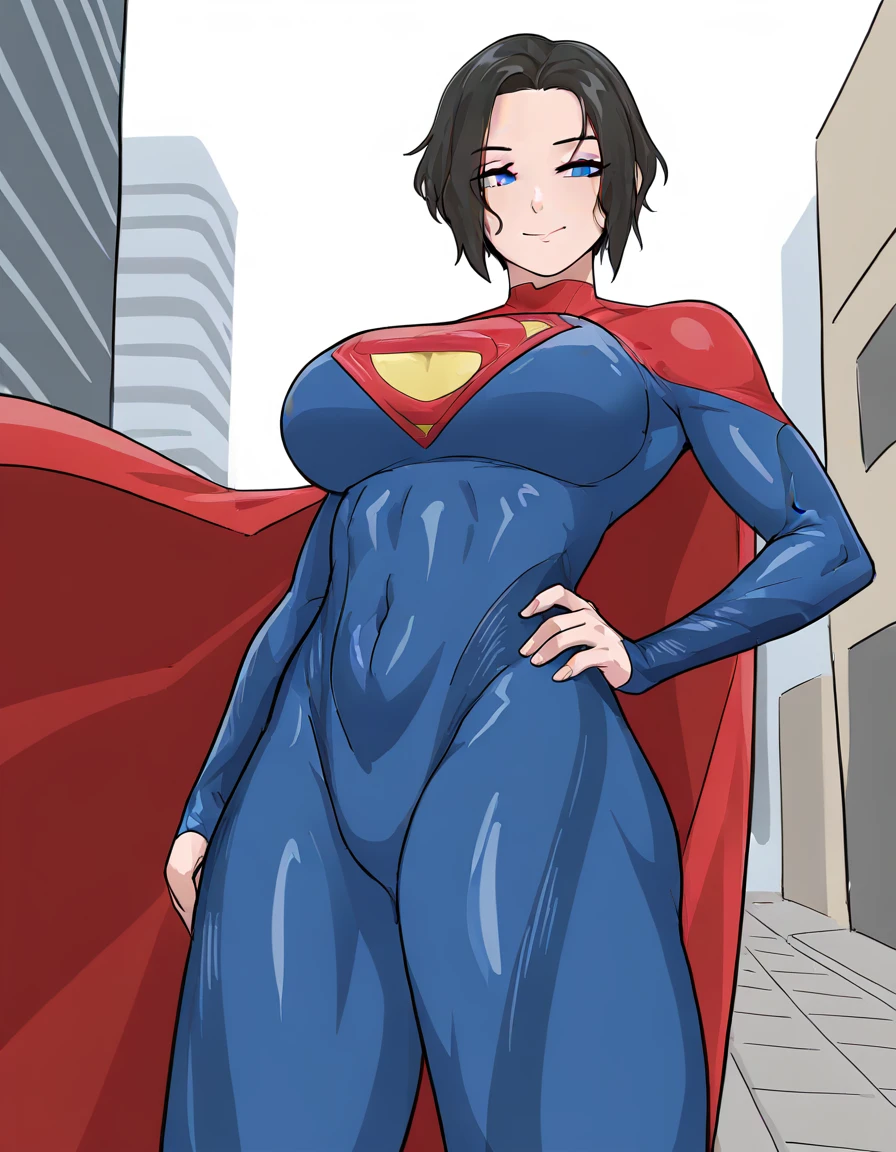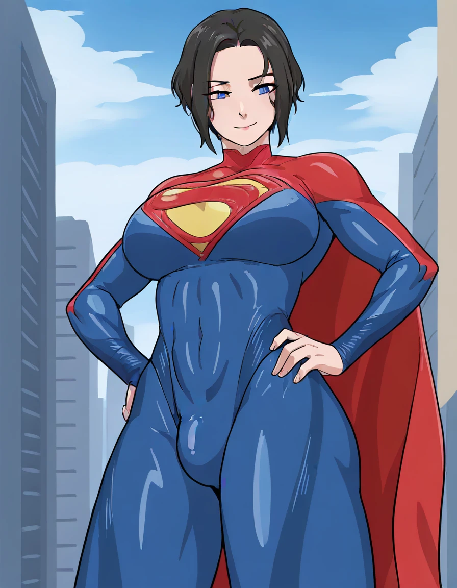 Outfit1: superhero, cape, red cape, floating cape, blue bodysuit, covered navel