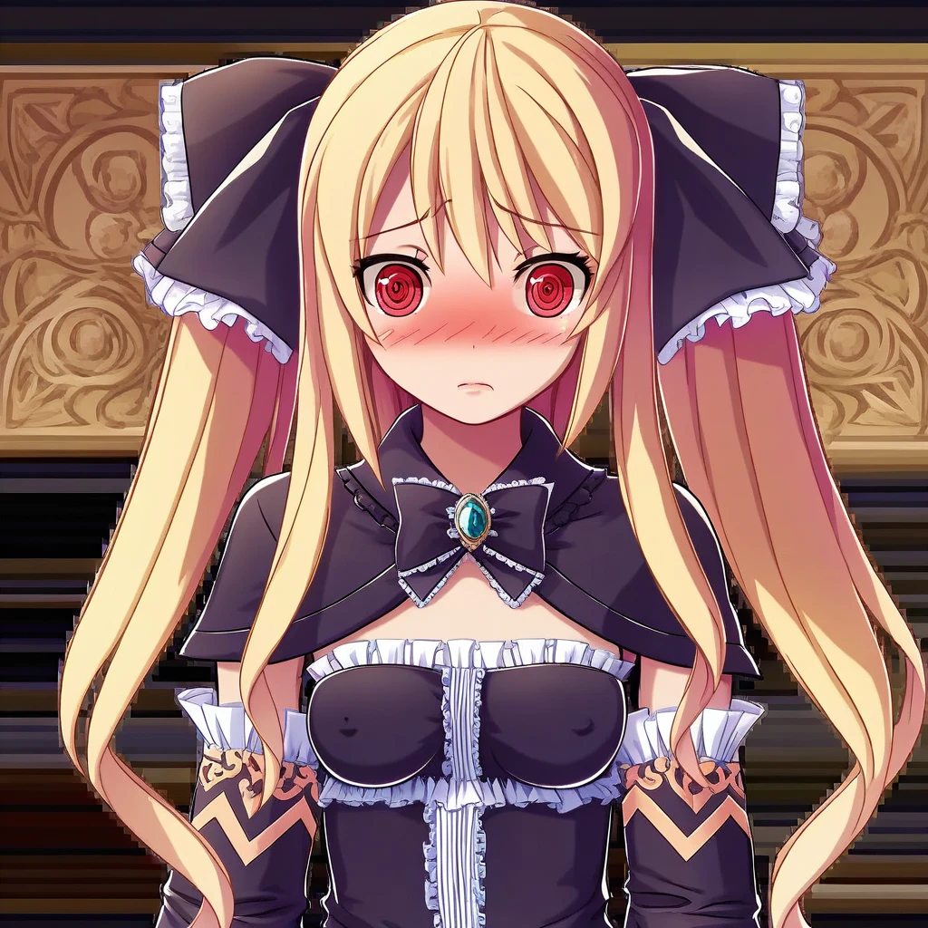 Helpful prompts: sheryl, blonde hair, long hair, twintails, hair ribbon, red eyes, medium breast,
