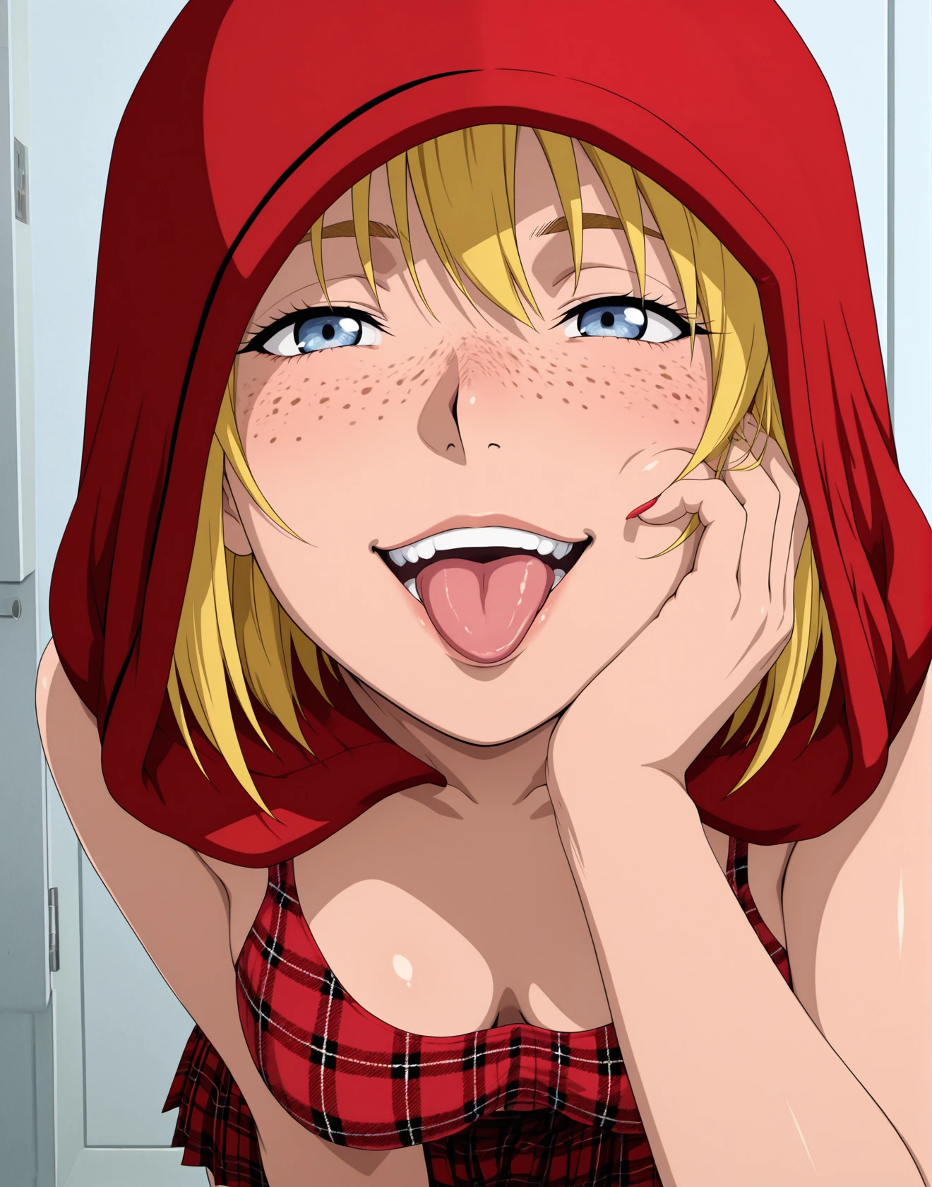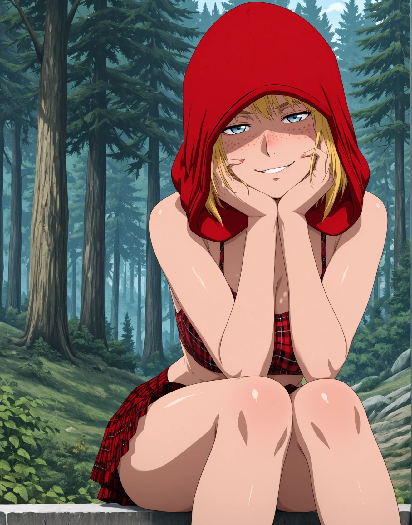 (((source_anime, anime coloring))), SineSK, blond hair, red hood, hood, freckles, plaid, skirt,