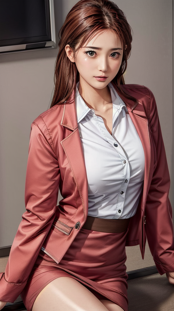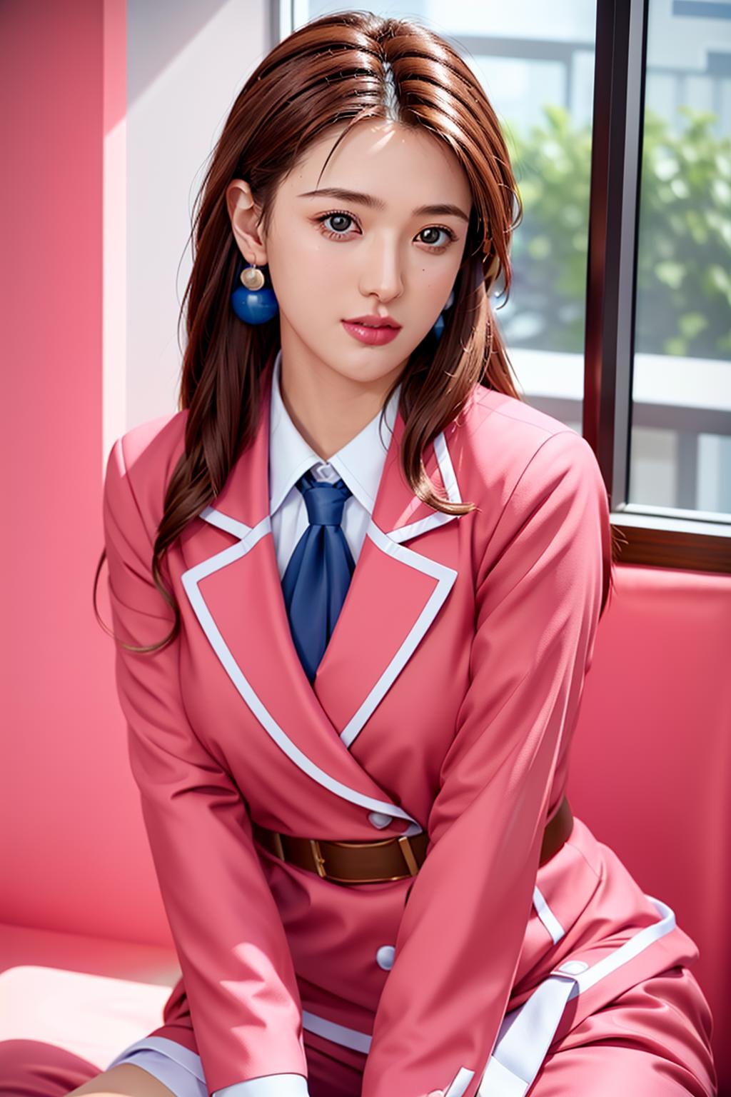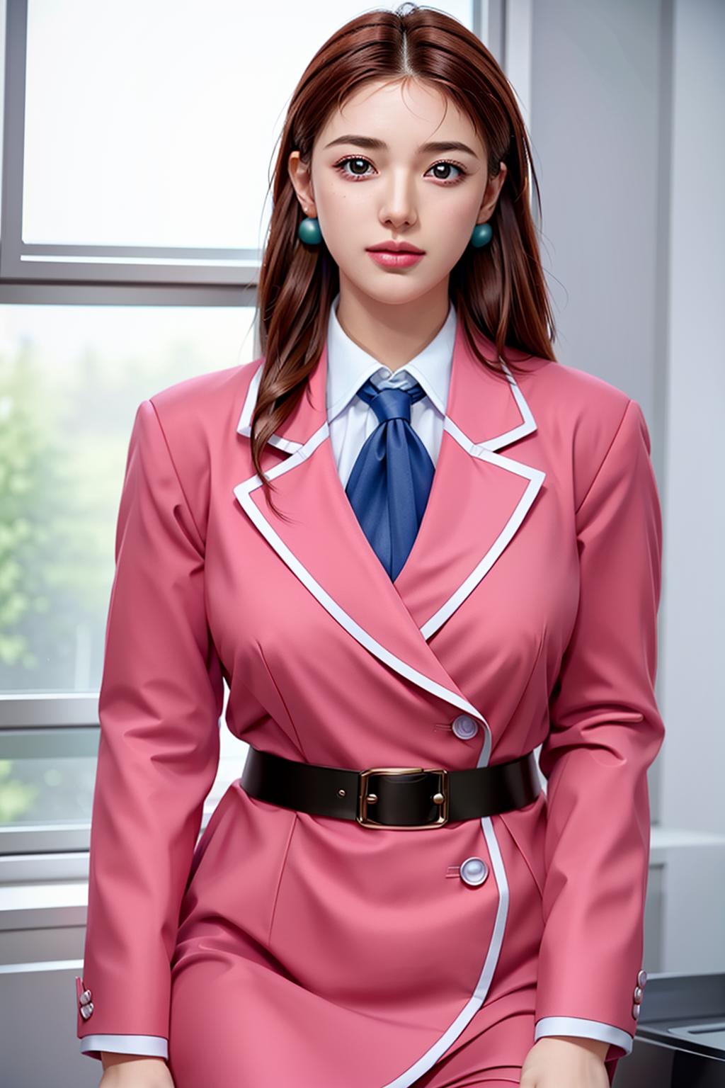 pink pencil skirt, pink jacket,collared shirt, white shirt, blue necktie,belt,