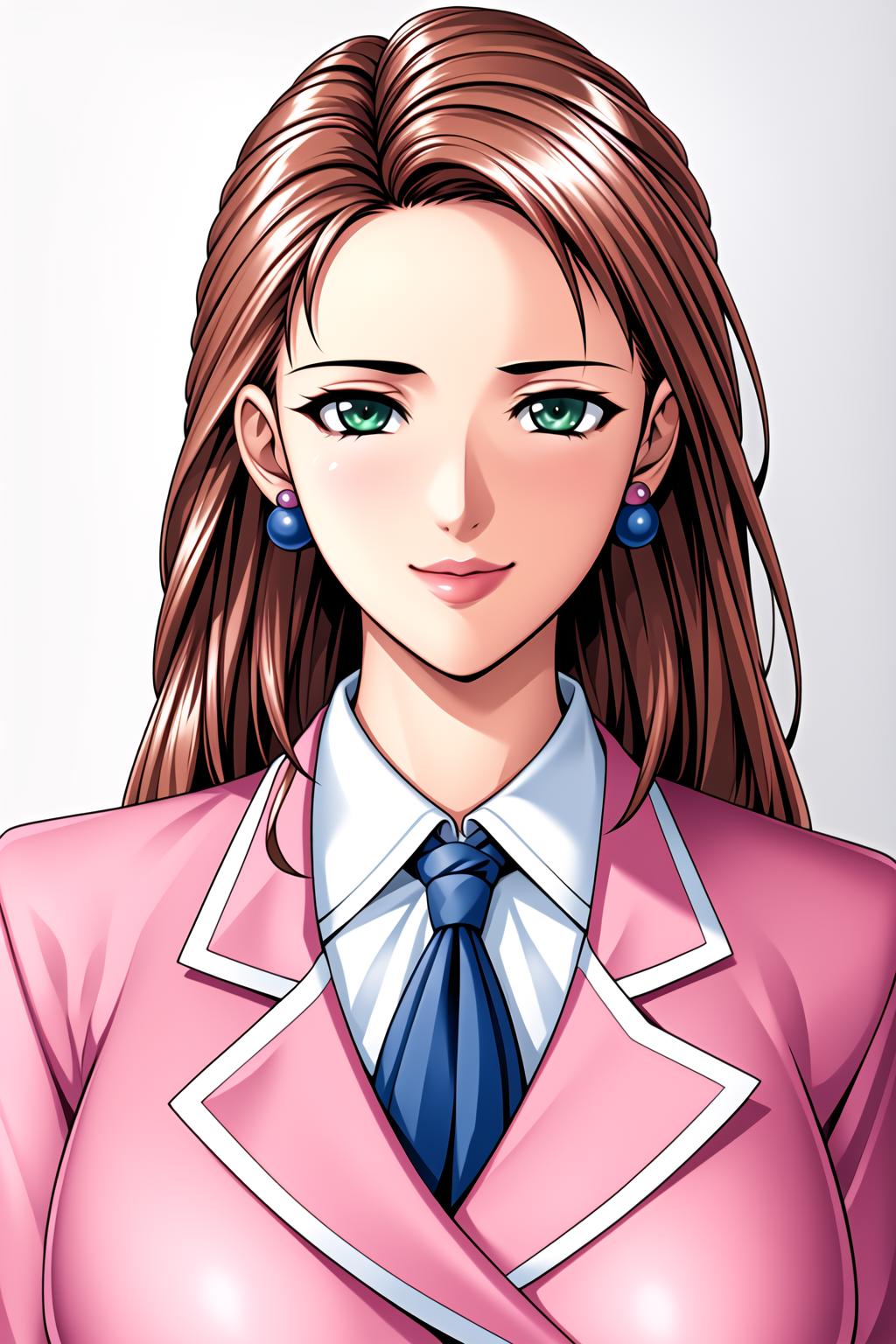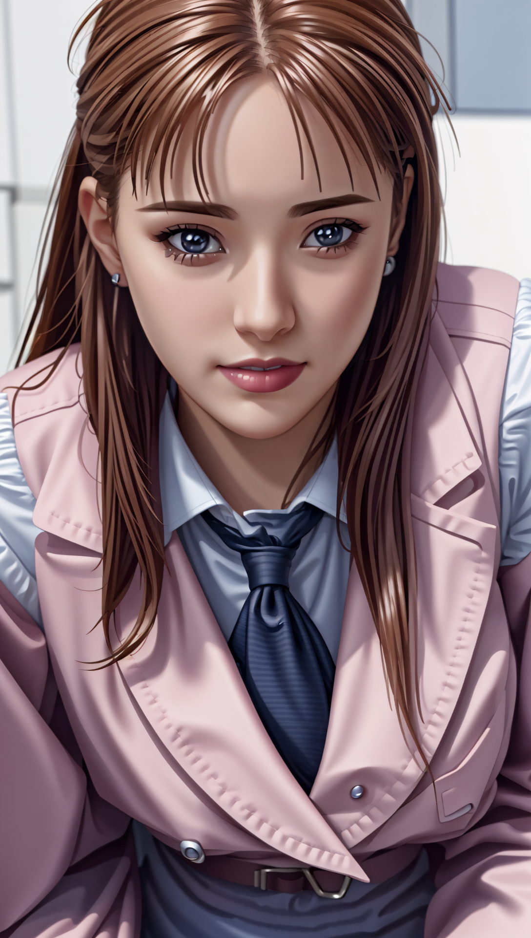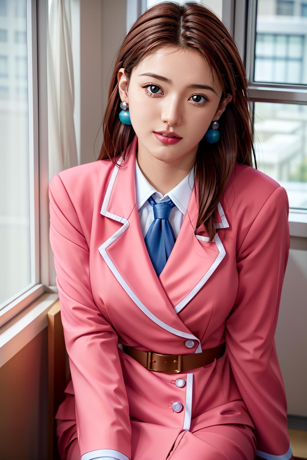 pink pencil skirt, pink jacket,collared shirt, white shirt, blue necktie,belt,