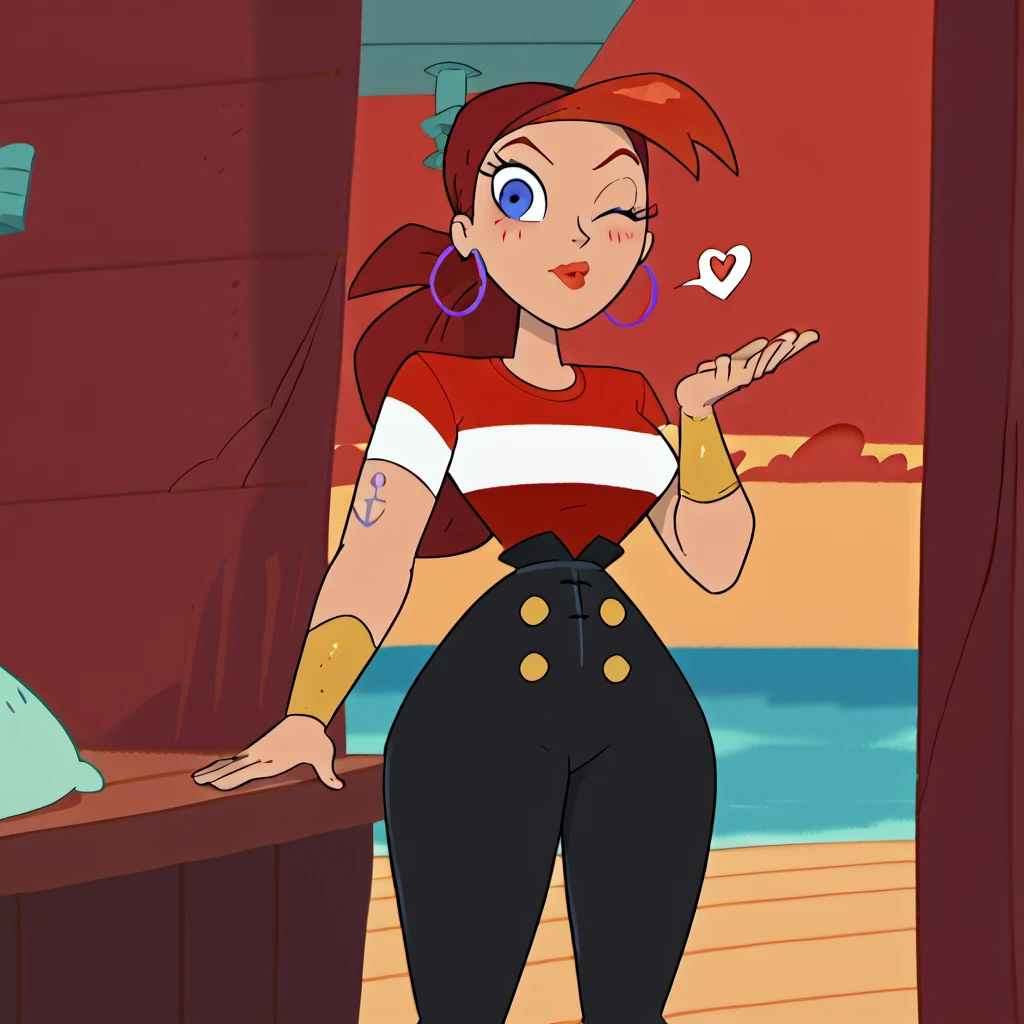 l3cmcbn, jewelry, standing, 1 girl, hoop earrings, solo, blue eyes, bandana, red hair, striped, red shirt, pants, tatoo