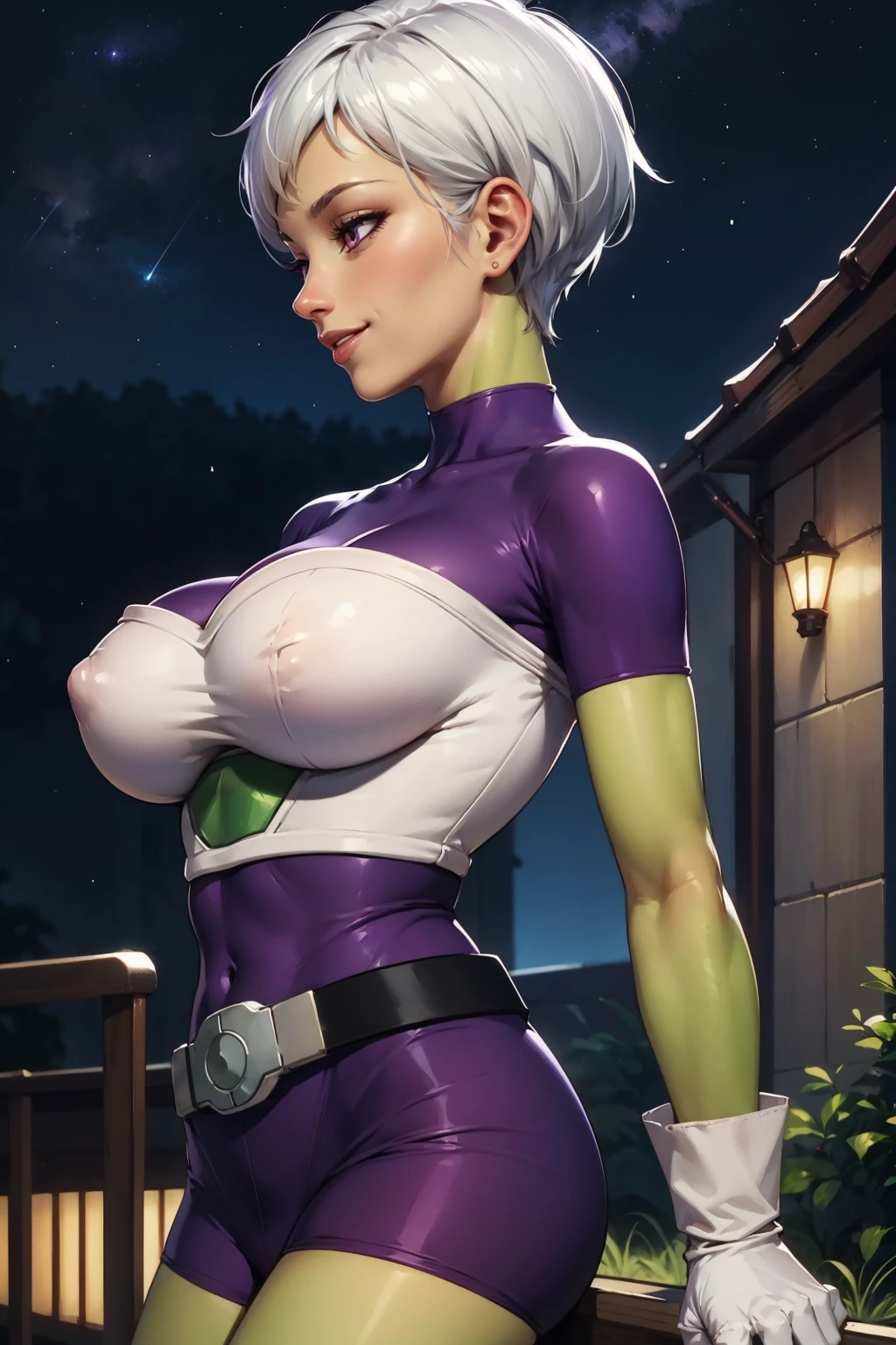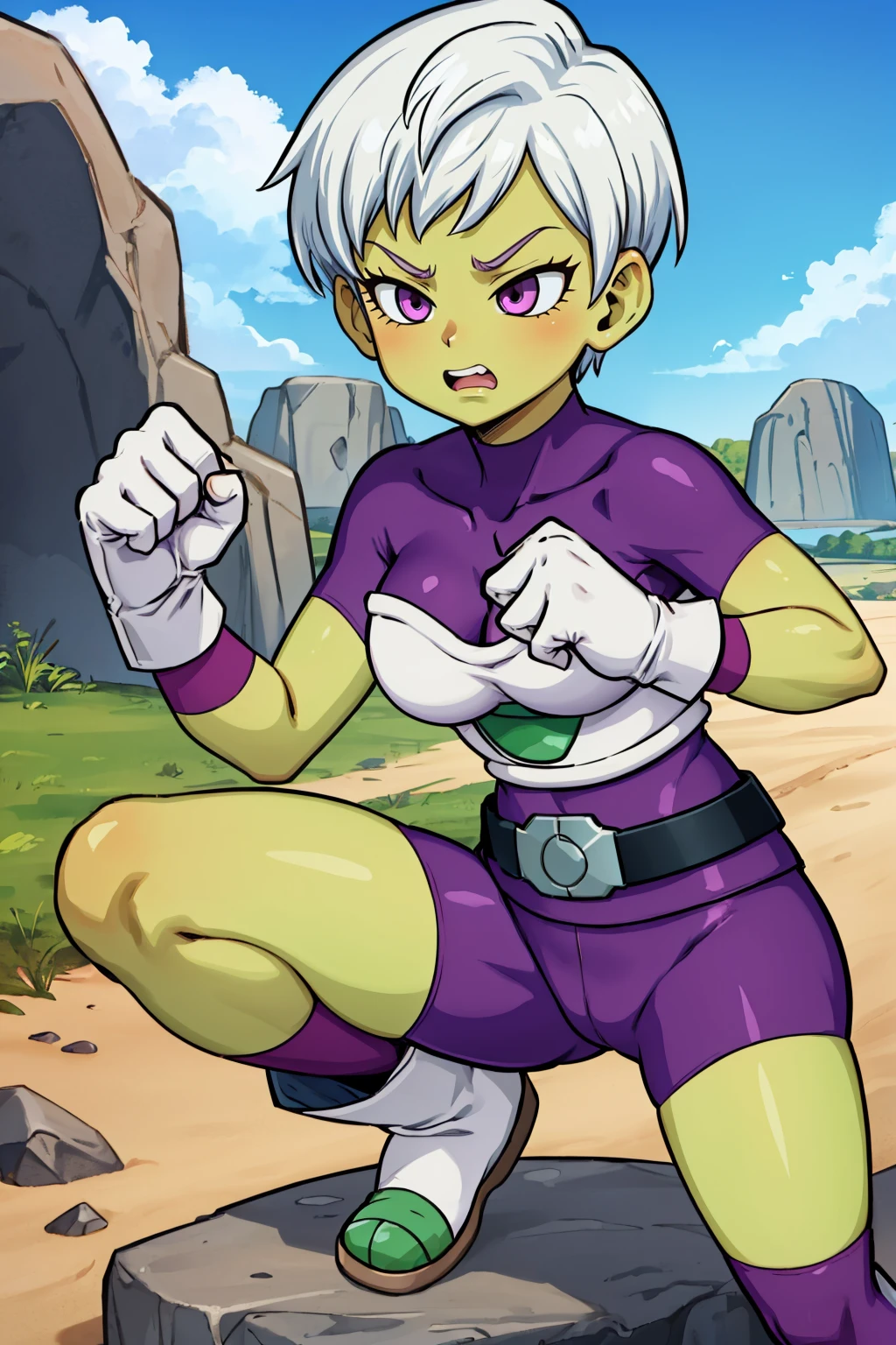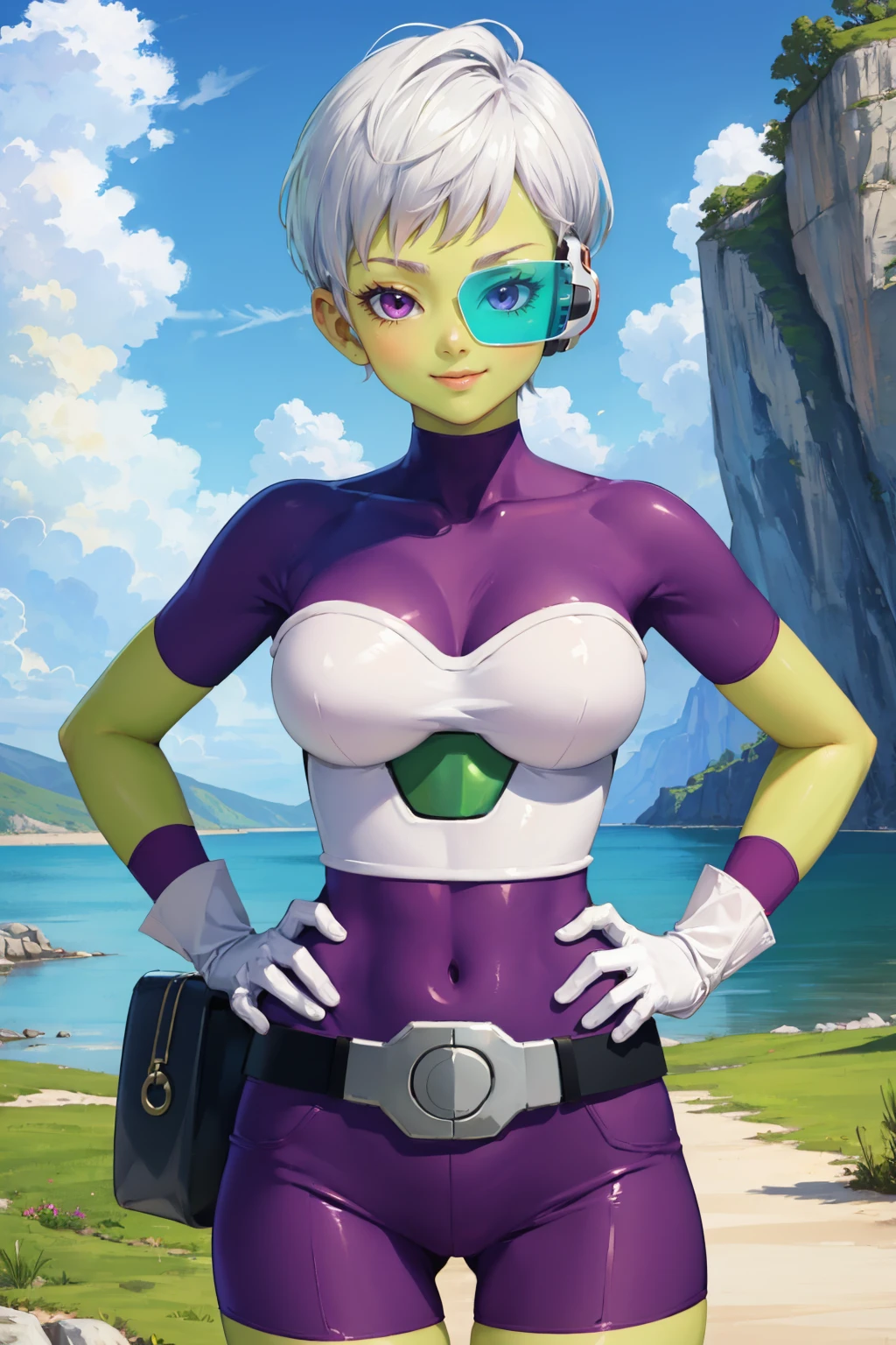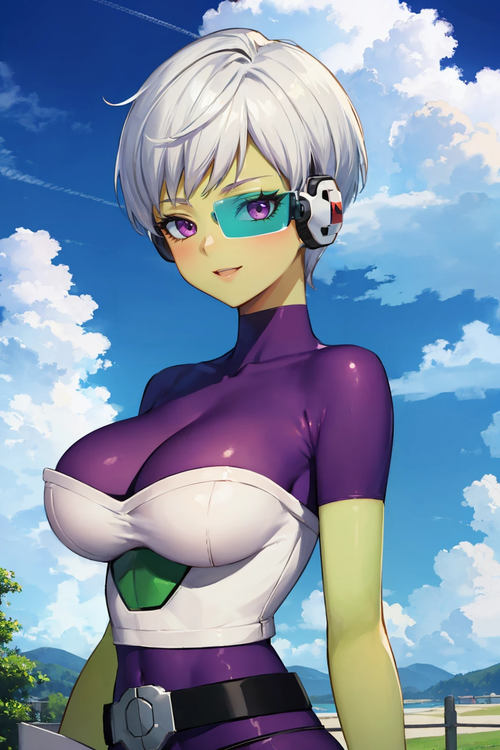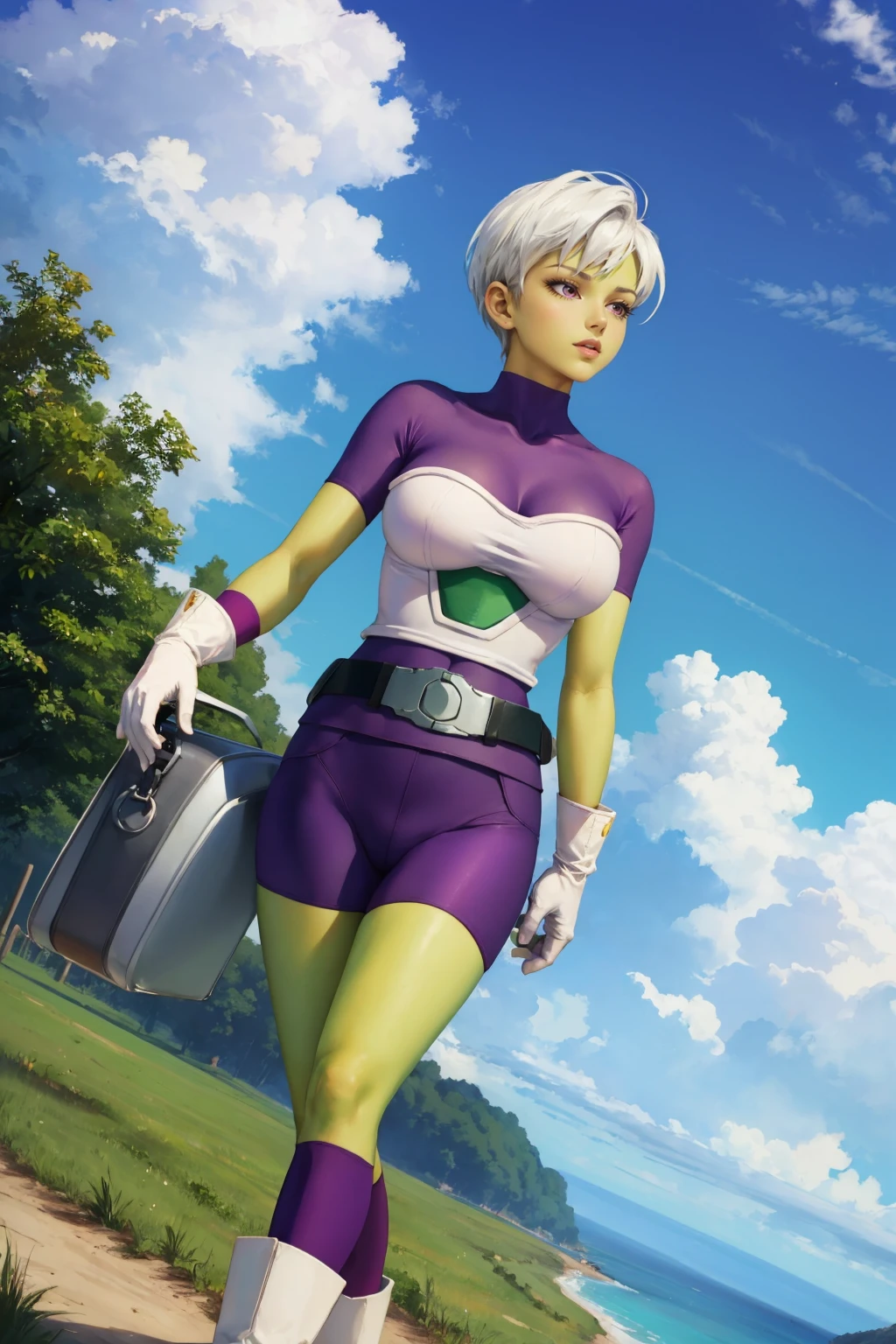 Add "purple bodysuit, short sleeves, purple shorts, belt, armor, white gloves, boots" for her typical look.