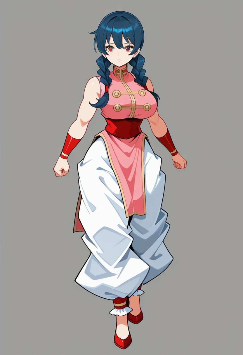 kou67, solo, 1girl, white sport footwear, black long dougi belt, tight long cyan sleeves, red dougi pants, red dougi pants, black fingerless gloves, white sport footwear, tight white and cyan clothes