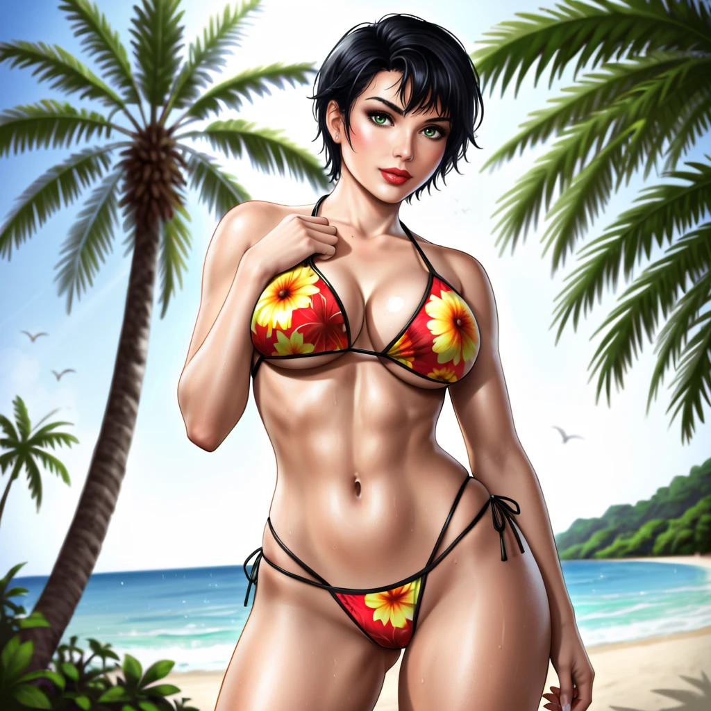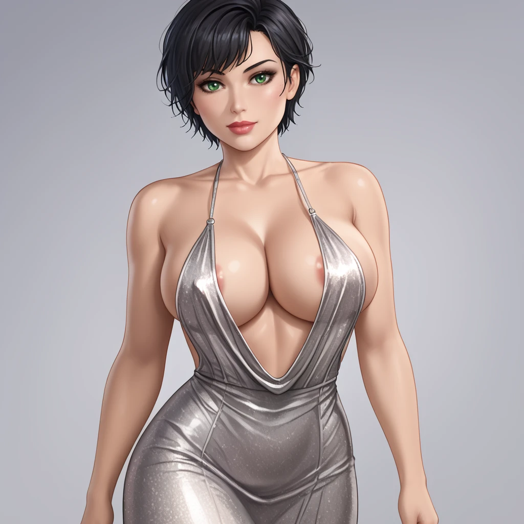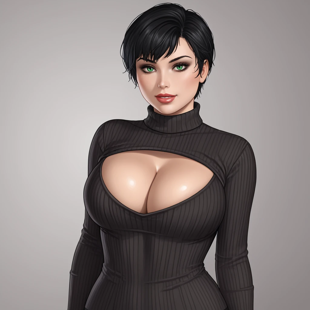 Trigger with casual clothes: CatwomanArkhamCity, 1girl, solo, black hair, large breasts, green eyes, short hair, curvy, cowboy shot, sweater, jeans