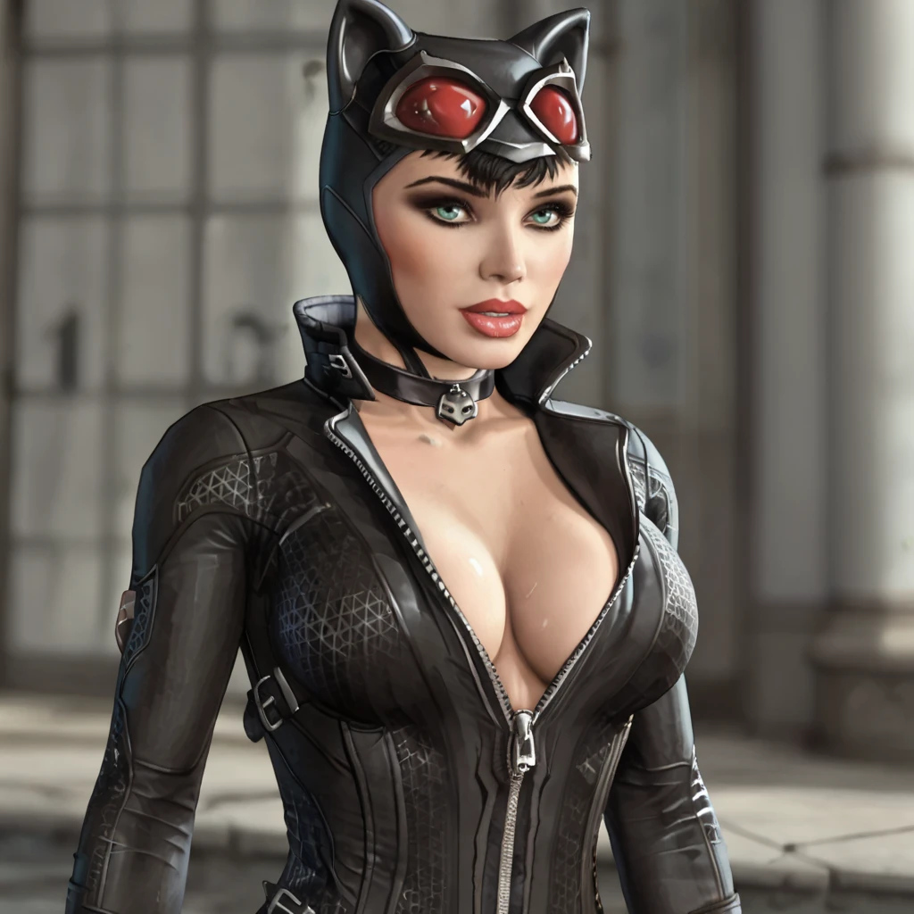Trigger : CatwomanArkhamCity, 1girl, large breasts, bodysuit, animal ears, cleavage, choker, zipper, mask, lips, unzipped, gloves, cowboy shot