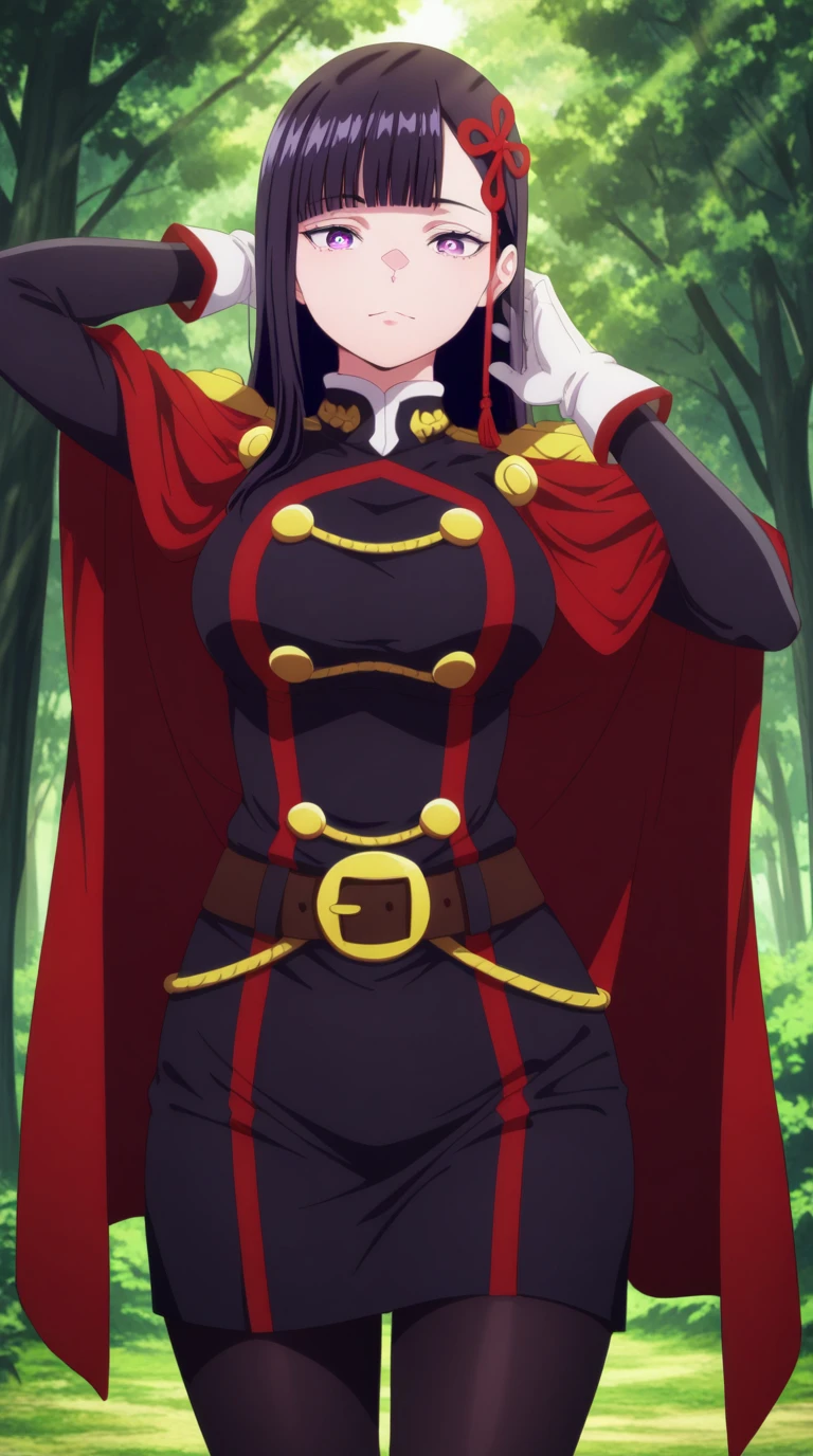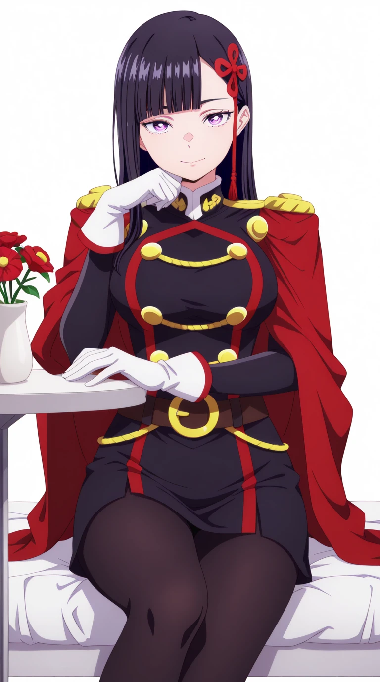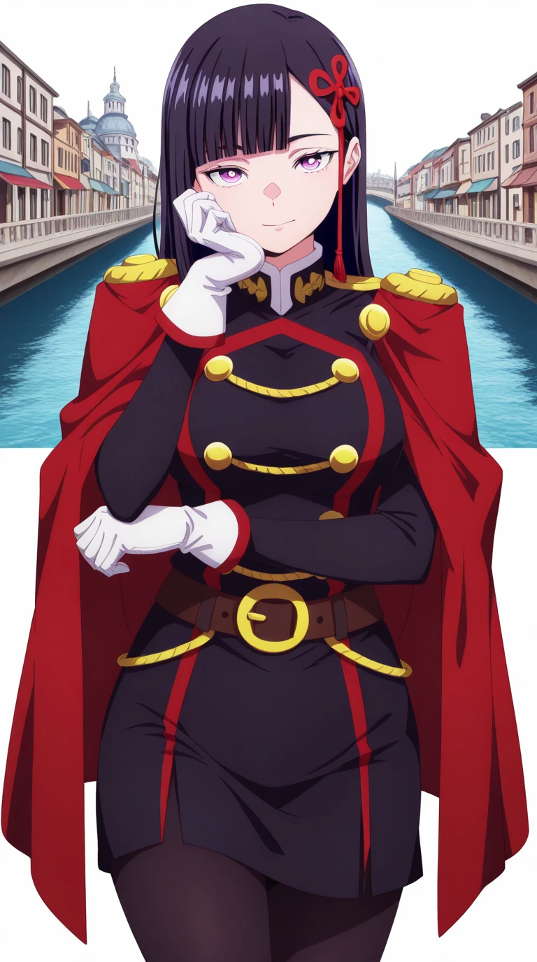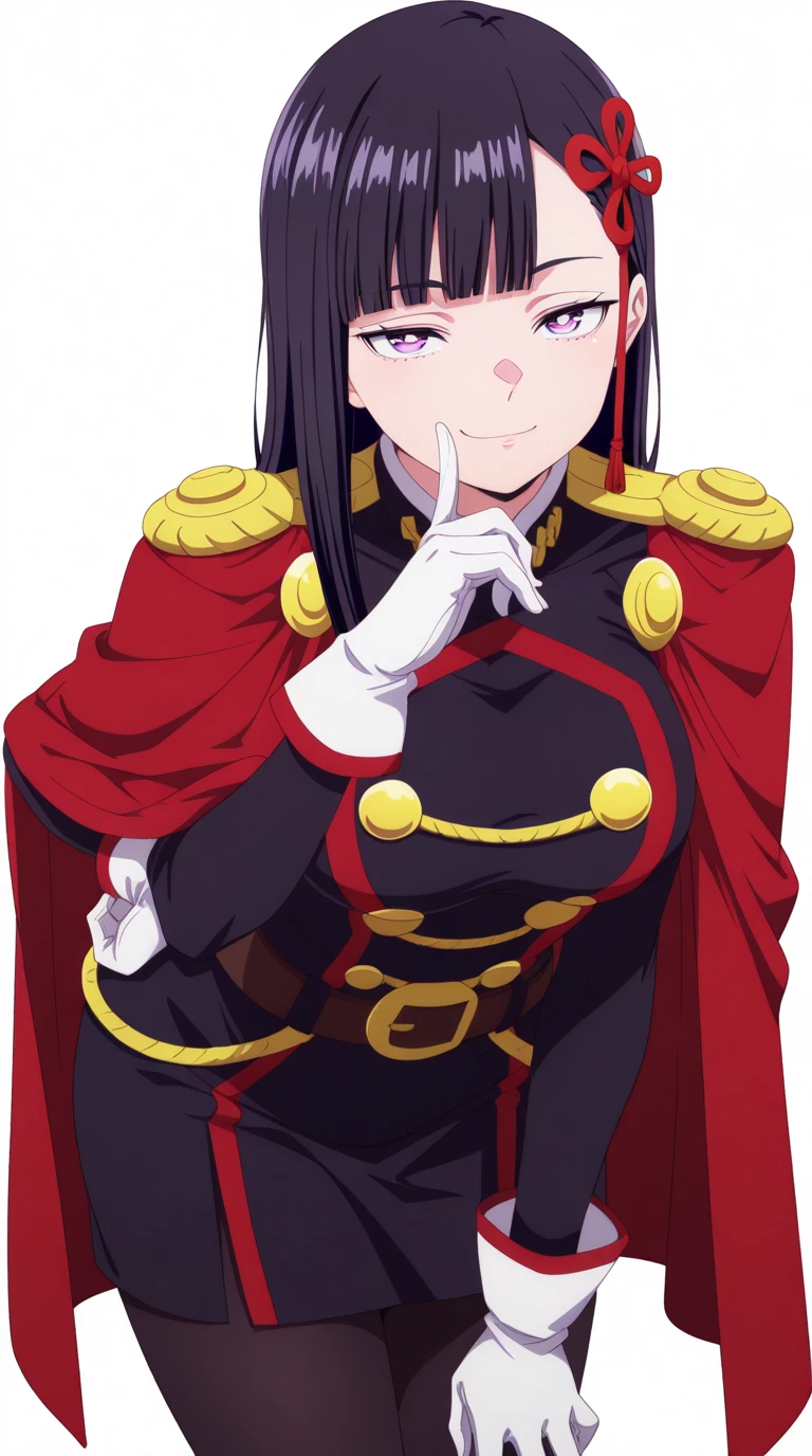 gloves, pantyhose, white gloves, uniform, black pantyhose, military uniform, belt, cape, red cape, epaulettes