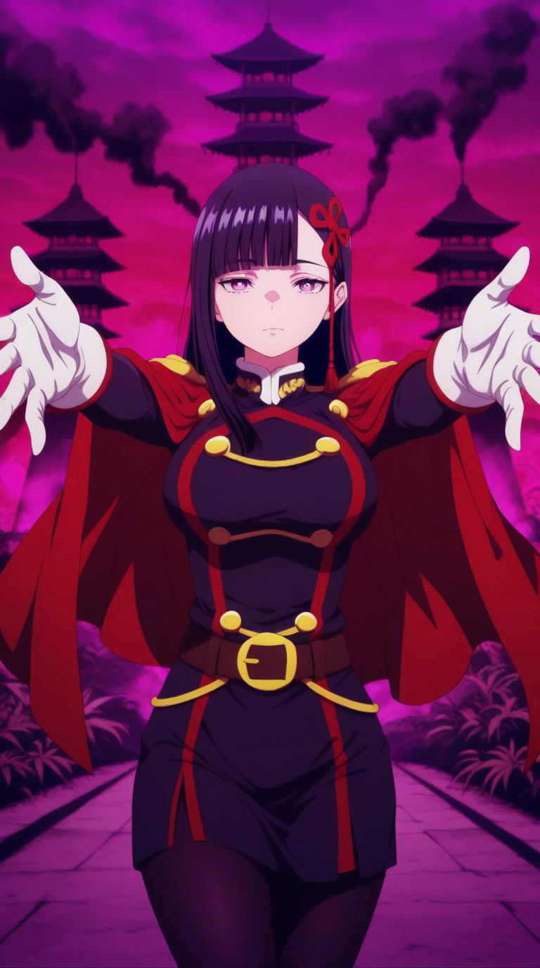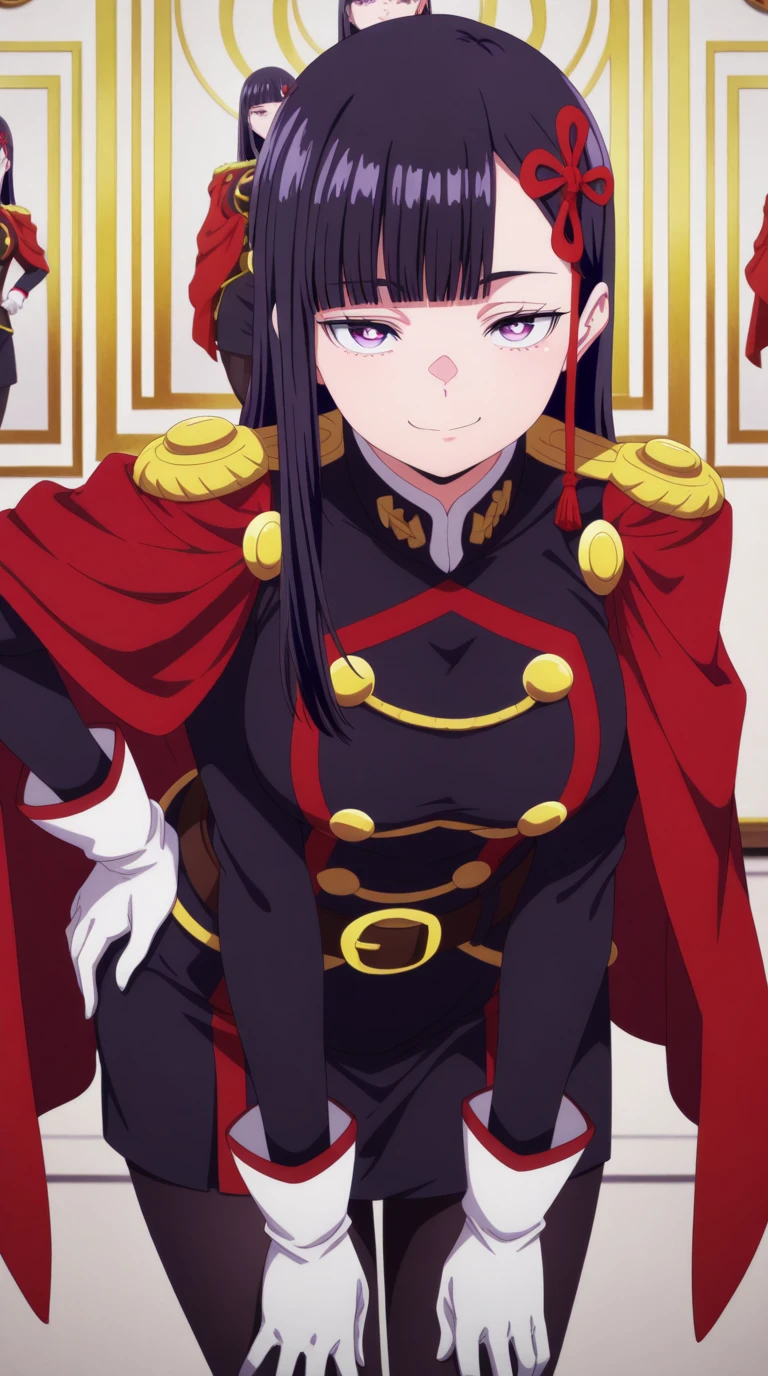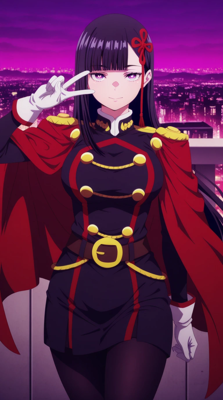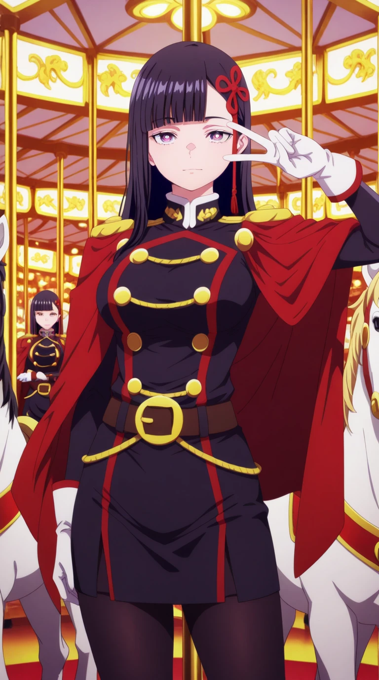 gloves, pantyhose, white gloves, uniform, black pantyhose, military uniform, belt, cape, red cape, epaulettes